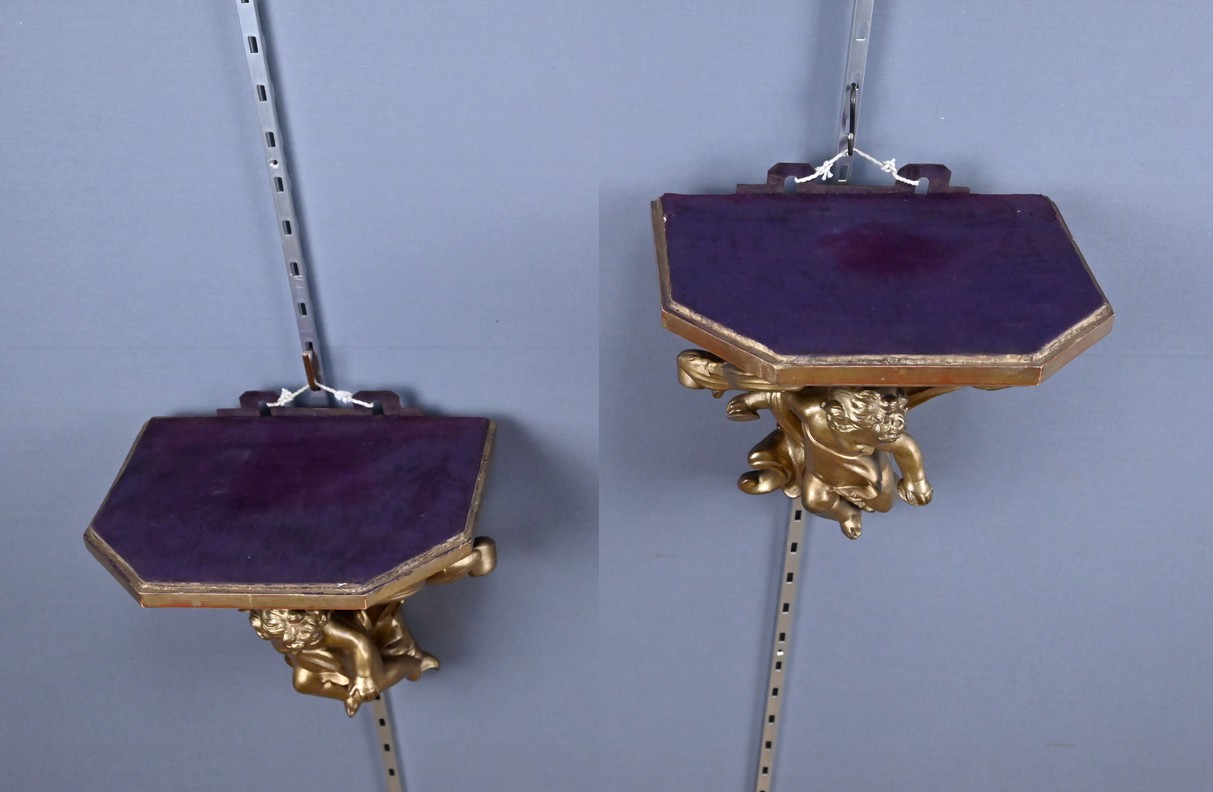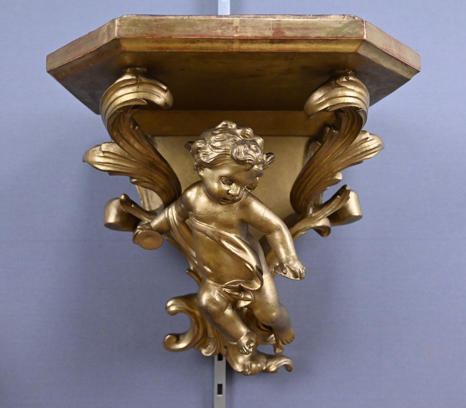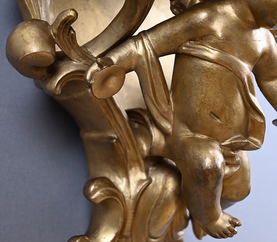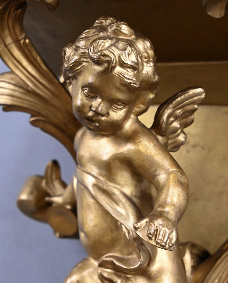 Autour des angelots s’enroulent de larges feuilles d’acanthe, profondément découpées, dont les volutes viennent rythmer la silhouette de chaque console. La dorure chaleureuse souligne les reliefs et capte la lumière avec éclat, révélant un travail de ciselure soigné et une patine harmonieuse qui témoigne du temps sans nuire à la lisibilité des détails.