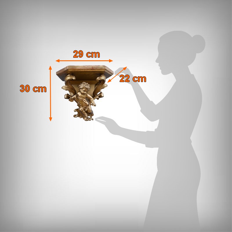 Cette élégante paire de consoles d’applique en bois et stuc doré déploie son style baroque avec une générosité de formes et une finesse d’exécution qui en font de véritables sculptures murales. Chacune est soutenue par un putto drapé, modelé avec une douceur de traits et un mouvement souple du corps. Les visages ronds, les mèches bouclées et les drapés fluides confèrent à ces figures une présence tendre et théâtrale, typique des ornements destinés aux intérieurs raffinés.