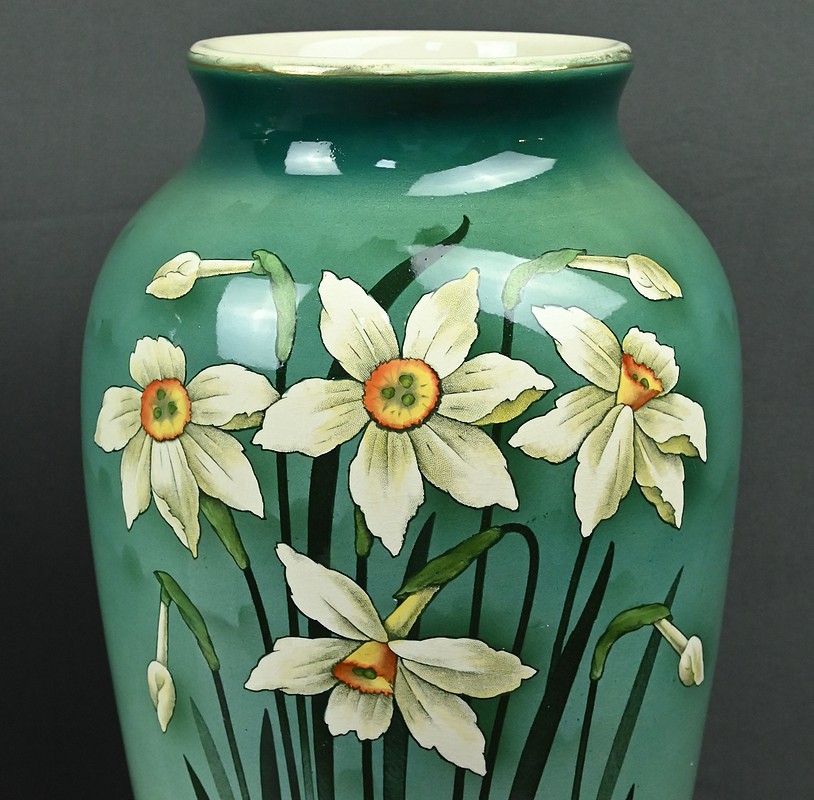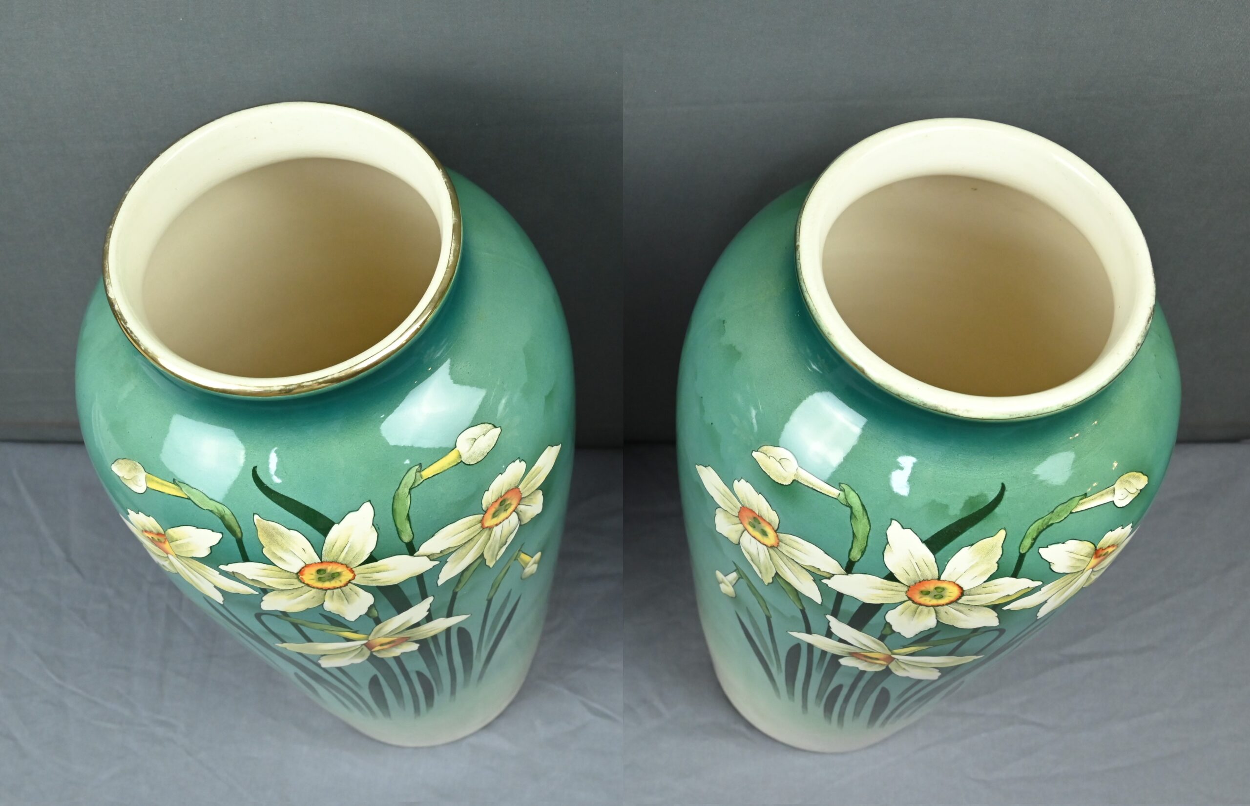Chaque vase présente une silhouette élancée et harmonieuse, avec une base légèrement évasée qui s’affine vers le col, mettant en valeur le décor. Sur le fond dégradé allant du vert émeraude au blanc ivoire, se détache un motif de jonquilles aux pétales clairs et au cœurs jaunes orangés, accompagnés de longues tiges et feuilles vertes. Le style est naturaliste, typique de l’Art Nouveau, avec une attention particulière portée aux détails botaniques. Ce décor est peint sous l’émail donnant aux couleurs leur éclat et leur profondeur. La faïence utilisée est fine et parfaitement cuite, témoignant de la qualité des productions de Fives-Lille.