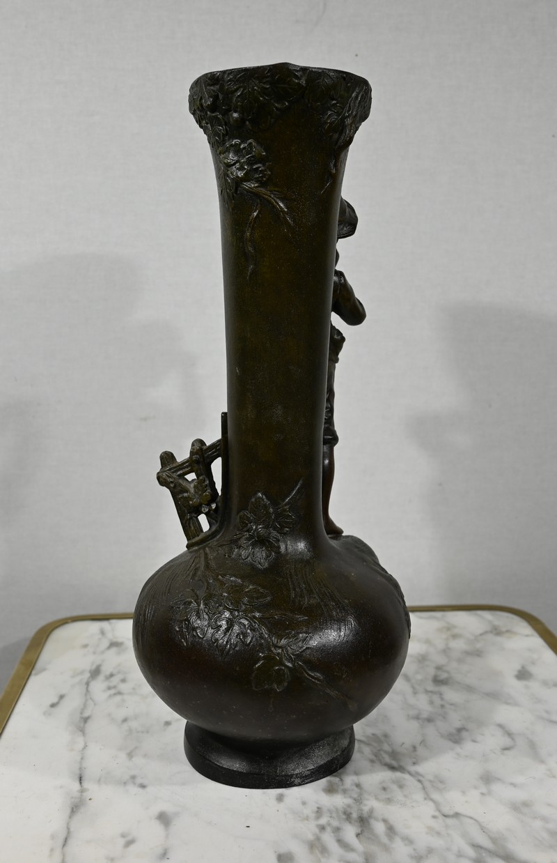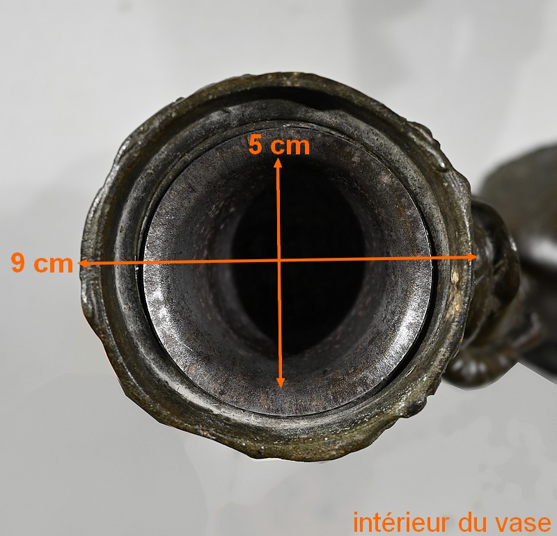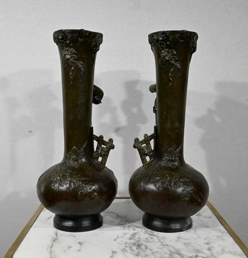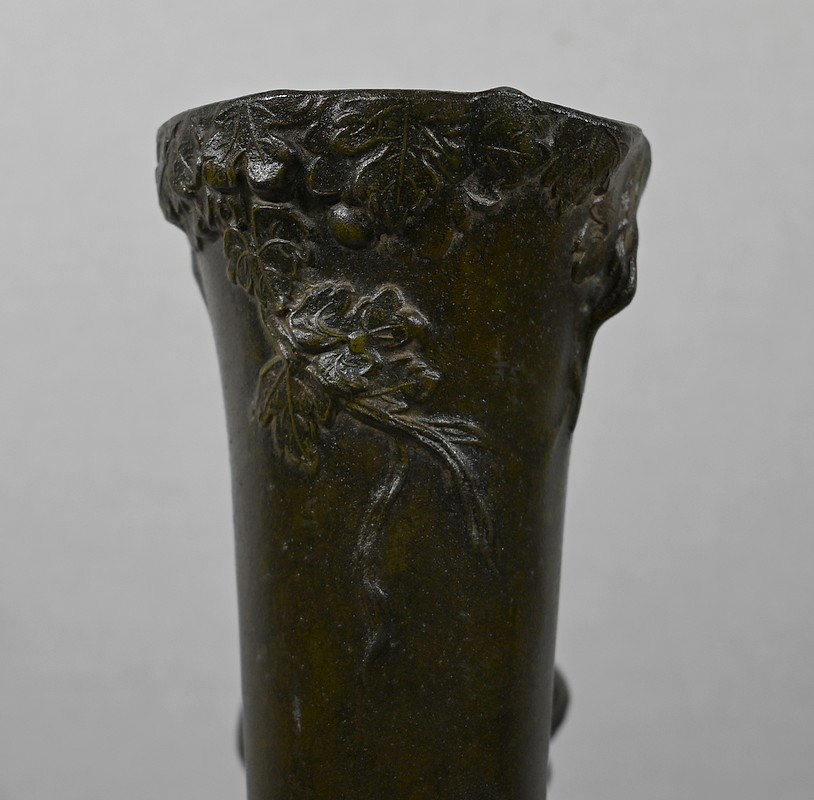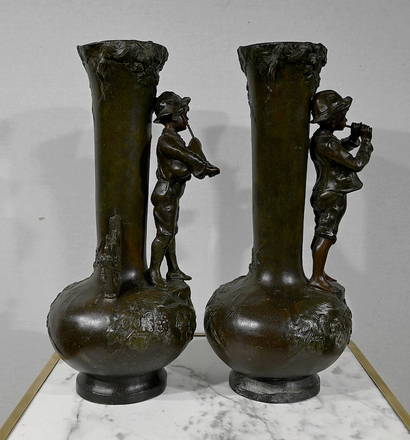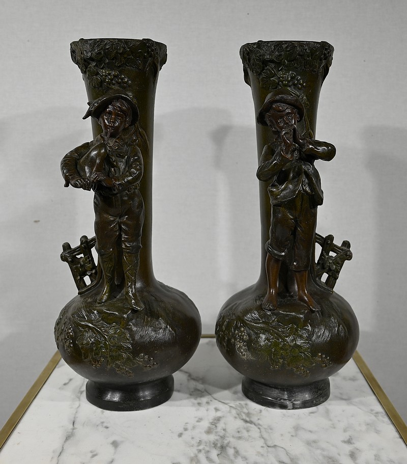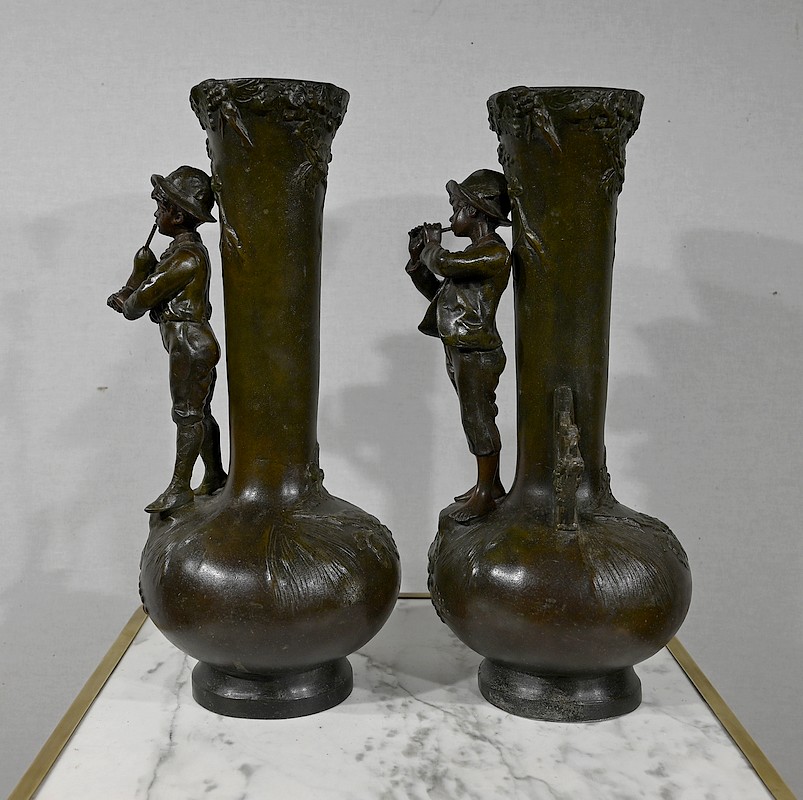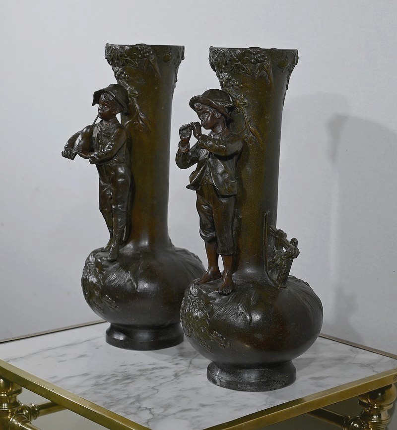 Jolis vases en régule à double patine, verte et brune, dans l’esprit des œuvres d’Auguste Moreau.