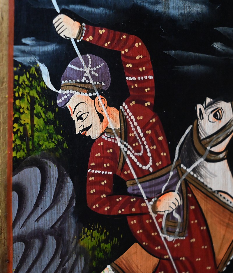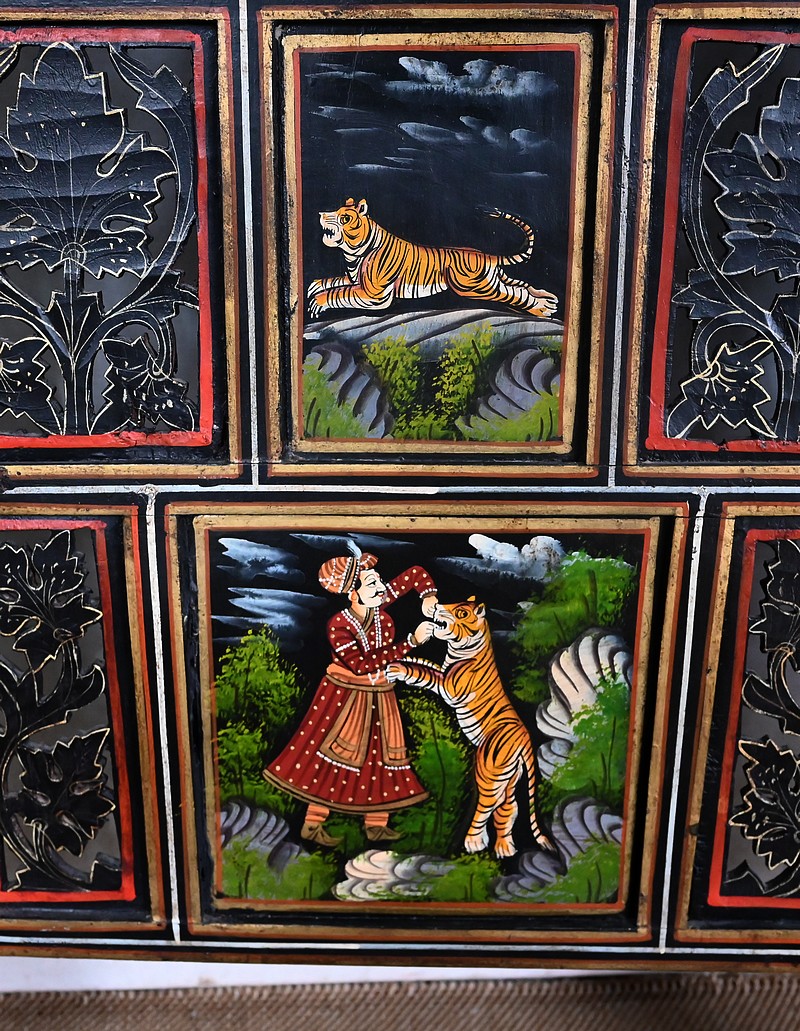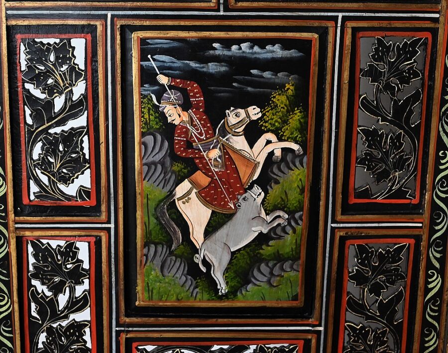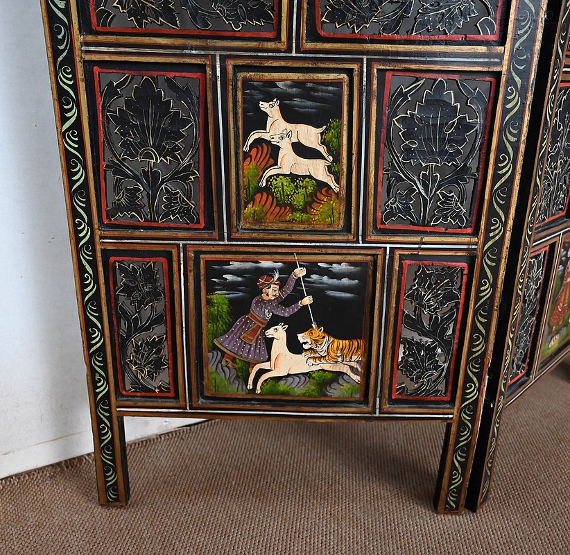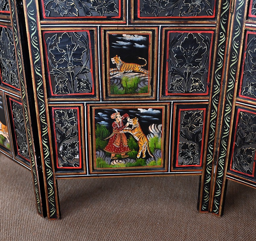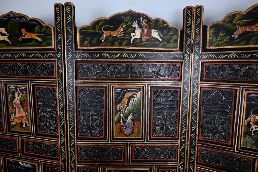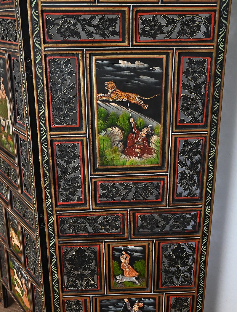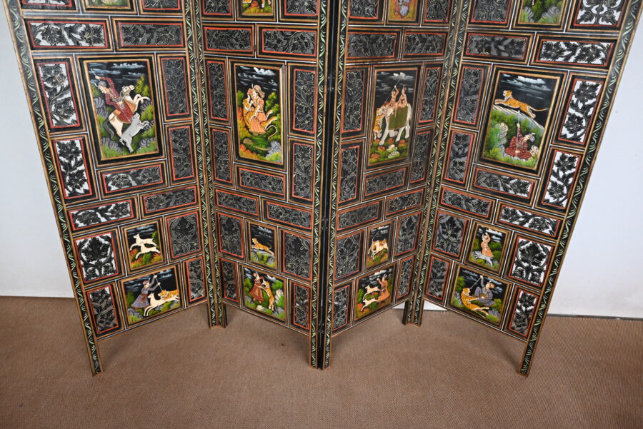 Grand paravent double-face en bois peint, réalisé par des maîtres artisans indiens du Rajasthan, au début du XXème siècle.