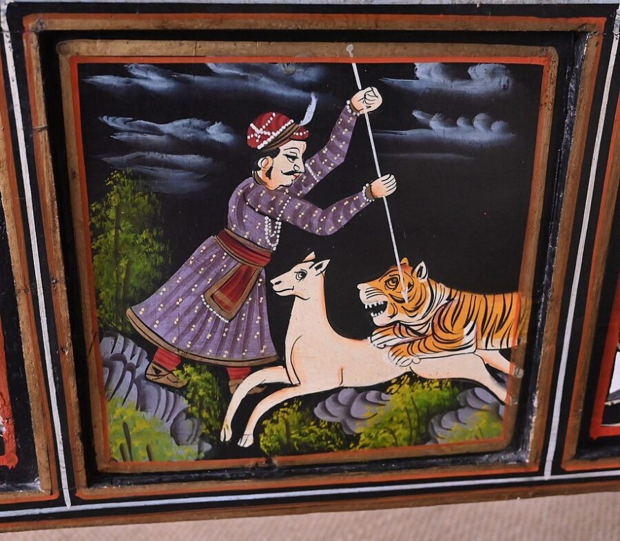 Celles-ci représentent des scènes de chasse au tigre. Des hommes en habits traditionnels sont équipés de lances et d’épées. Ils luttent parfois à mains nues ou à dos d’éléphant afin de tuer l’animal sauvage.