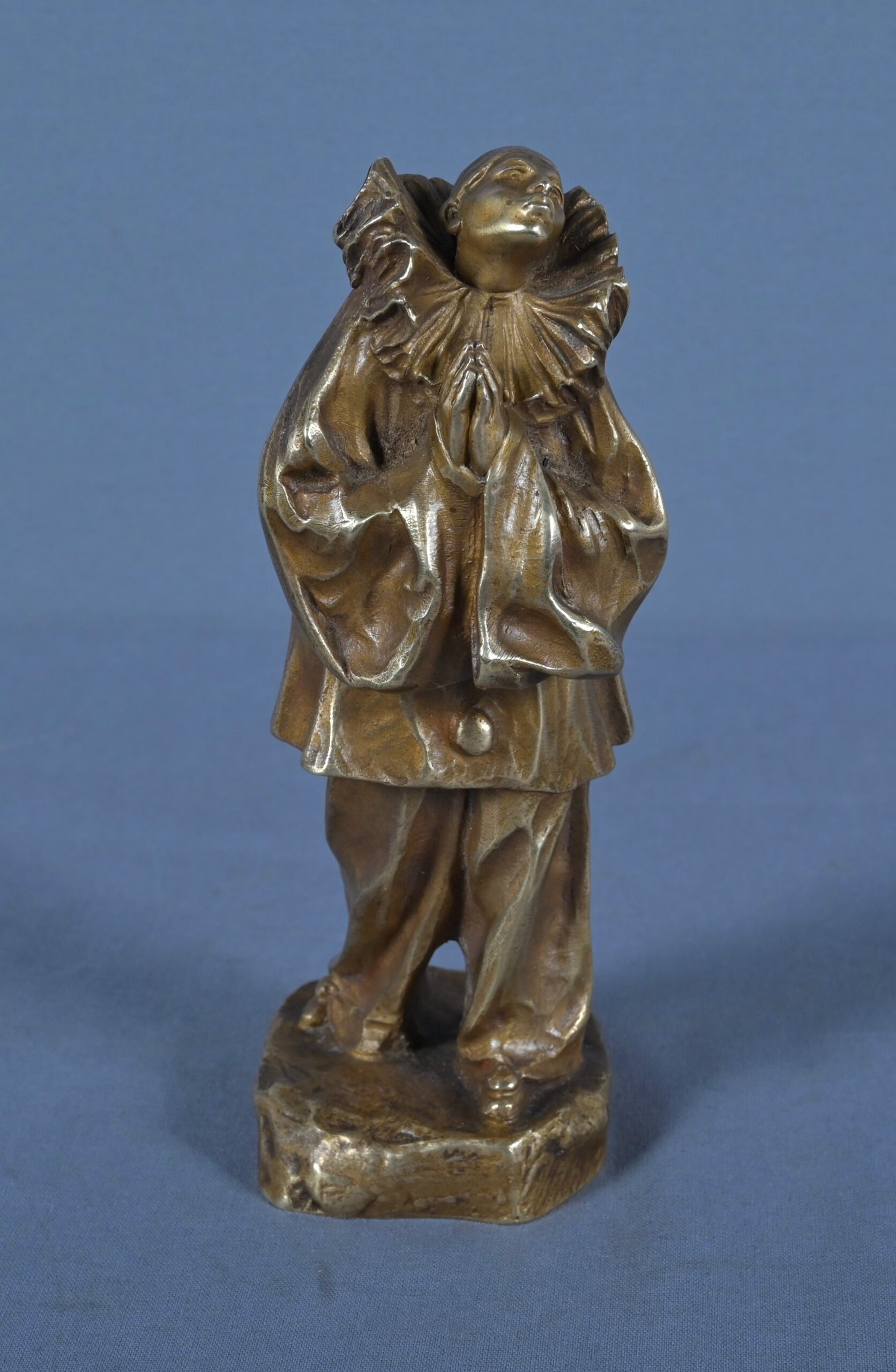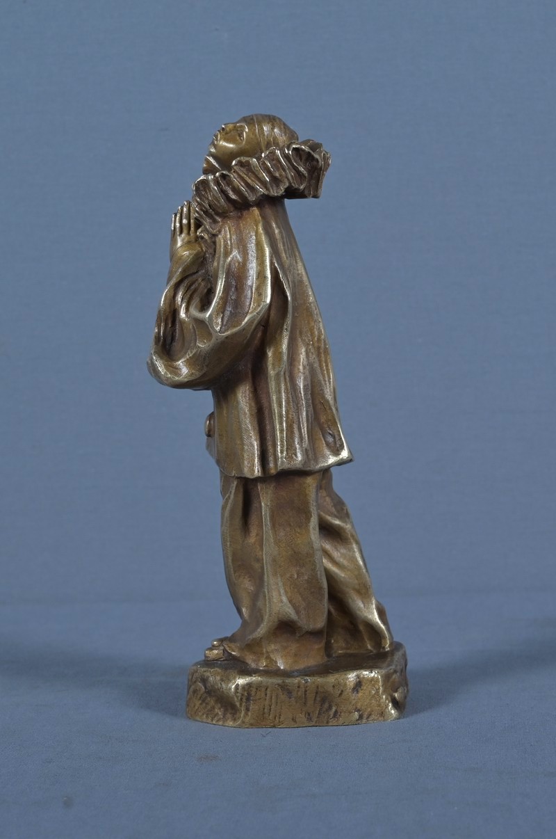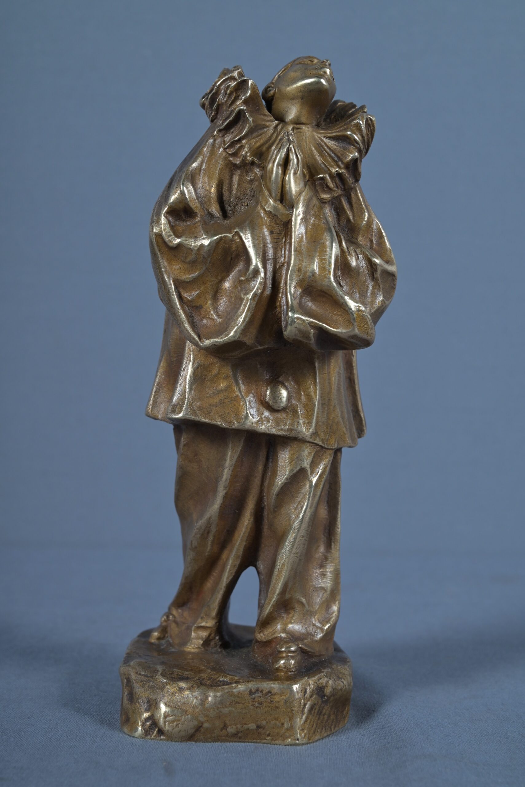 Le personnage est vêtu de son costume traditionnel : large collerette godronnée, manches bouffantes et pantalon ample, finement ciselés pour restituer le mouvement souple des étoffes. Les mains jointes, la tête légèrement inclinée vers le ciel, Pierrot semble perdu dans ses pensées dans une rêverie silencieuse, évoquant la solitude douce des artistes.