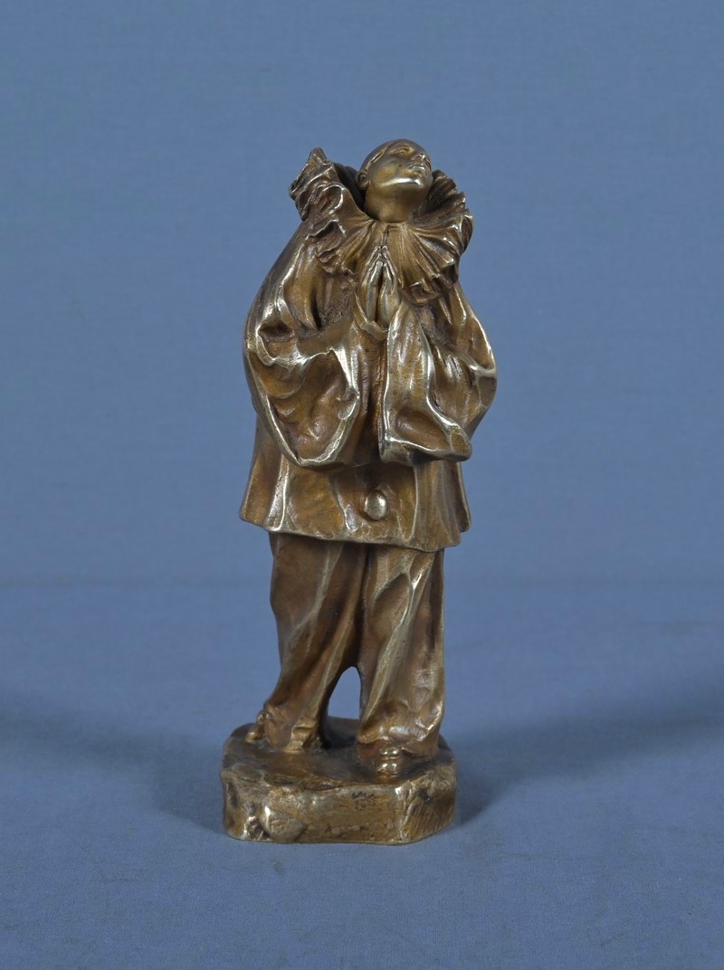 Émouvant petit bronze figurant Pierrot, personnage emblématique de la commedia dell’arte, représenté dans une posture introspective et poétique. Le sculpteur Louis Alliot capture ici toute la mélancolie et la tendresse du célèbre saltimbanque.