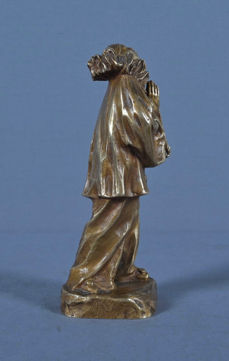 Ce petit bronze, signé sur la terrasse, témoigne du goût Belle Époque pour les figures théâtrales et les sujets empreints de sensibilité. Il s’inscrit dans la veine des sculptures décoratives de salon, à la fois accessibles et raffinées, où l’émotion se mêle à la virtuosité technique.