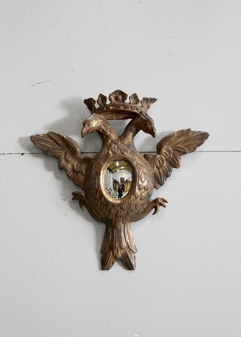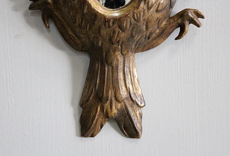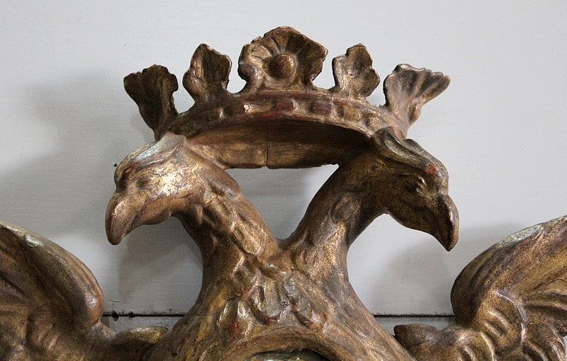 Il est enchâssé dans un cadre en bois découpé et sculpté représentant un aigle à 2 têtes aux ailes déployées et surmonté d’une couronne.