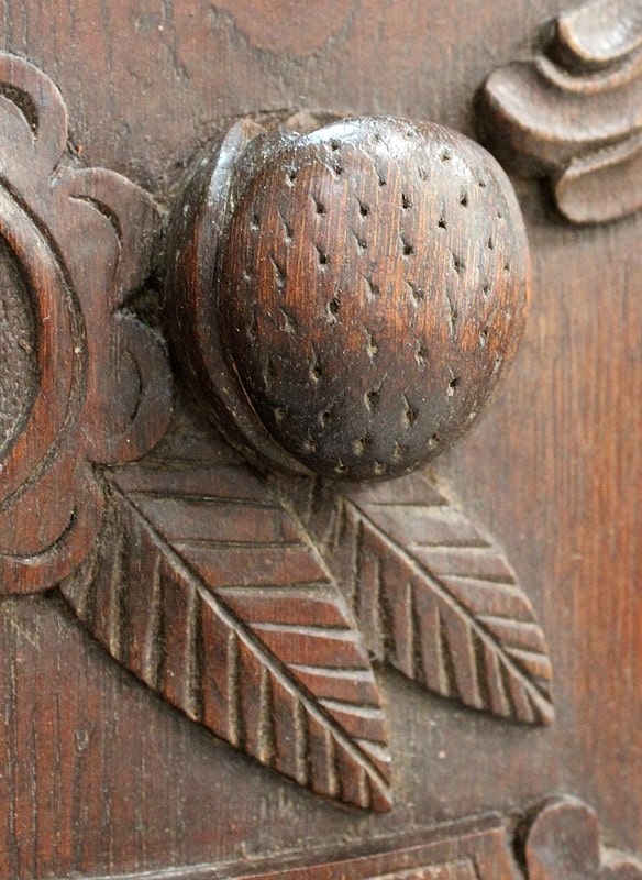 Trois paires de motifs en reliefs, disposées en symétrie, ornent également ce curieux objet. L’une d’elle représente certainement des fruits à coques, qui se révèlent être creux.