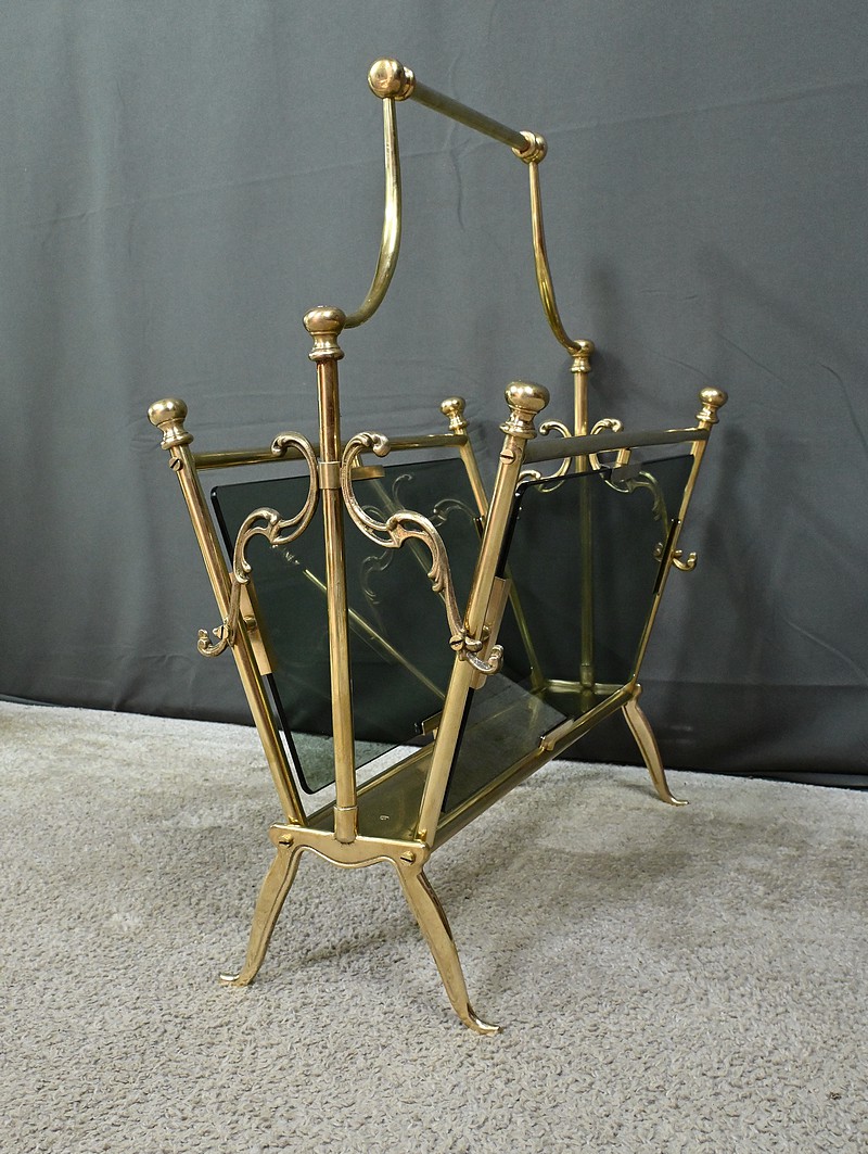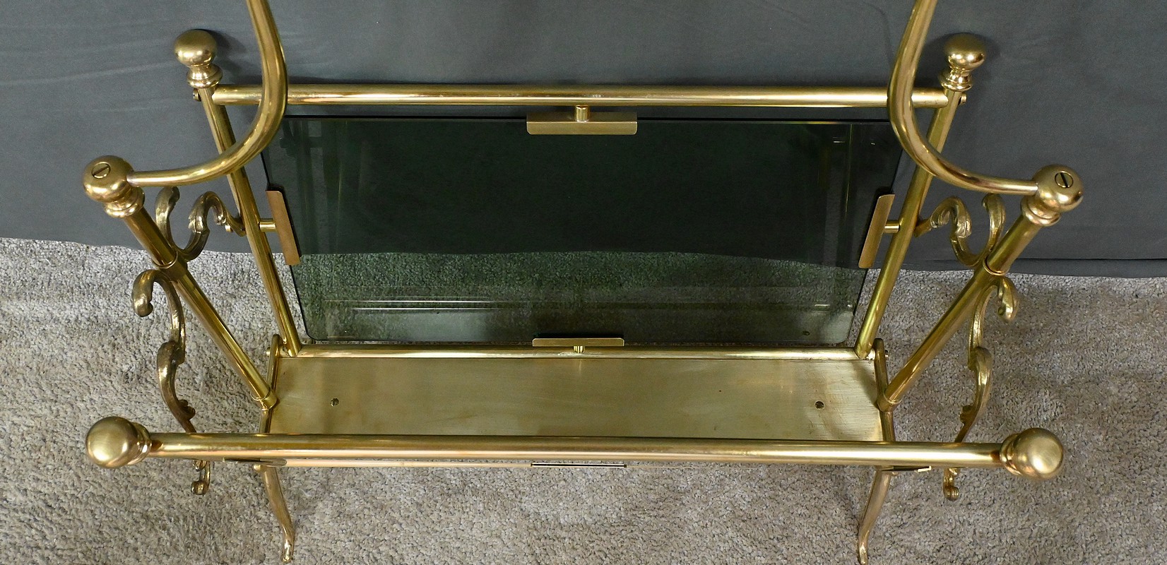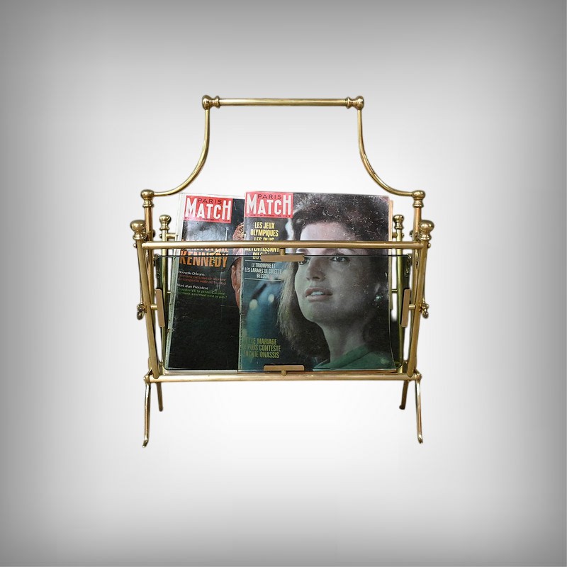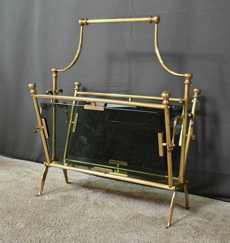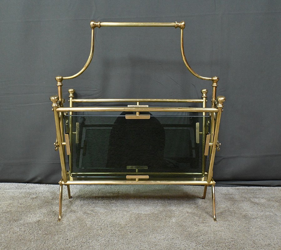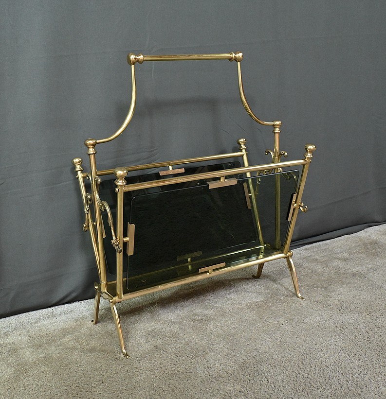 Ce porte-revues vintage incarne l’élégance et le raffinement du design des années 1960. Sa structure en laiton doré, finement travaillée, lui confère une allure chic et intemporelle. Les panneaux latéraux en verre fumé laissent entrevoir le contenu avec subtilité. La poignée supérieure permet de déplacer ce porte-revues facilement, tout en soulignant son aspect pratique. Les pieds inclinés assurent une excellente stabilité et apportent une dynamique visuelle à l’ensemble. Ce porte-revues est idéal pour organiser magazines, journaux ou livres tout en décorant avec goût un salon, un bureau ou une bibliothèque. Son style mid-century sophistiqué, en fait une pièce décorative recherchée par les amateurs de mobilier vintage. Il s’intègre parfaitement dans une ambiance rétro, classique ou même contemporaine, en apportant une note chaleureuse et élégante.