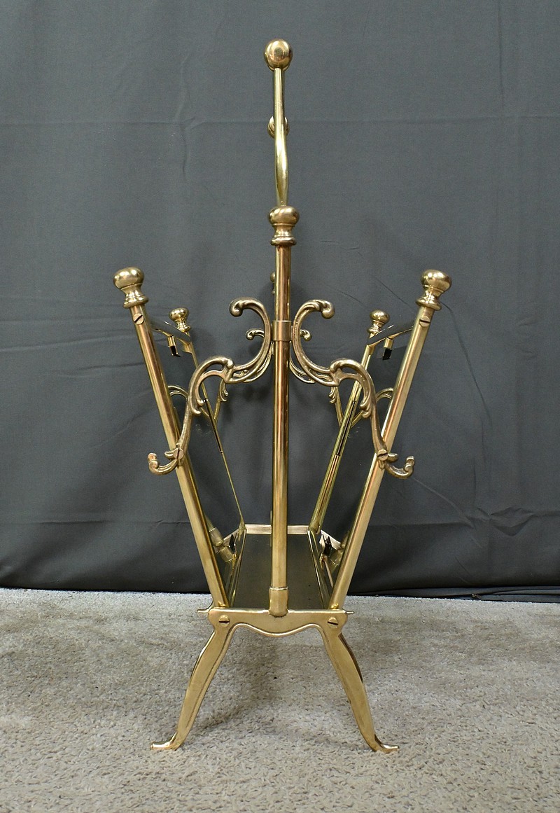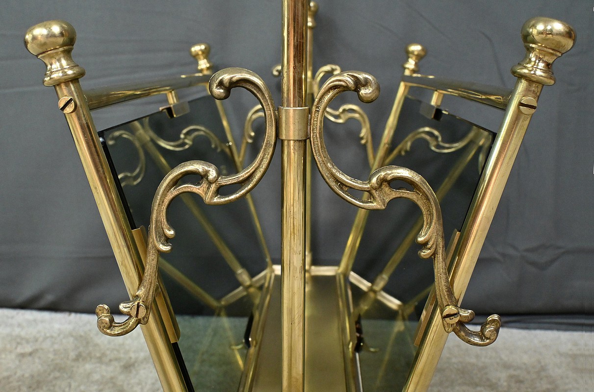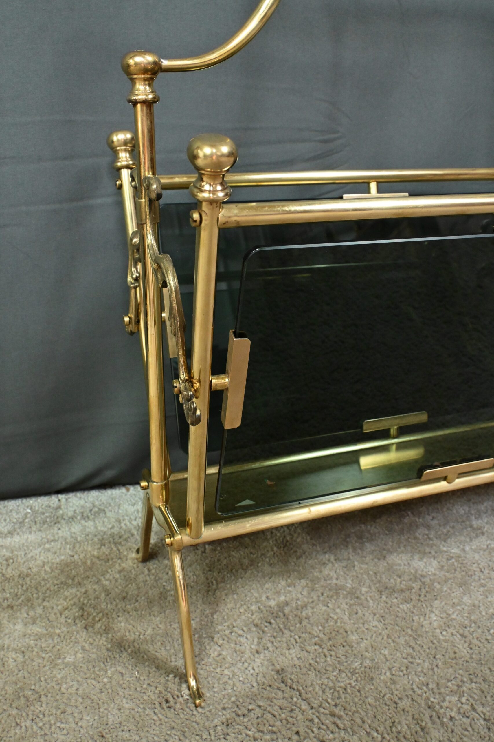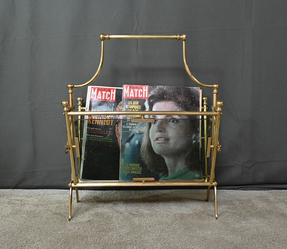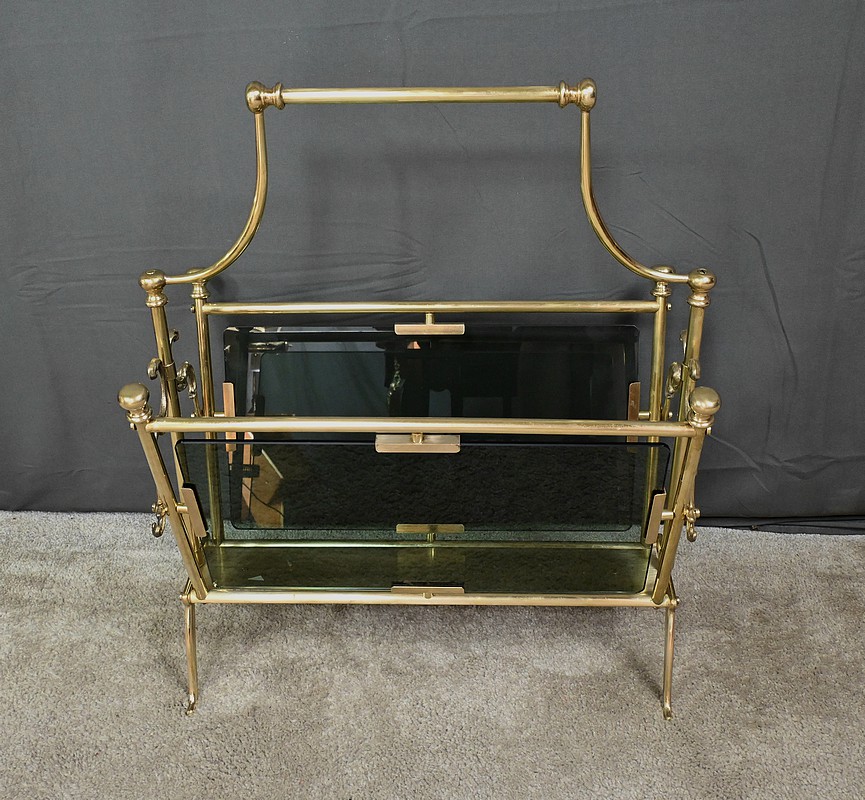 Ce porte-revues vintage incarne l’élégance et le raffinement du design des années 1960. Sa structure en laiton doré, finement travaillée, lui confère une allure chic et intemporelle. Les panneaux latéraux en verre fumé laissent entrevoir le contenu avec subtilité. La poignée supérieure permet de déplacer ce porte-revues facilement, tout en soulignant son aspect pratique. Les pieds inclinés assurent une excellente stabilité et apportent une dynamique visuelle à l’ensemble. Ce porte-revues est idéal pour organiser magazines, journaux ou livres tout en décorant avec goût un salon, un bureau ou une bibliothèque. Son style mid-century sophistiqué, en fait une pièce décorative recherchée par les amateurs de mobilier vintage. Il s’intègre parfaitement dans une ambiance rétro, classique ou même contemporaine, en apportant une note chaleureuse et élégante.