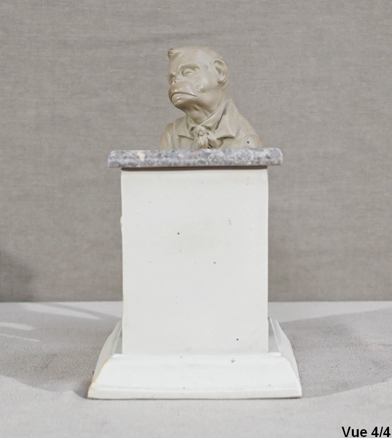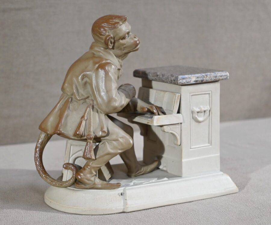 Cette œuvre proposée à l’époque en différentes déclinaisons, telles qu’en biscuit, grès, majolique ou parian, est ici réalisée en grès pour le singe et biscuit pour le piano.