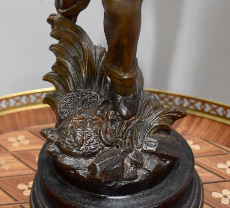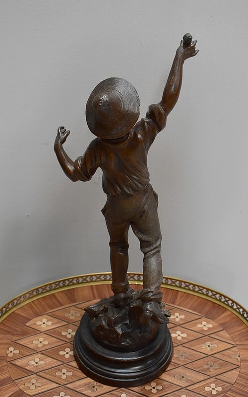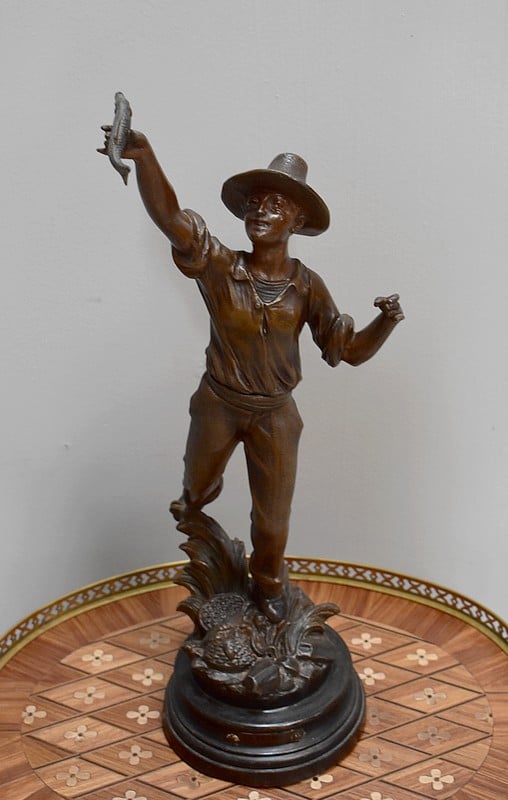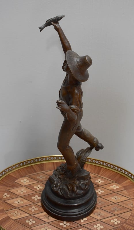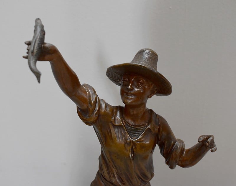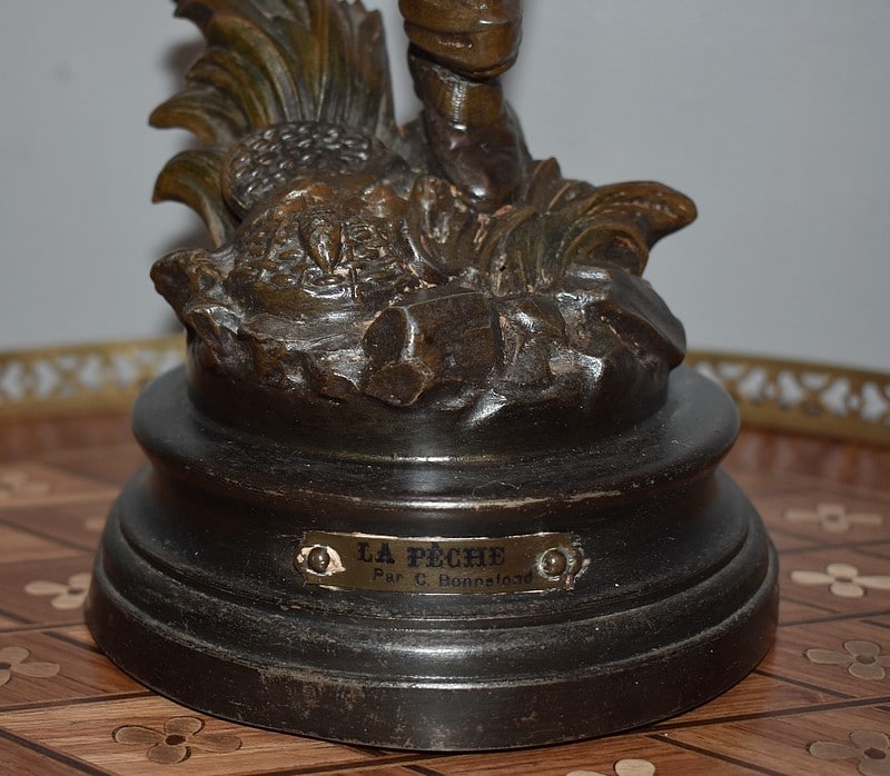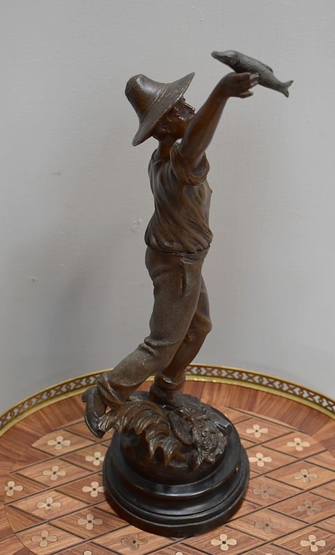 Régule à patine brune représentant un jeune homme brandissant un poisson et intitulé ‘LA PECHE Par C. Bonnefond’.