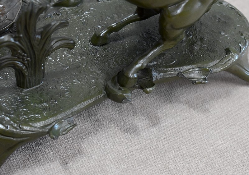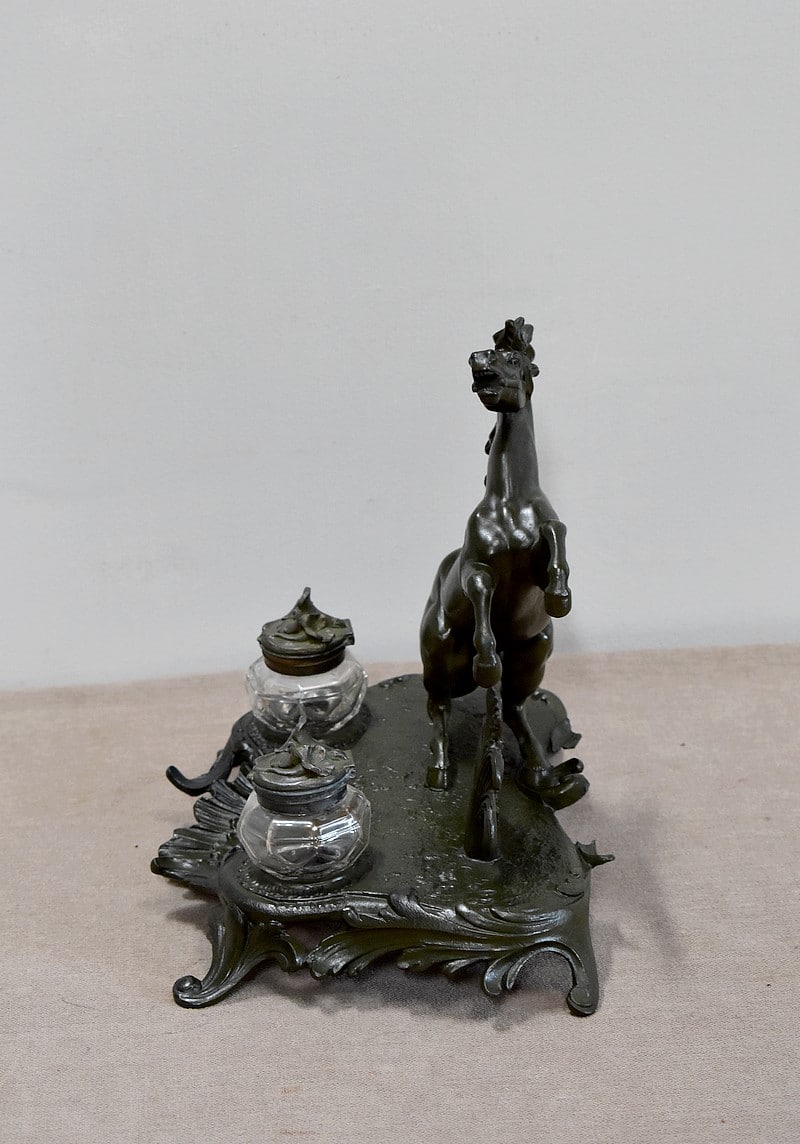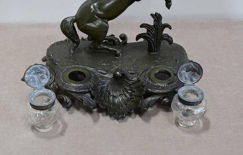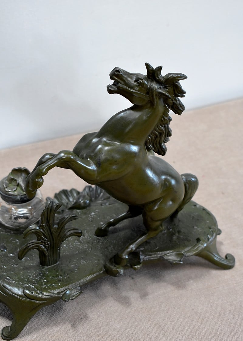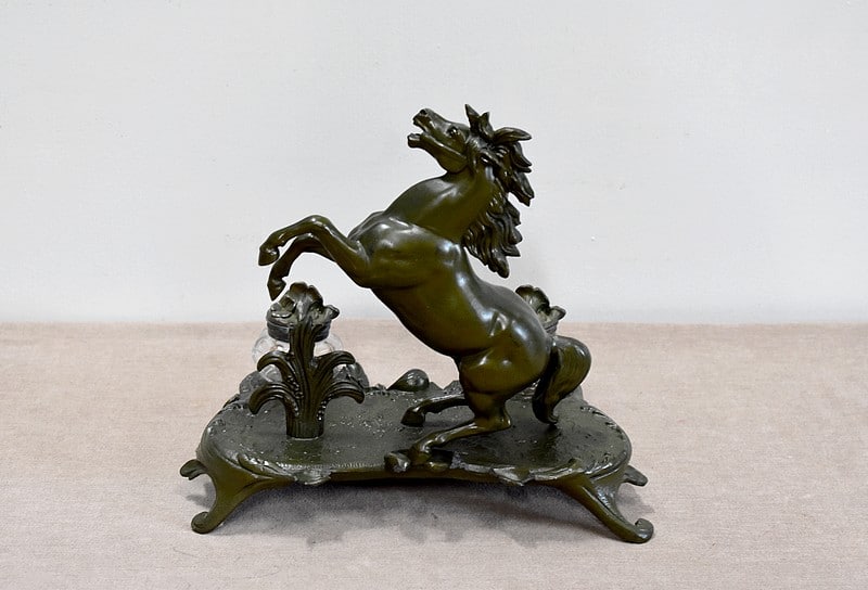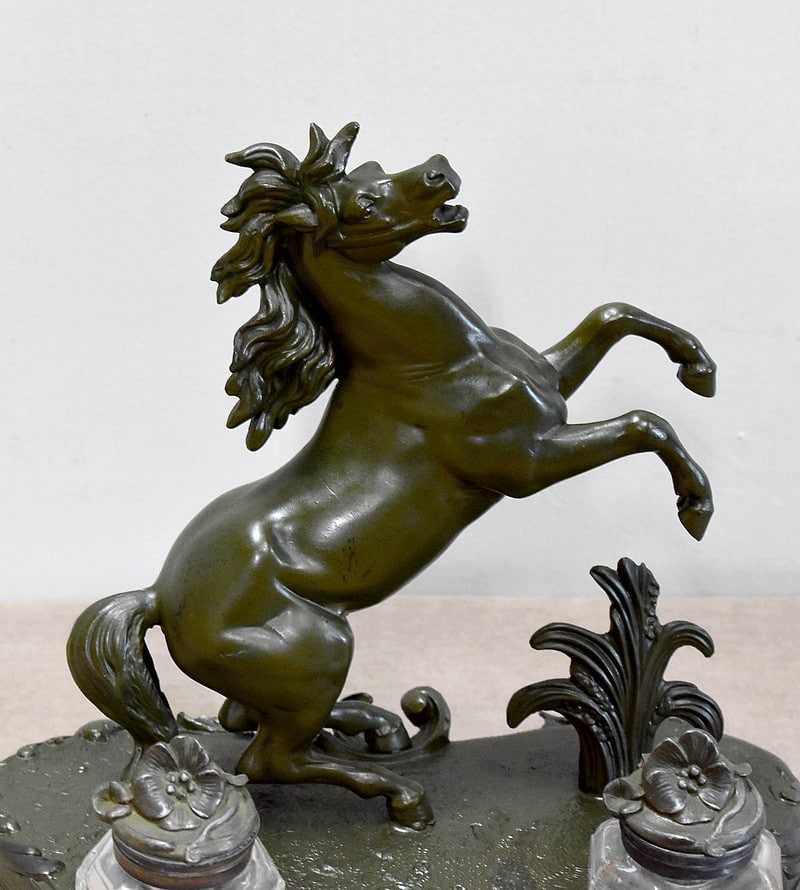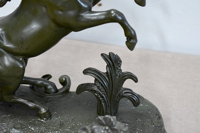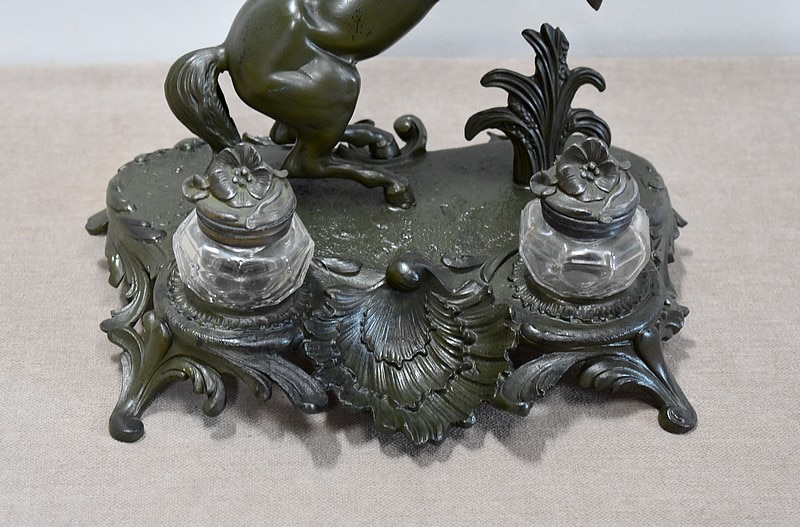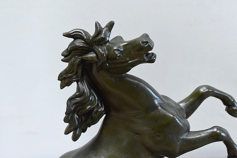Il représente un cheval cabré sur un socle aux forme arrondies orné de rinceaux sur son pourtour et d’un coquillage en façade.