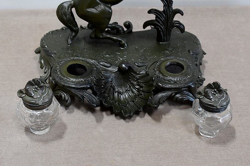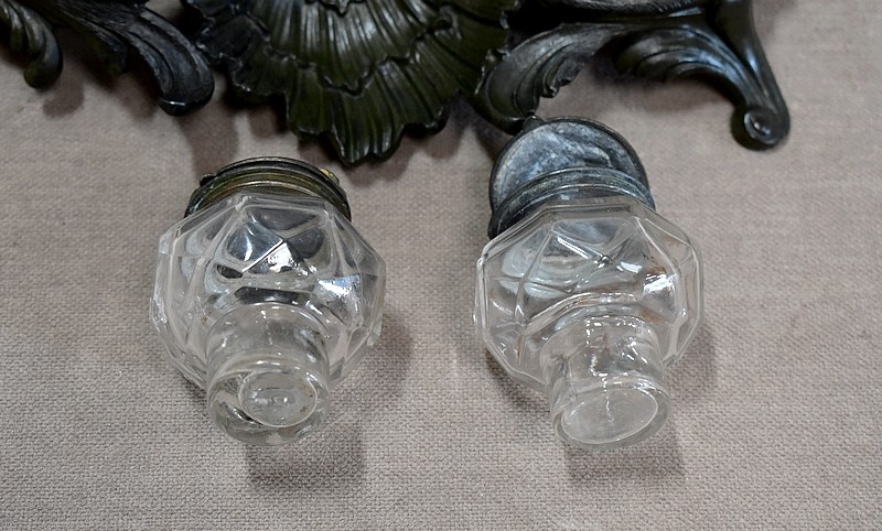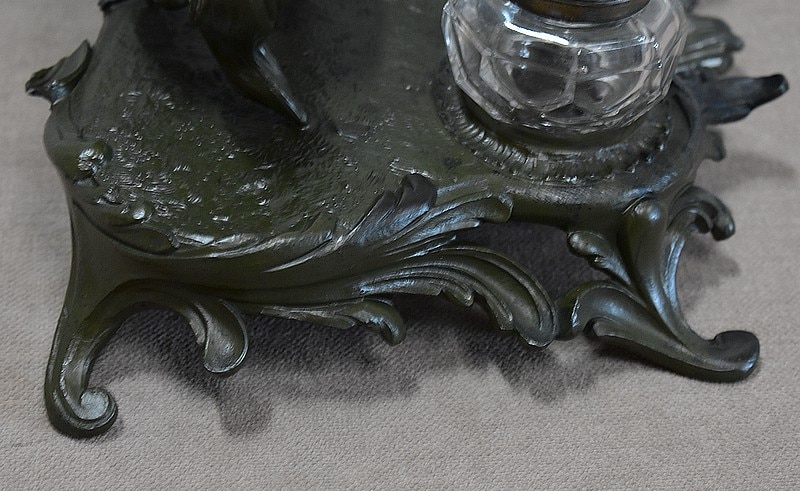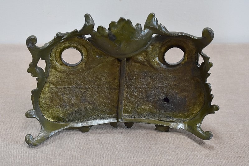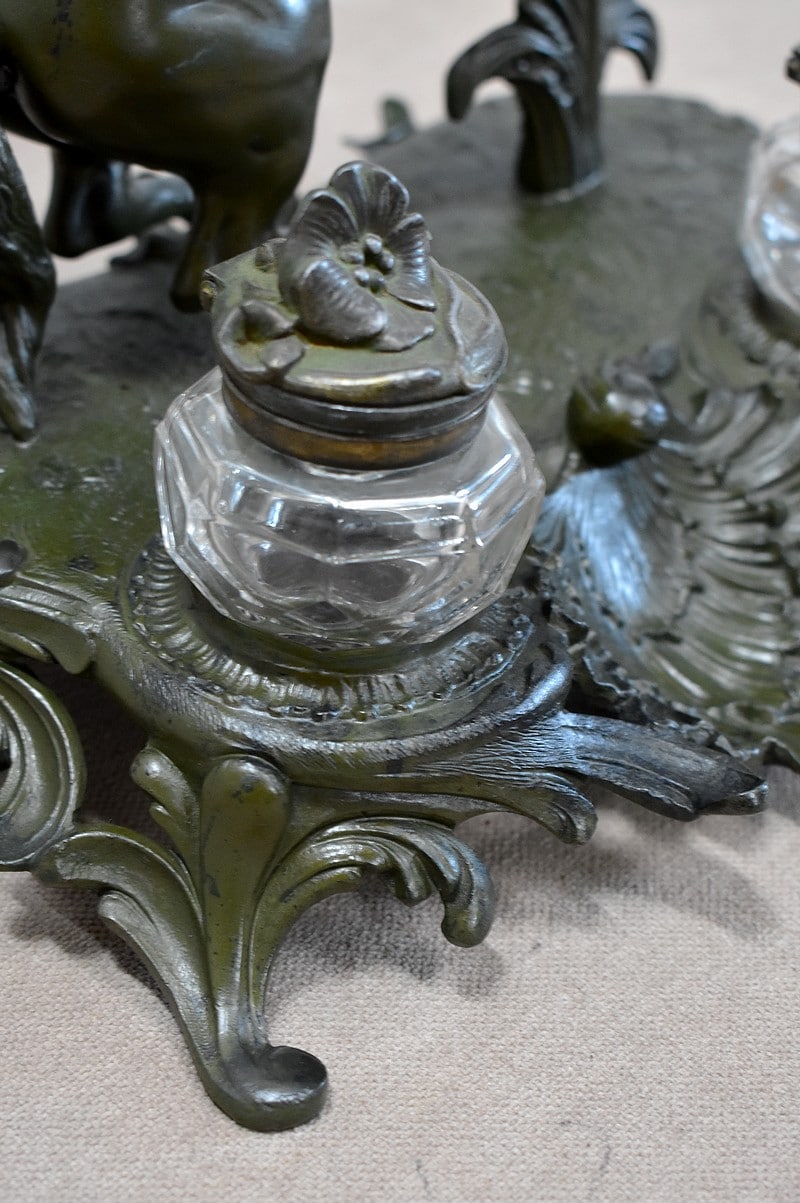 Les encriers qui sont en verre et gravés C.B. sur le fond, ont une forme octogonale avec un pied cylindrique plus petit permettant de les ancrer dans leurs logements. Leurs couvercles en régule sont ornés d’une fleur ouverte.