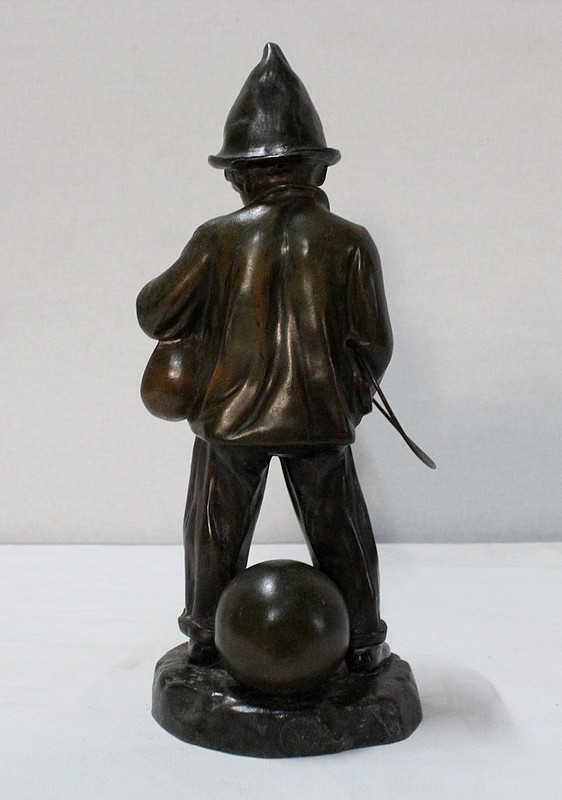 Sculpture en Régule à patine verte signée Georges Demange (1865-1945) représentant un enfant comptant des pièces de monnaie qu’il tient dans la paume de sa main gauche. Vêtu d’un bonnet et de vêtements larges, l’enfant joufflu au visage doux, se tient droit, une mandoline sous le bras gauche et un cerceau sous le bras droit. Derrière lui, un ballon vient s’ajouter à ses accessoires de spectacle.