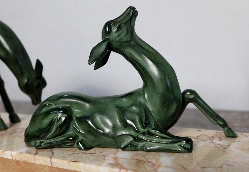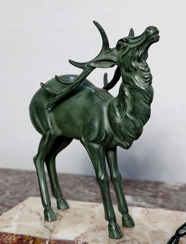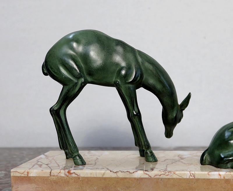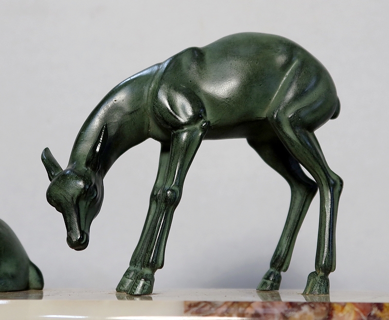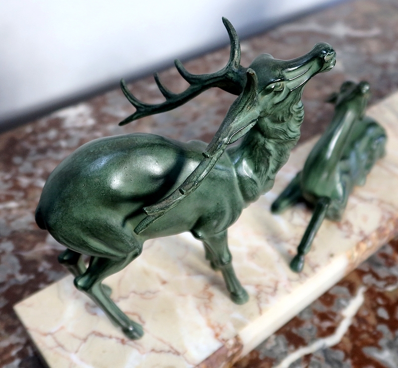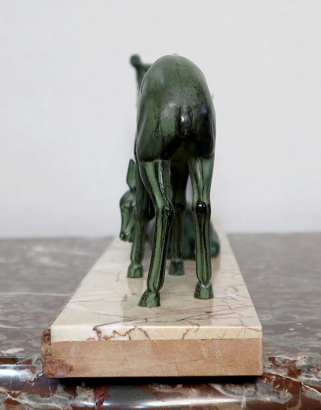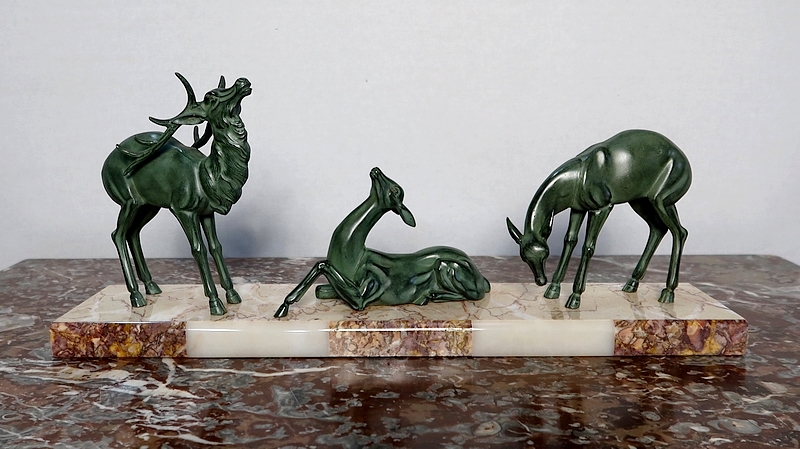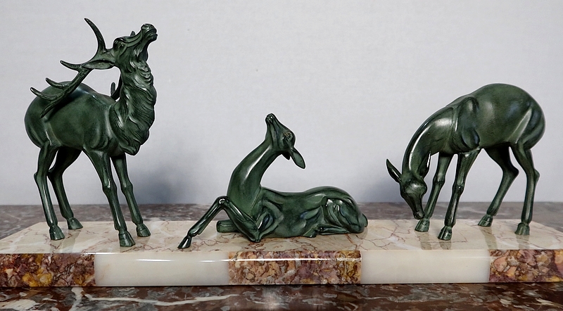 Groupe en régule à patine verte représentant un cerf accompagné de deux biches sur un socle en marbre ocre ceint sur la façade d’une bordure à plaquettes de différents marbres.