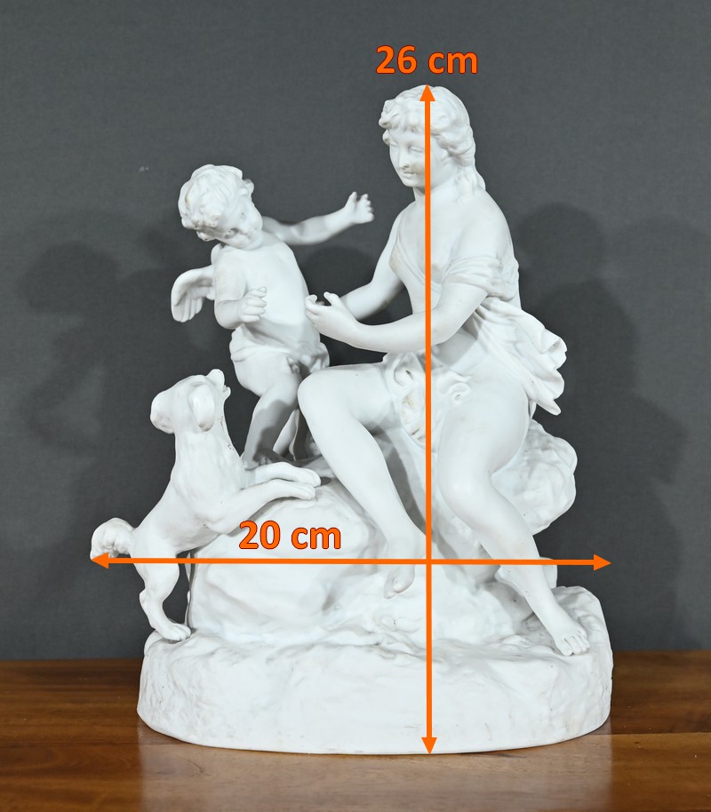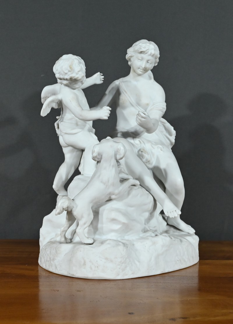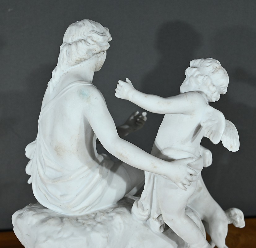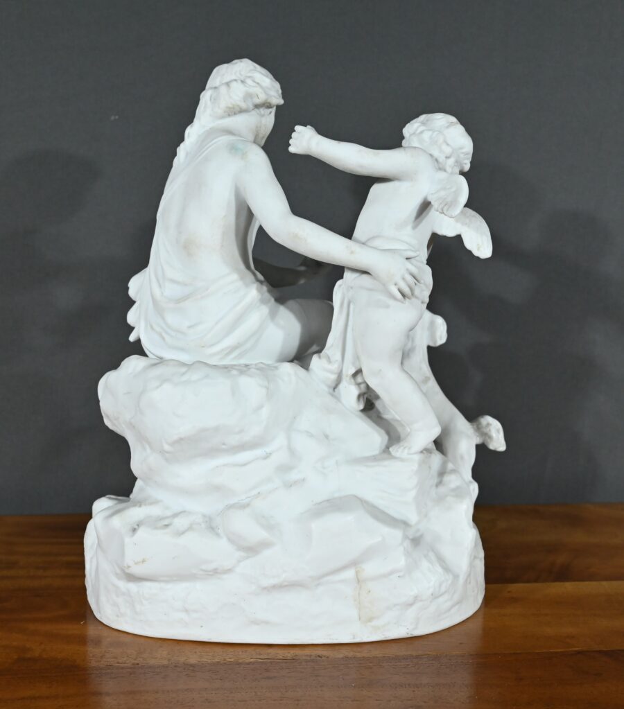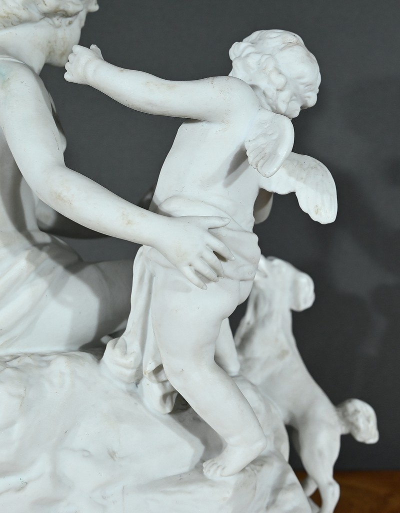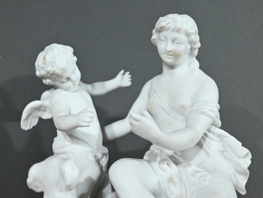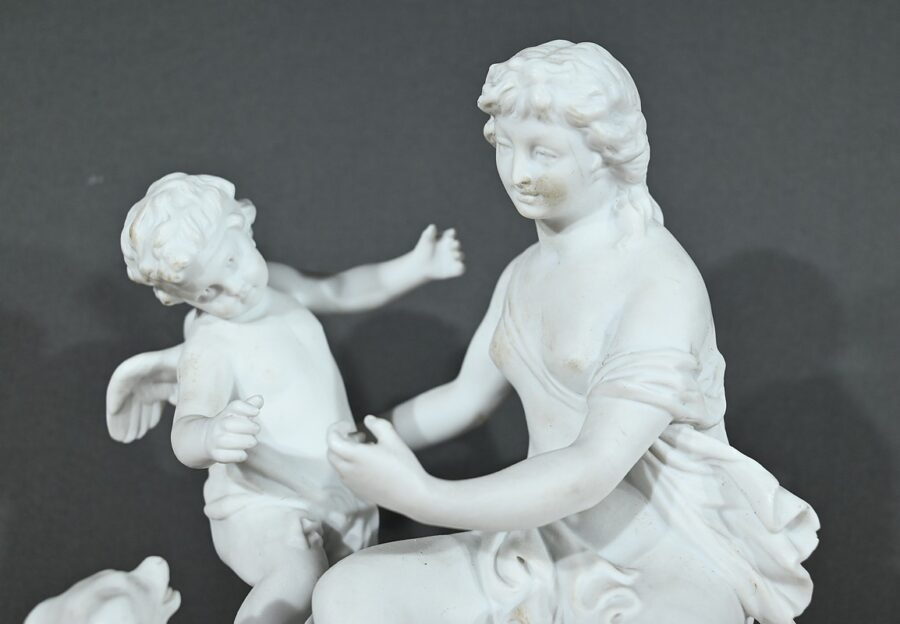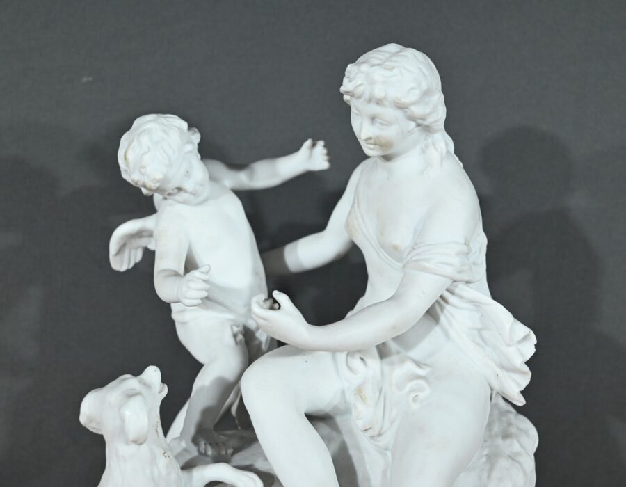 Sculpture à l’antique en porcelaine, représentant Vénus nue assise sur un rocher avec un putti aux ailes déployées à ses côtés. Ces deux personnages, finement réalisés, sont souriants et jouent avec un chien joyeux.