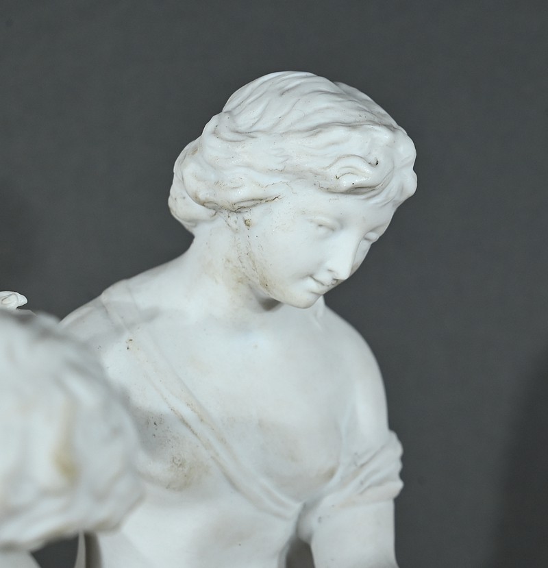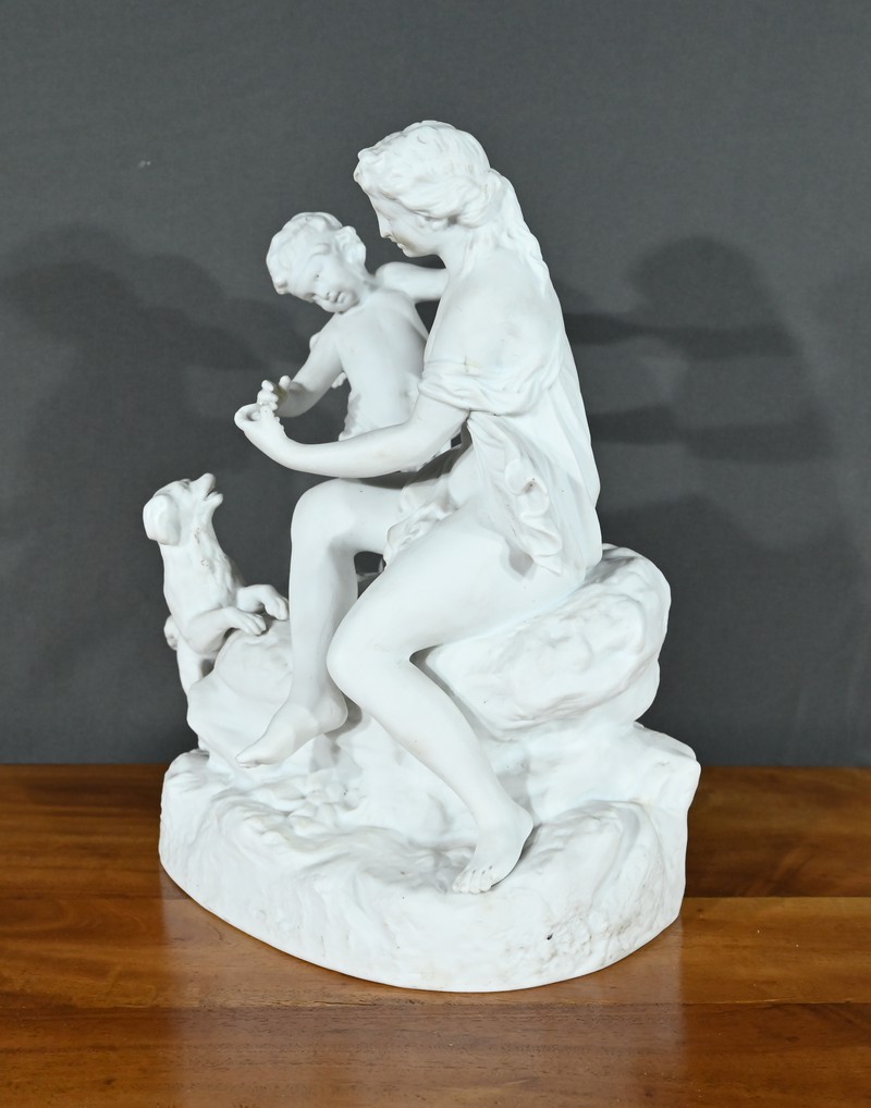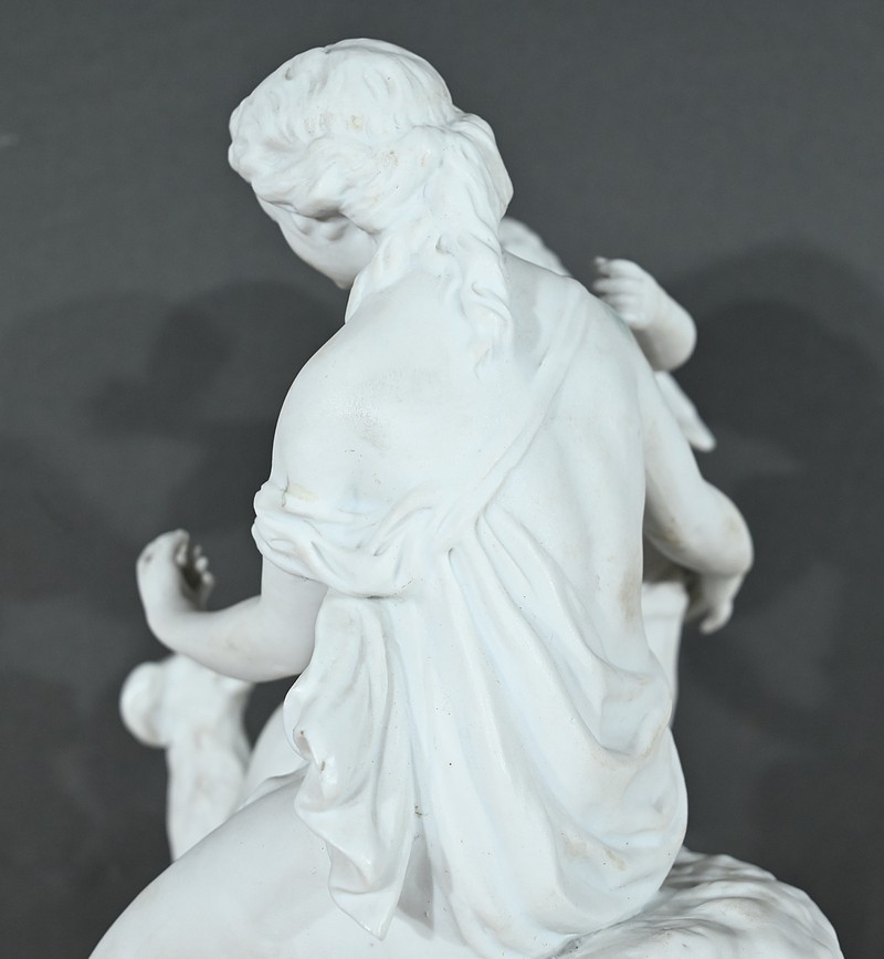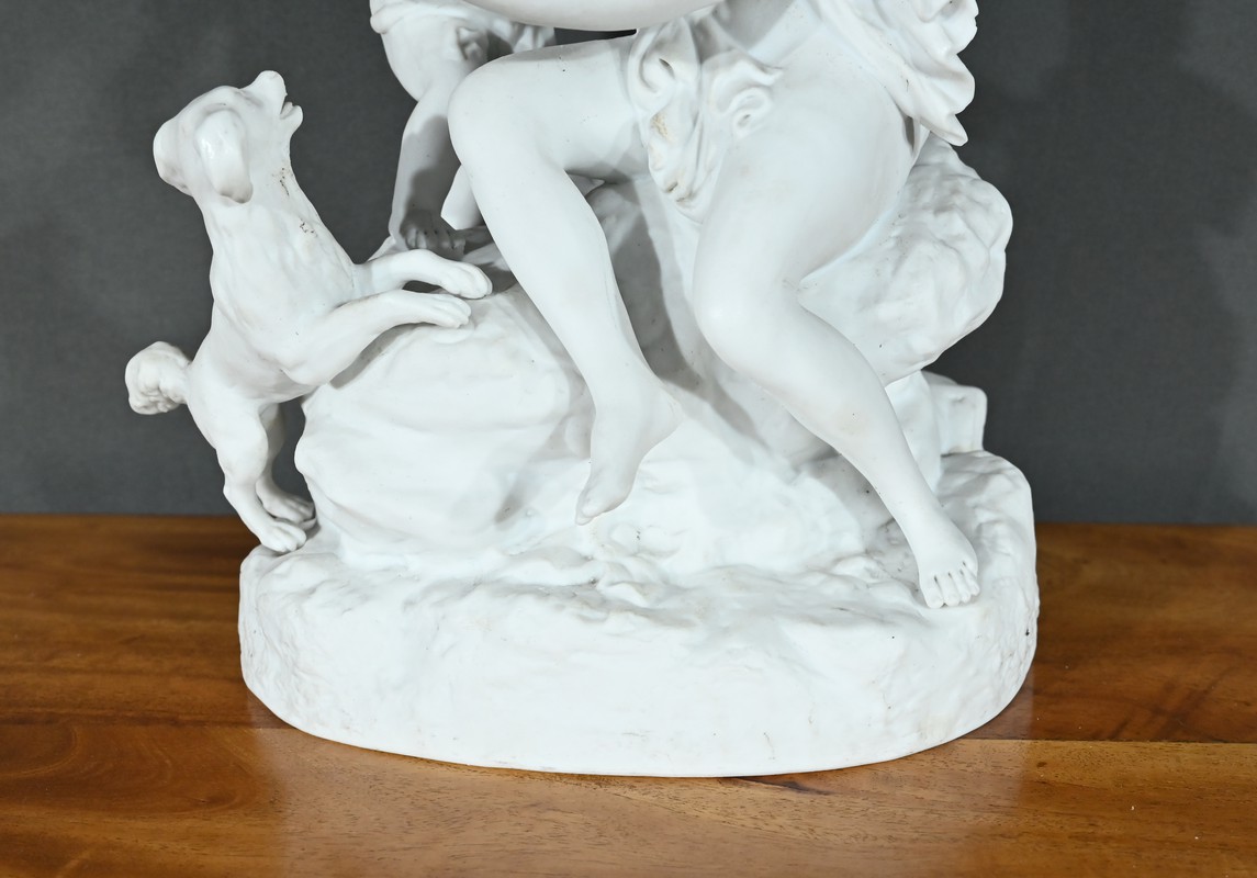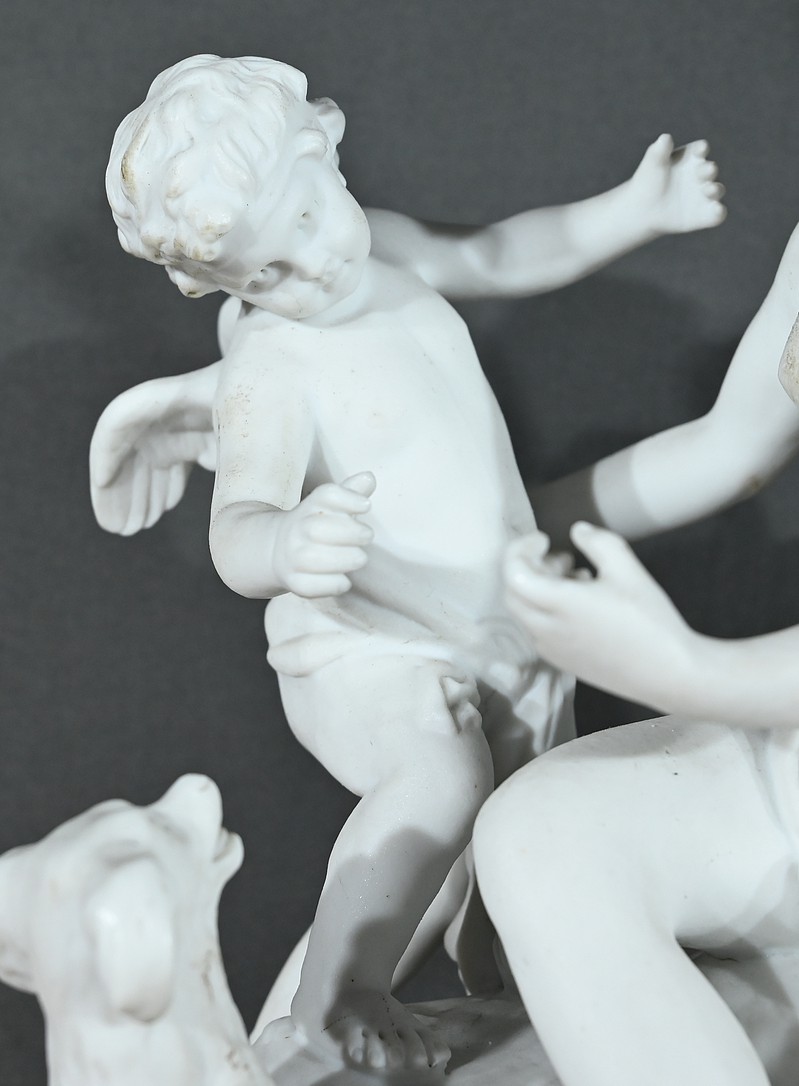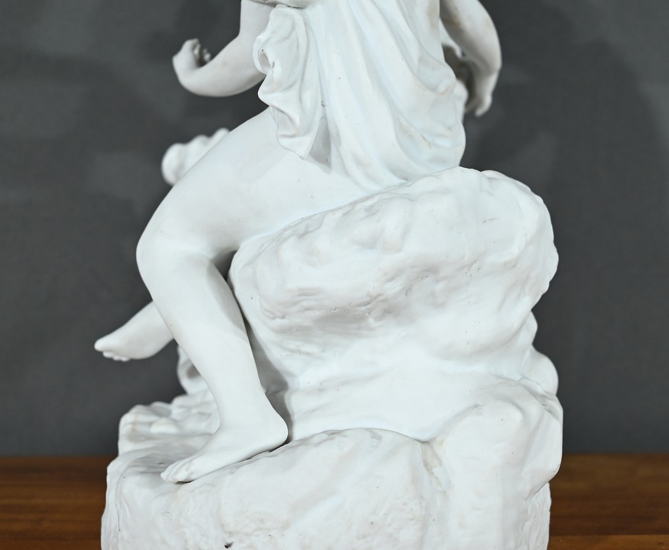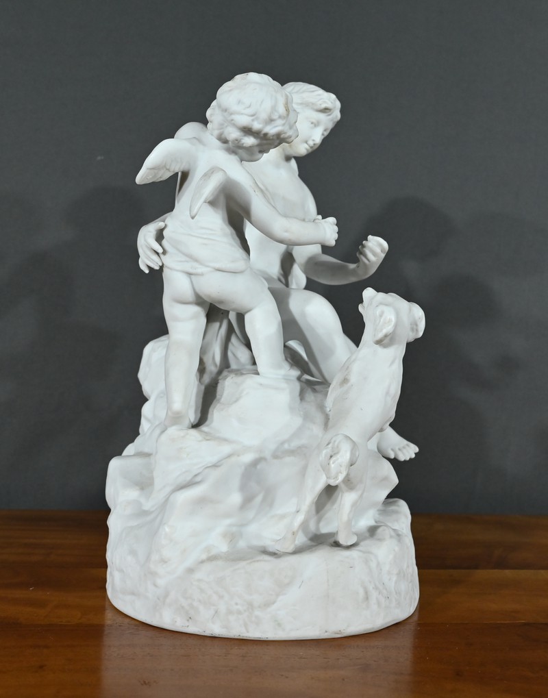 Sculpture à l’antique en porcelaine, représentant Vénus nue assise sur un rocher avec un putti aux ailes déployées à ses côtés. Ces deux personnages, finement réalisés, sont souriants et jouent avec un chien joyeux.