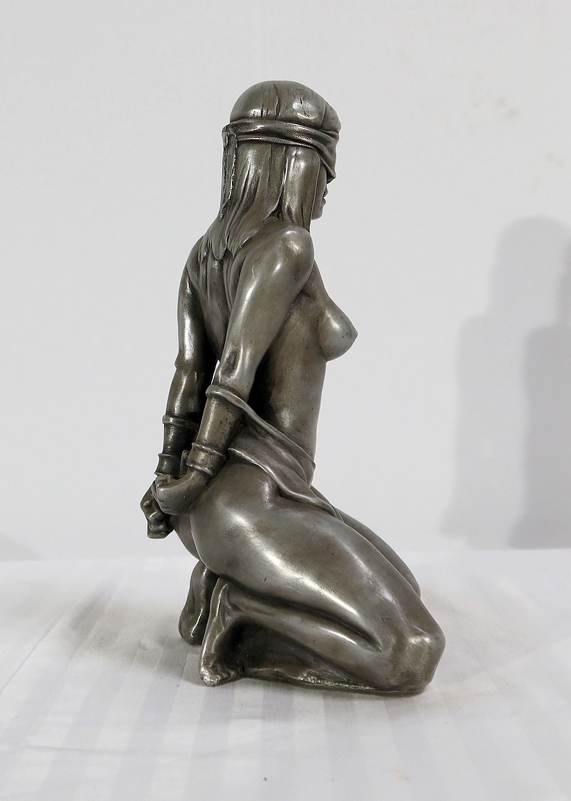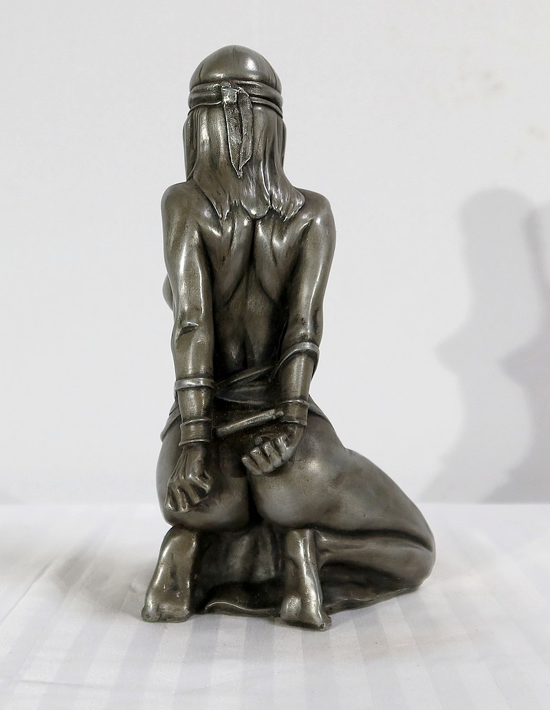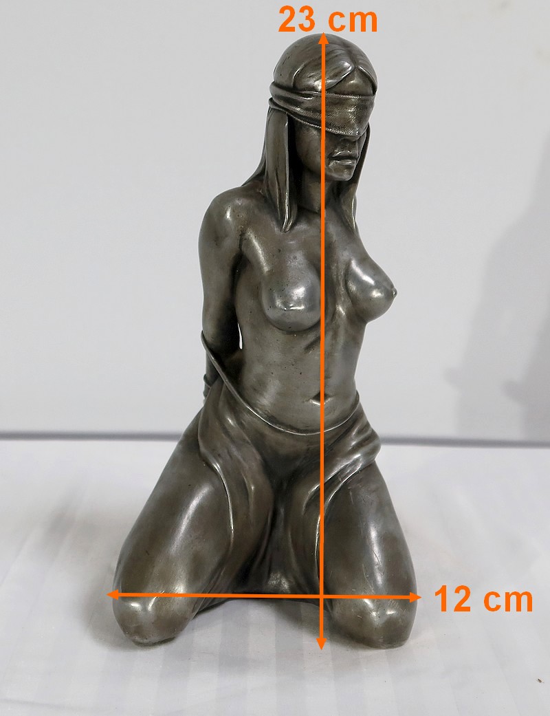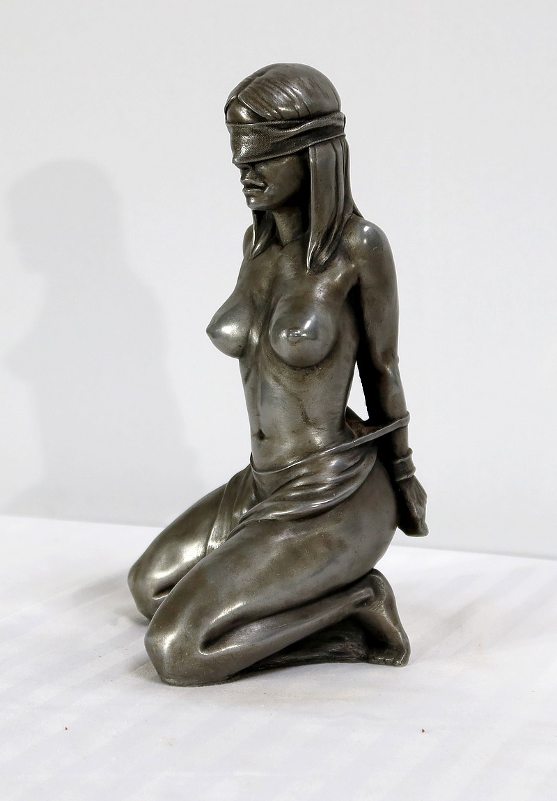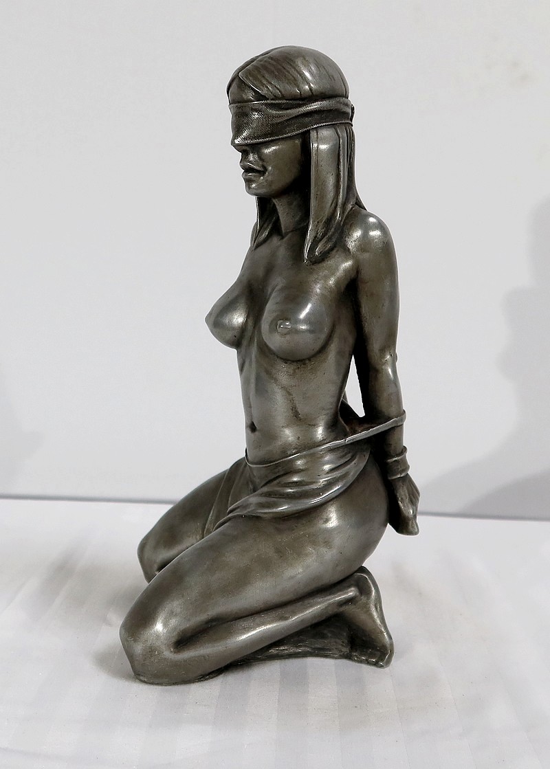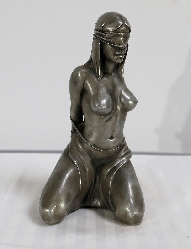 Objet recherché par les collectionneurs, cette œuvre d’art mettant en scène une jeune femme yeux bandés et mains attachées dans le dos, ravira les amateurs.