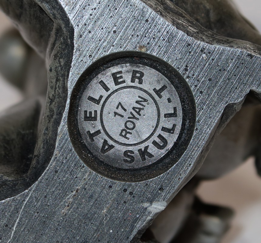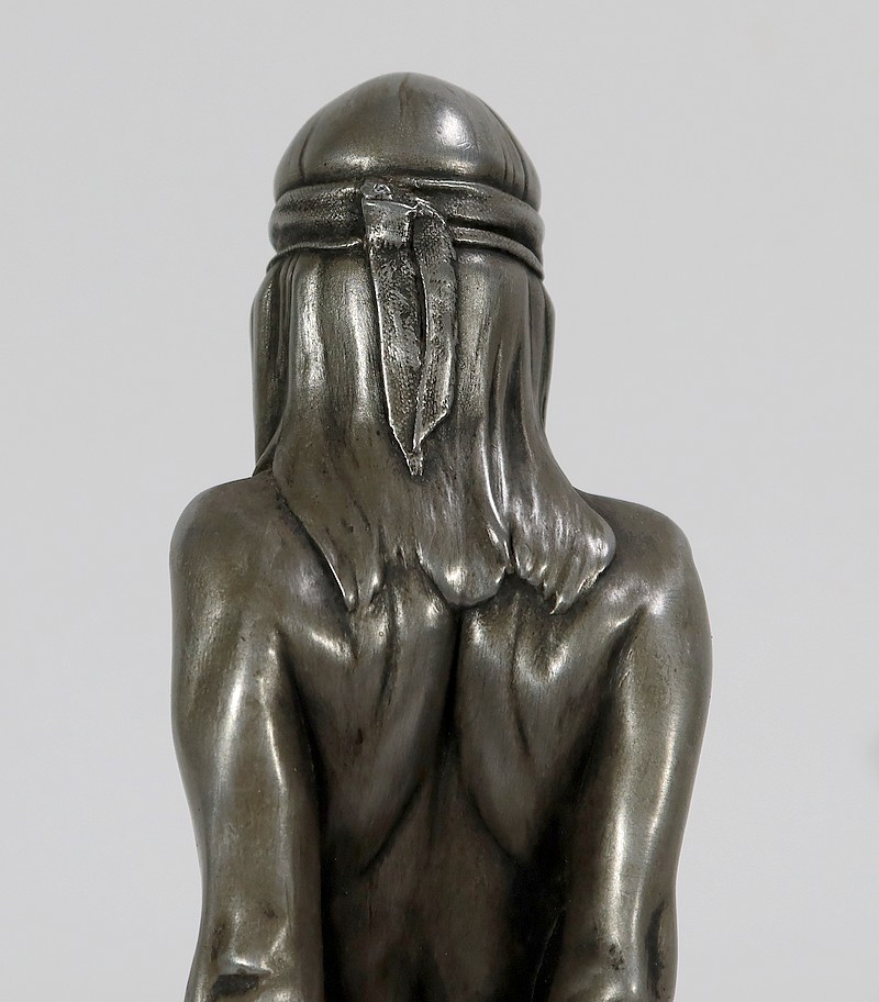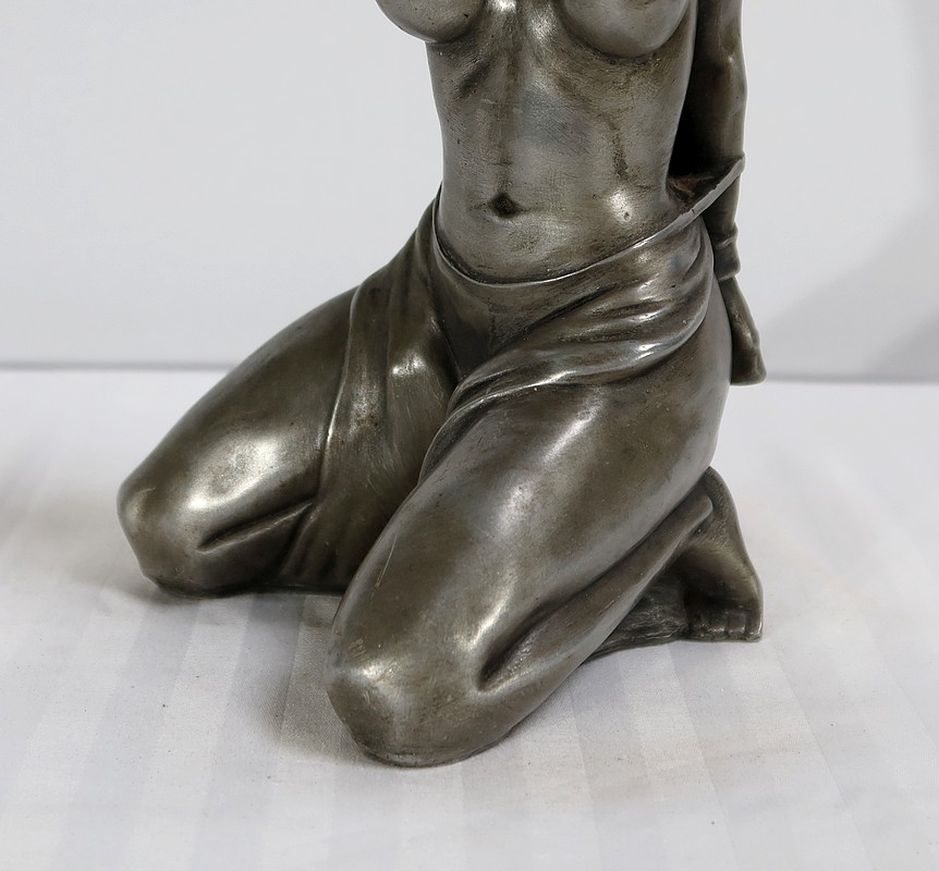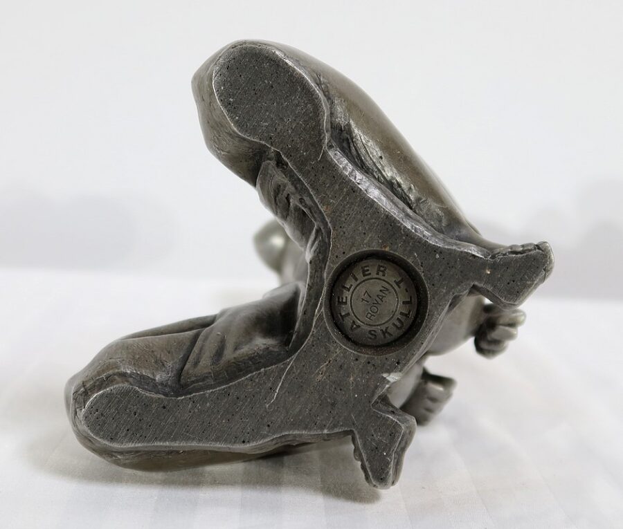 Épreuve en étain représentant une femme dénudée, attribuée au sculpteur Samuel Boulesteix et éditée dans les années 1990 par l’atelier Skull-T, installé à Royan. Le cachet est présent sous la sculpture.