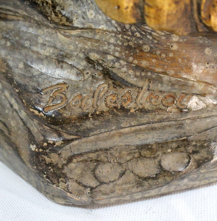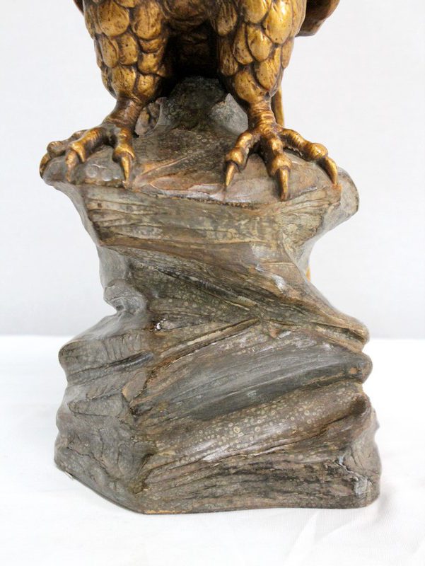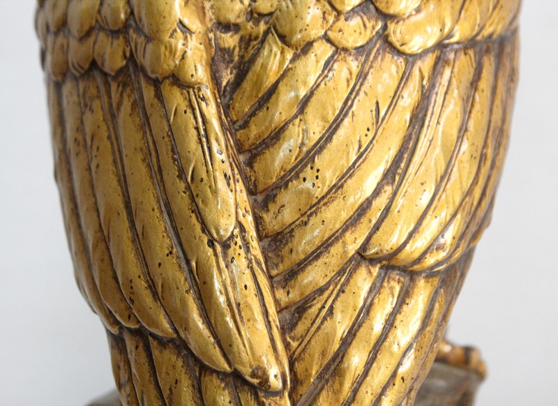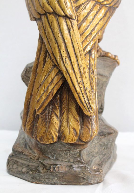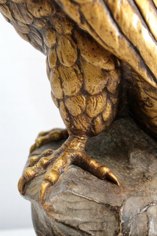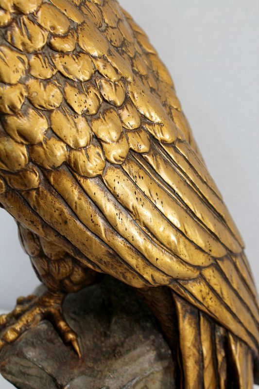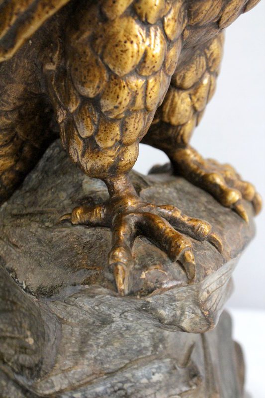 Sujet en Plâtre doré et patiné représentant un rapace campé sur son rocher, d’après le sculpteur italien du XVIIIe siècle Pietro Balestra (1672 – 1729). L’animal semble aux aguets sur son perchoir, comme à la recherche de sa prochaine cible. L’artiste a su représenter fidèlement les caractéristiques de cet oiseau de proie, avec son bec crochu redoutable et ses serres solides. Il se pare d’un pennage finement exécuté par le sculpteur, qui a pris soin de détailler avec précision les rémiges et les rectrices, respectivement les plumes de vol des ailes et celles de la queue.