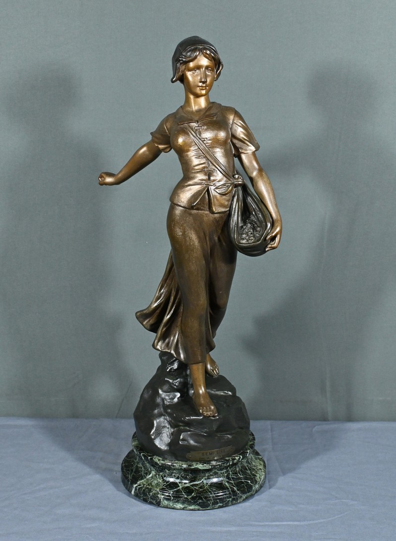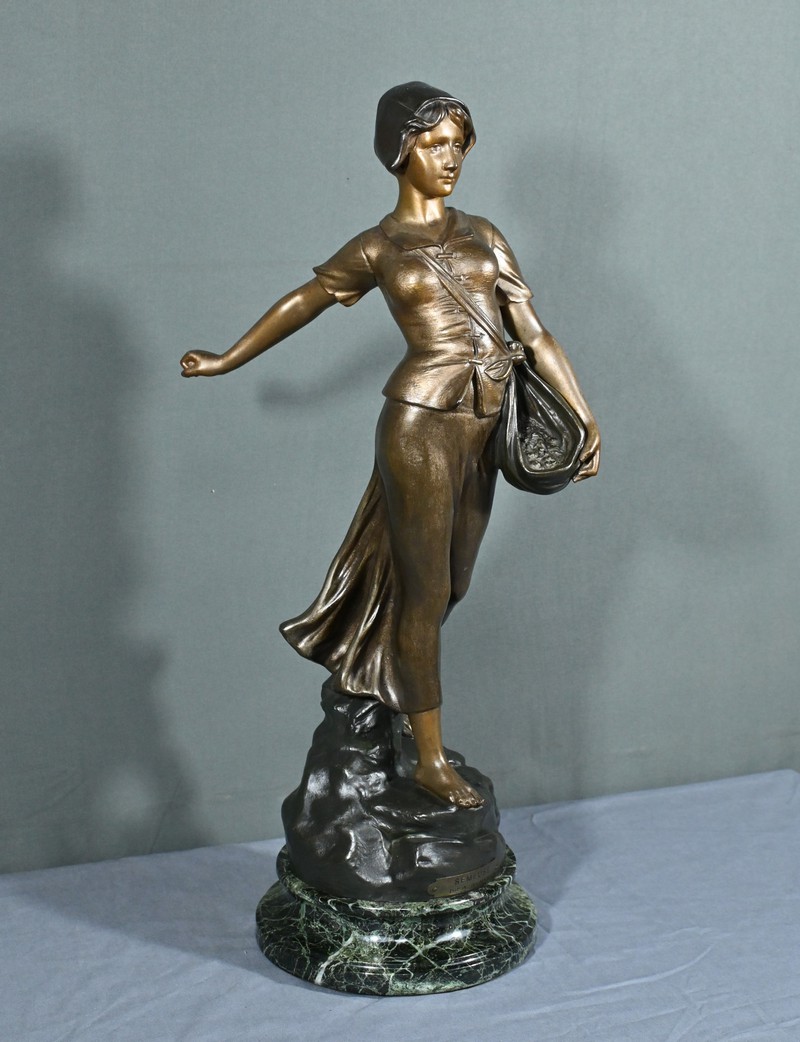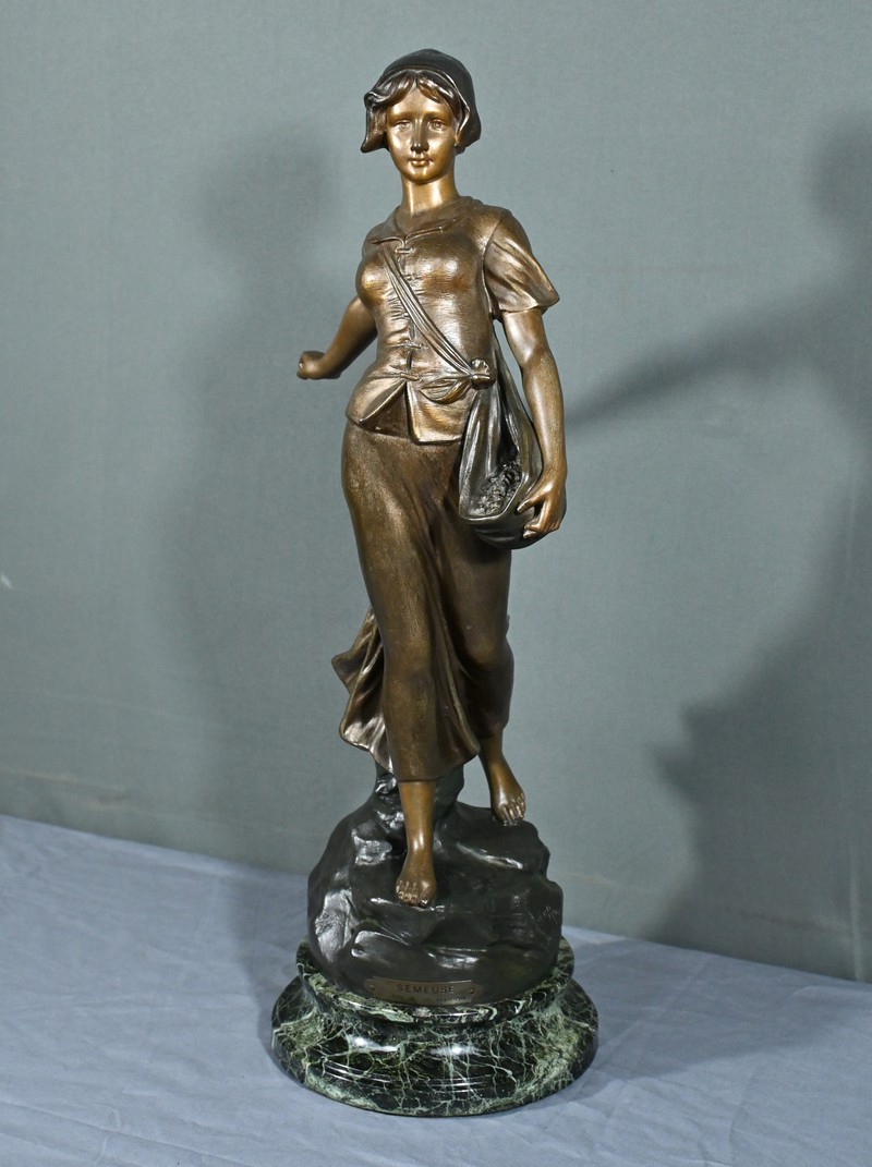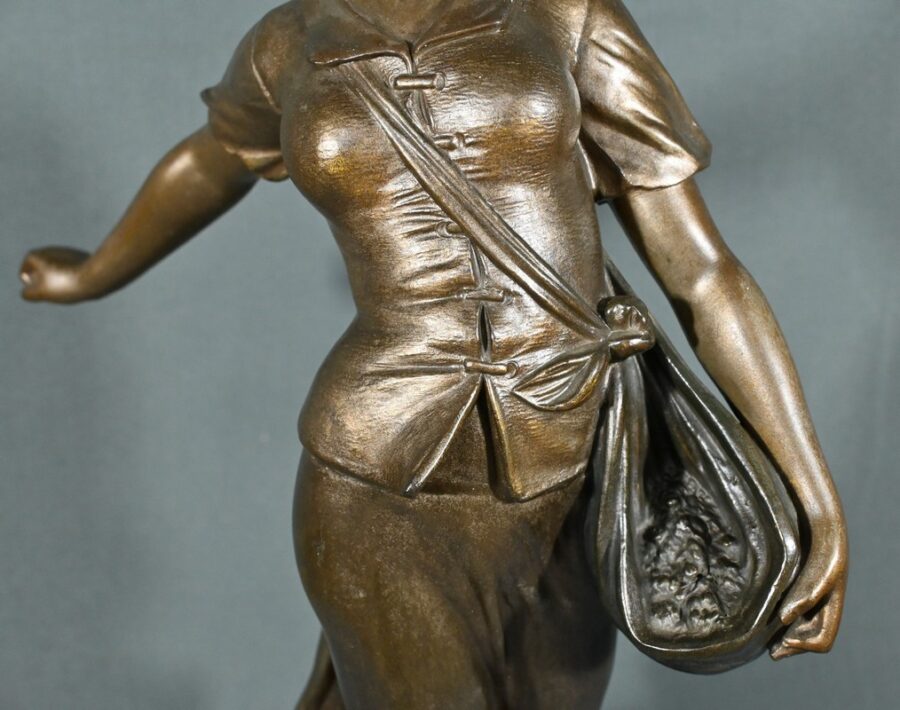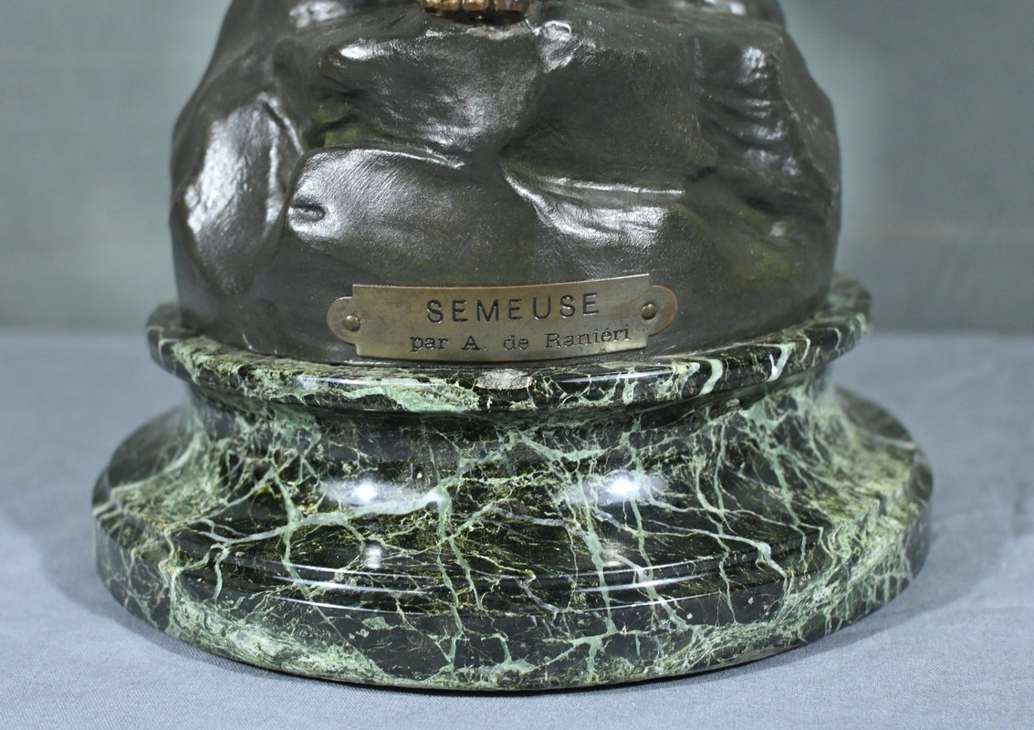 Cette élégante sculpture en régule, réalisée par le sculpteur italien Aristide De Ranieri (1865-1954), représente « Semeuse », une figure allégorique pleine de grâce et de poésie.
