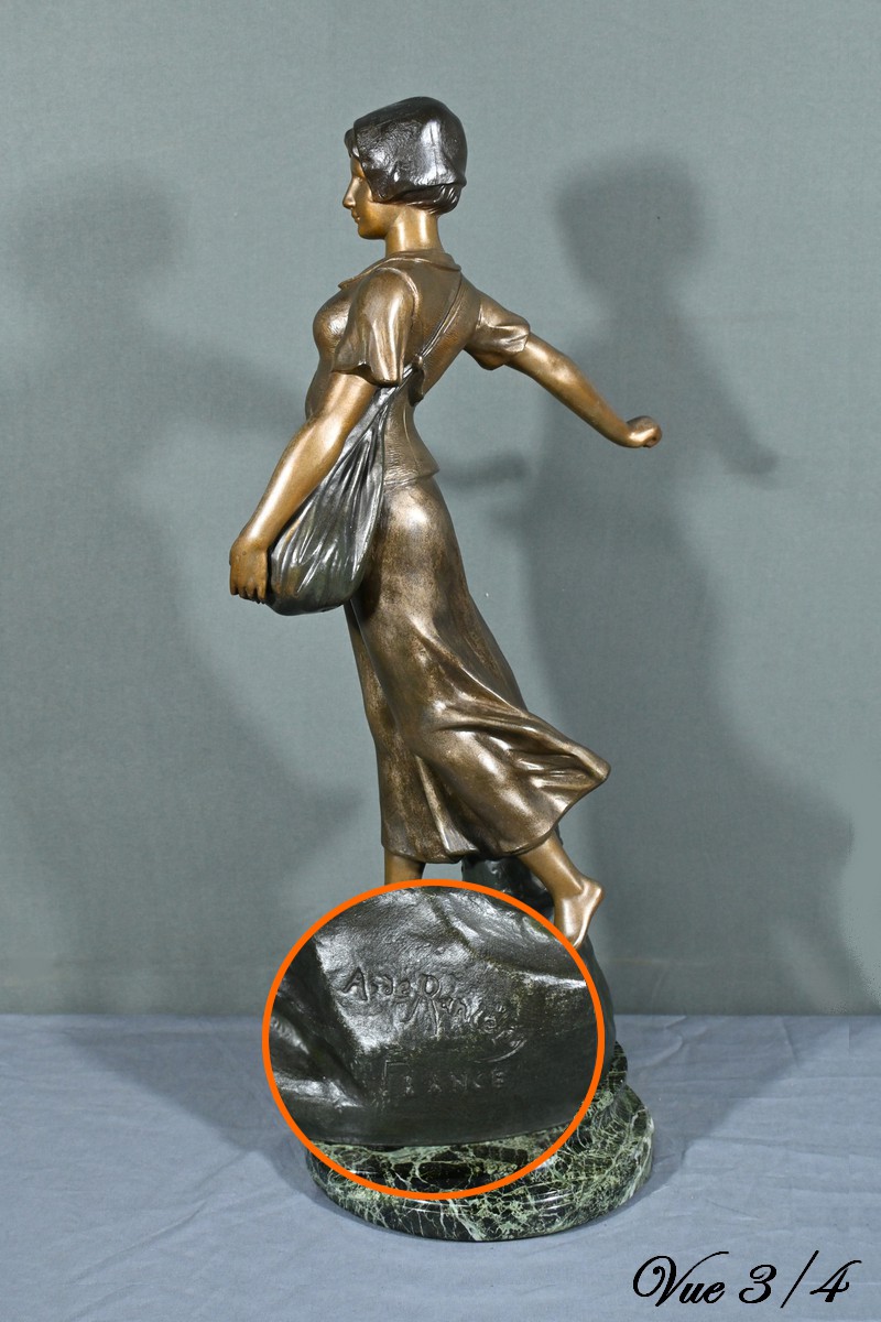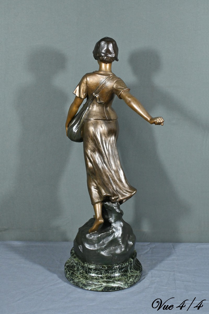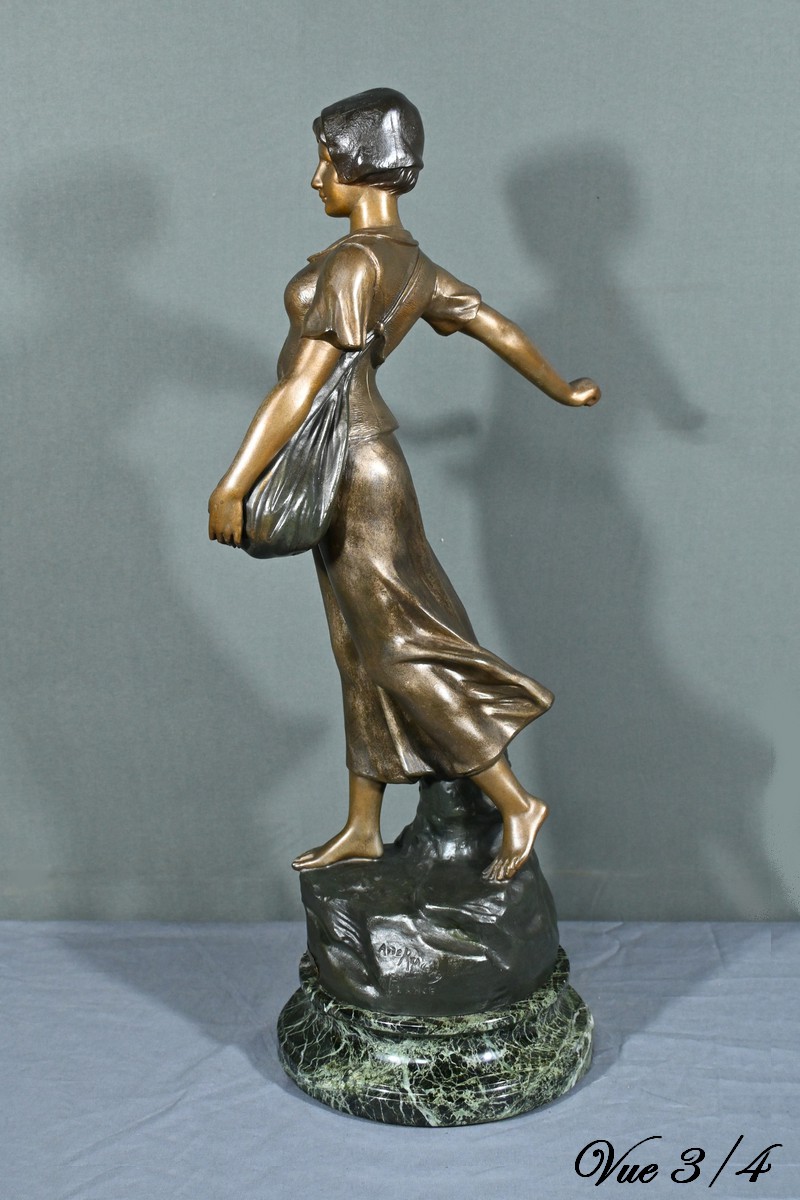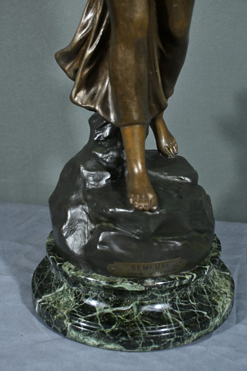 Cette élégante sculpture en régule, réalisée par le sculpteur italien Aristide De Ranieri (1865-1954), représente « Semeuse », une figure allégorique pleine de grâce et de poésie.