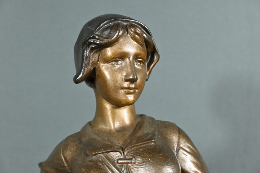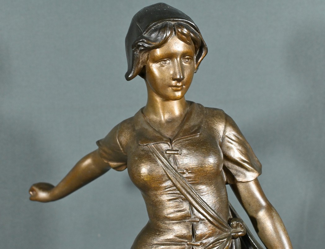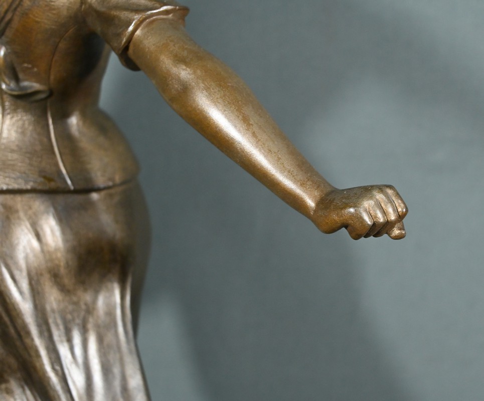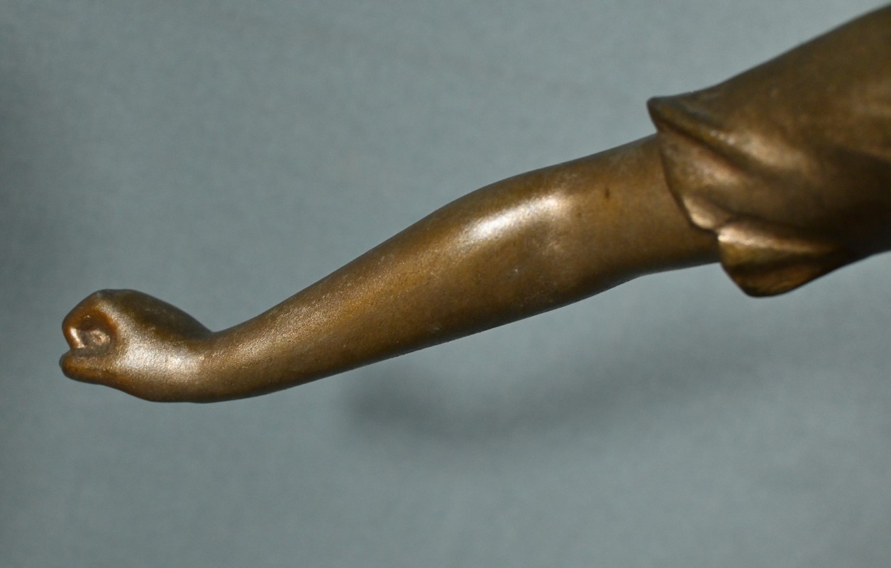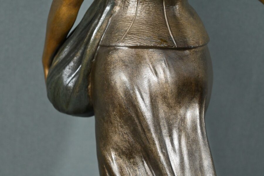 Les plis de sa robe, finement sculptés, suggèrent le mouvement du vent, apportant une dynamique saisissante à l’œuvre.