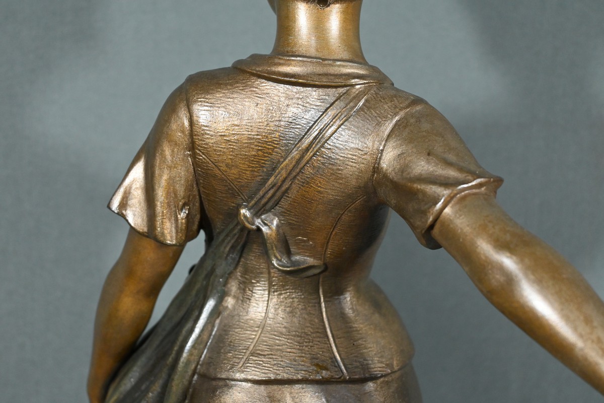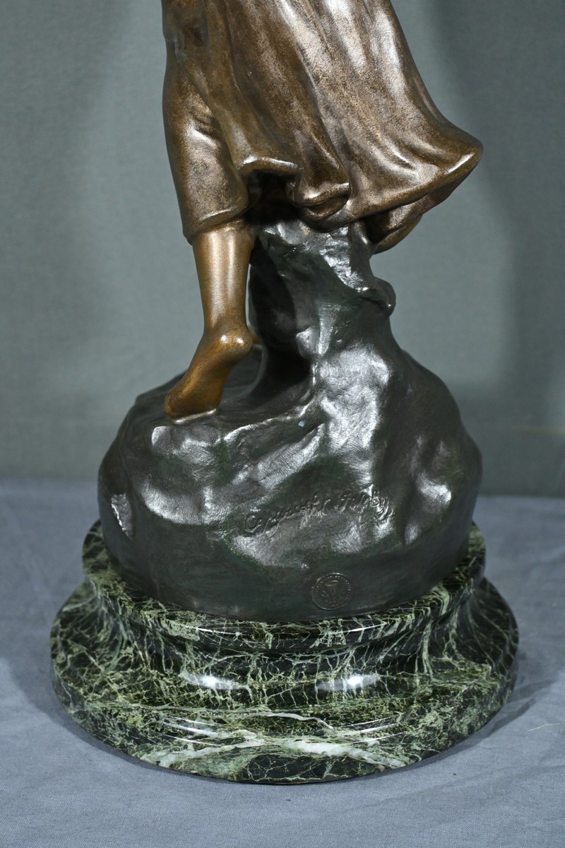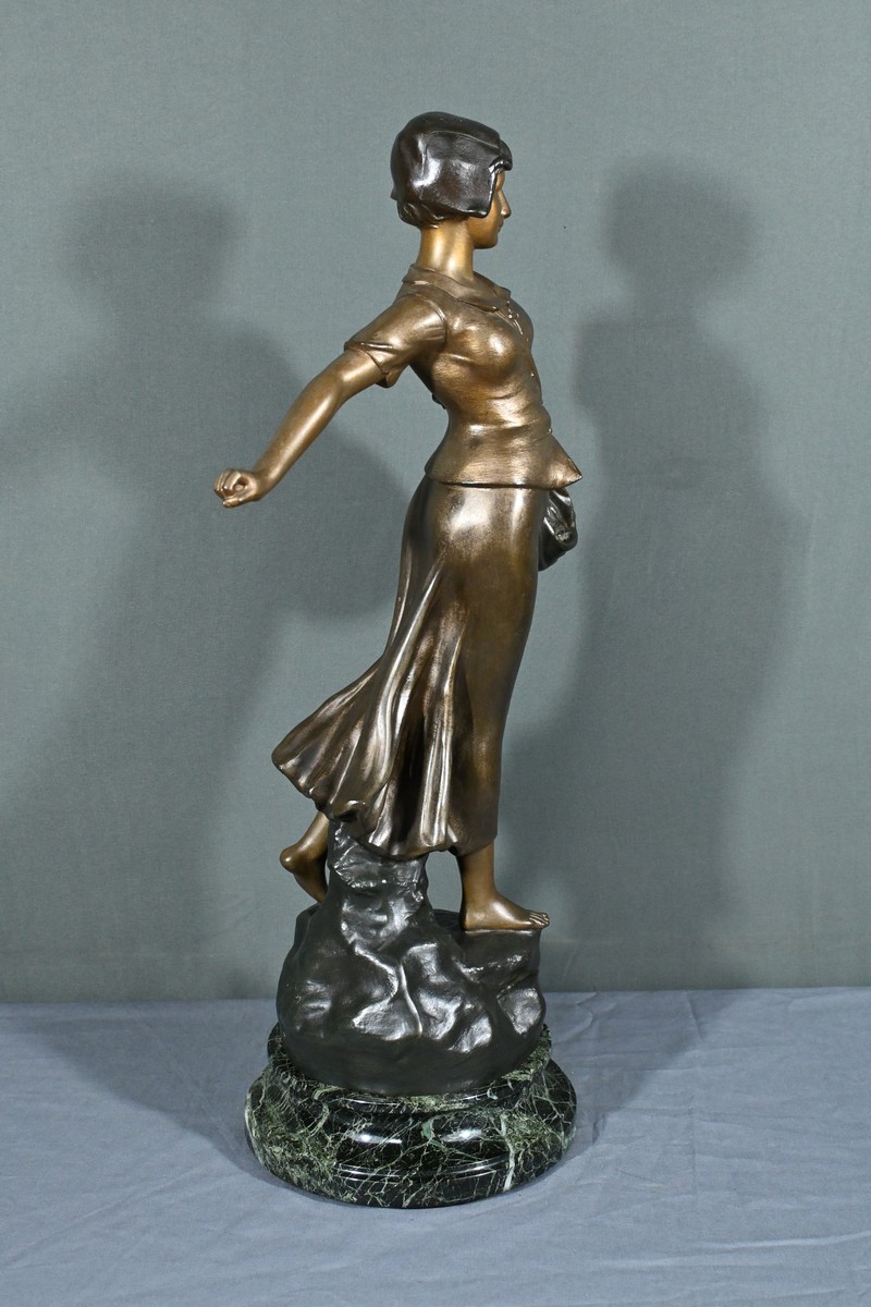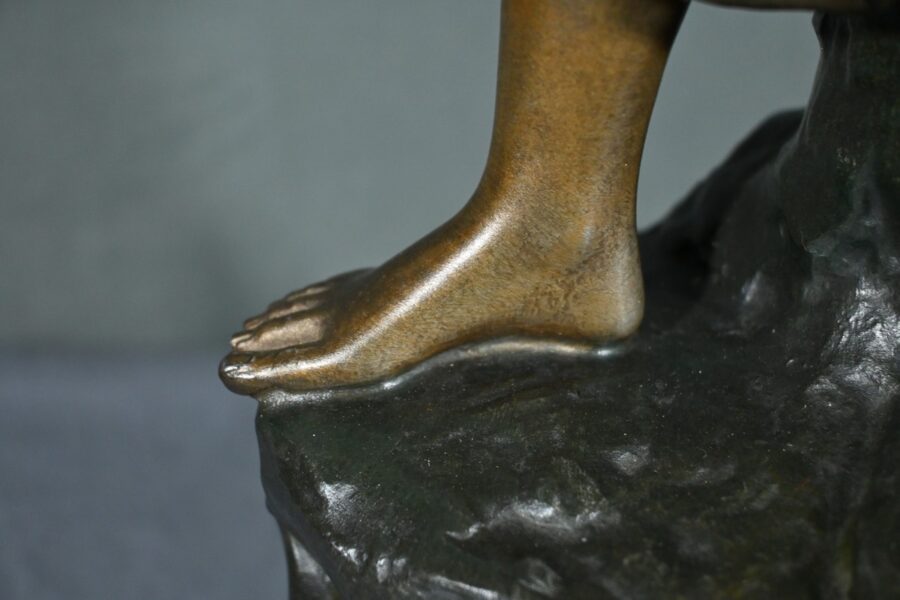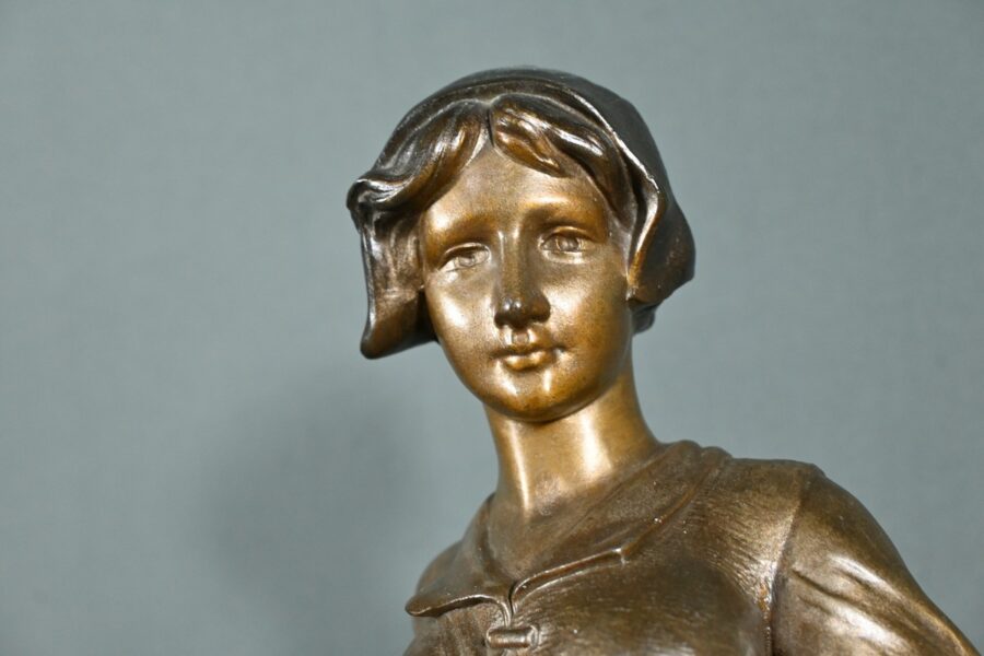 Les plis de sa robe, finement sculptés, suggèrent le mouvement du vent, apportant une dynamique saisissante à l’œuvre.