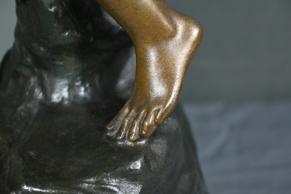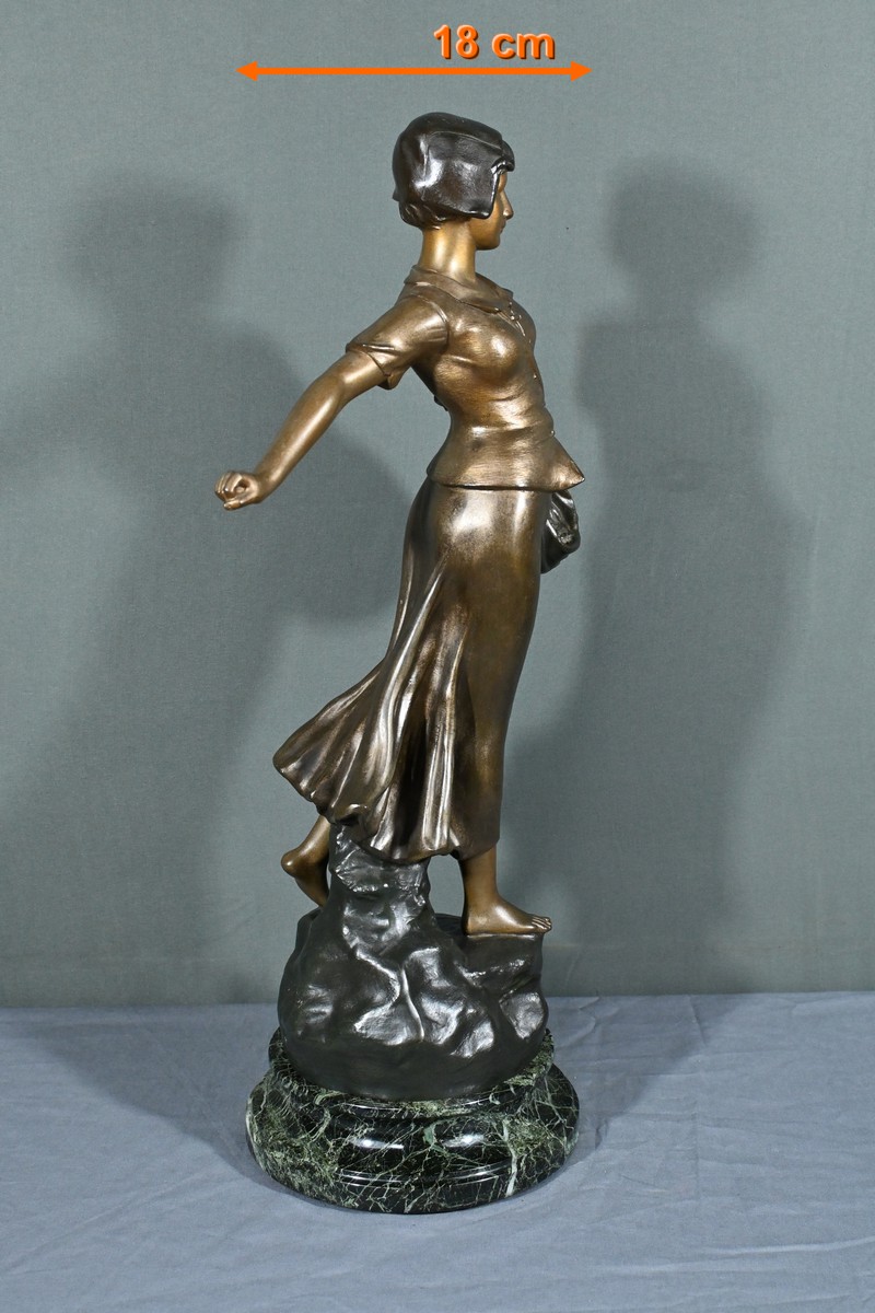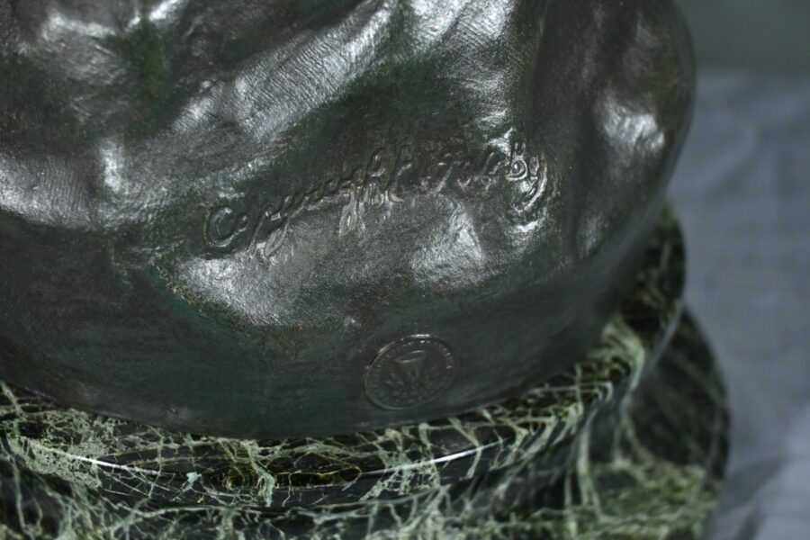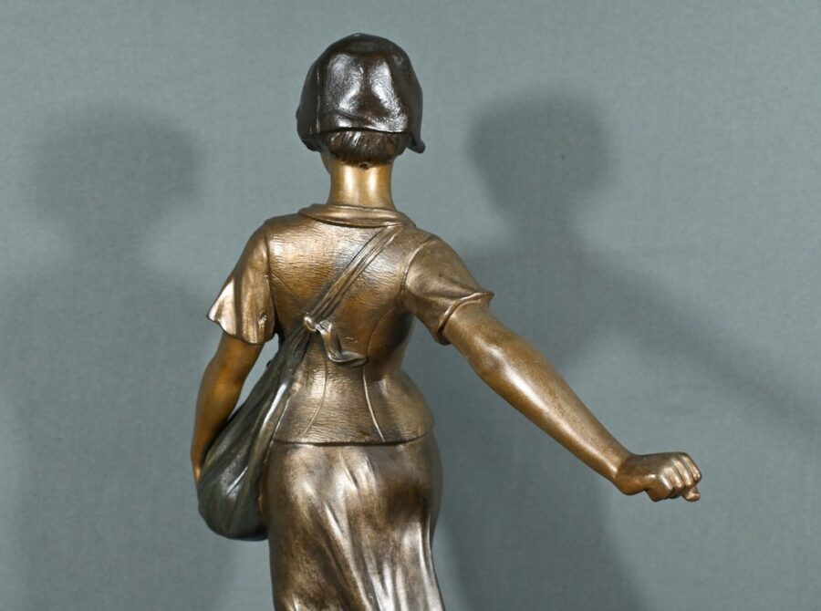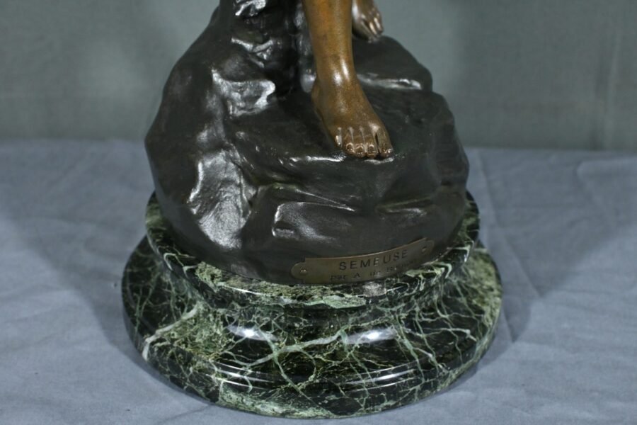 Posée sur un socle en marbre vert de mer, cette sculpture témoigne du talent d’Aristide De Ranieri pour capturer la beauté du geste quotidien et sublimer le réalisme en poésie visuelle. Par son élégance intemporelle, « Semeuse » trouve aisément sa place dans une collection d’art classique ou un intérieur raffiné.