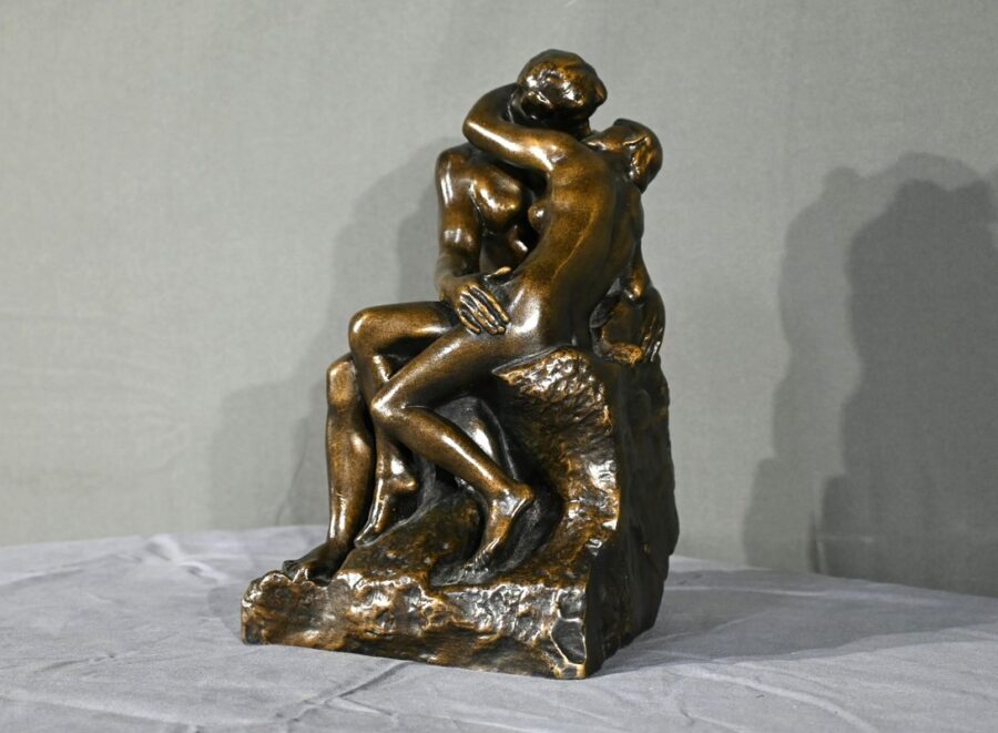 La sculpture représente deux figures enlacées dans une étreinte intime, symbolisant la passion et l’amour romantique.