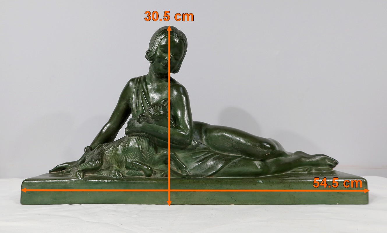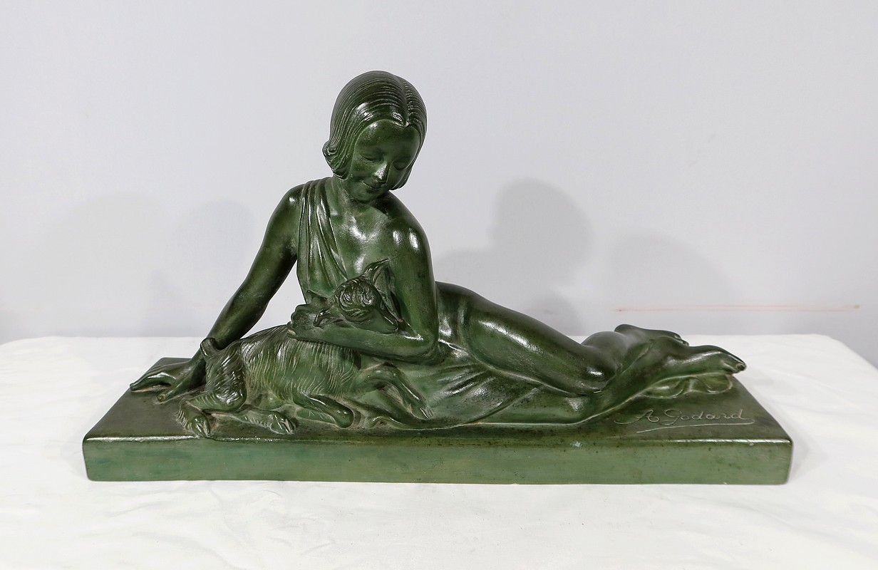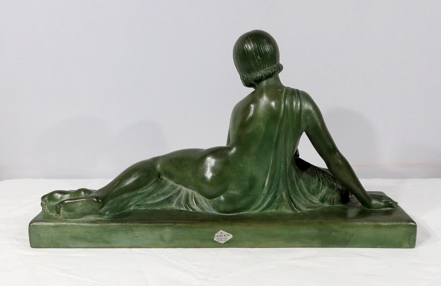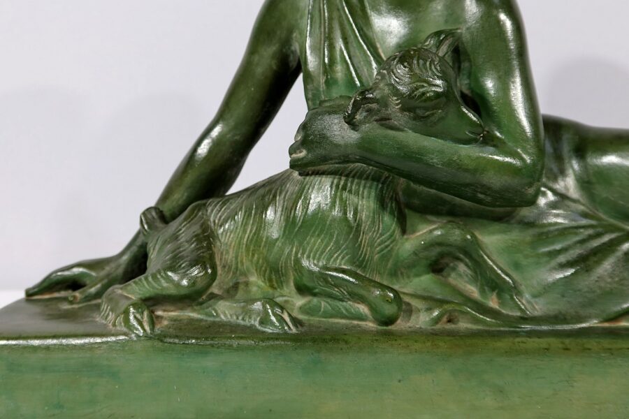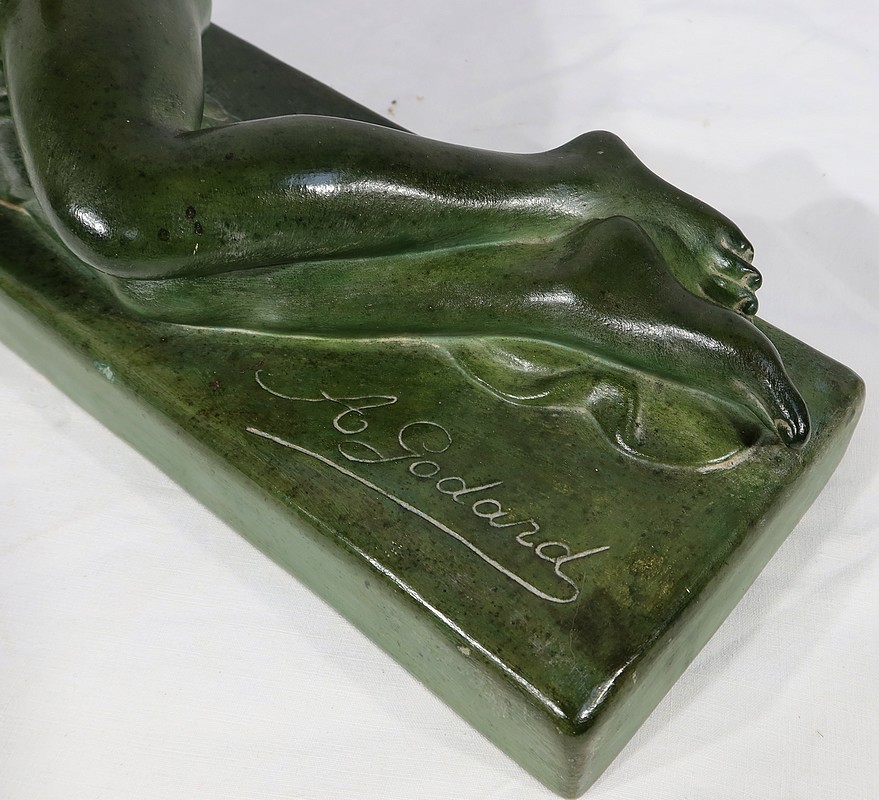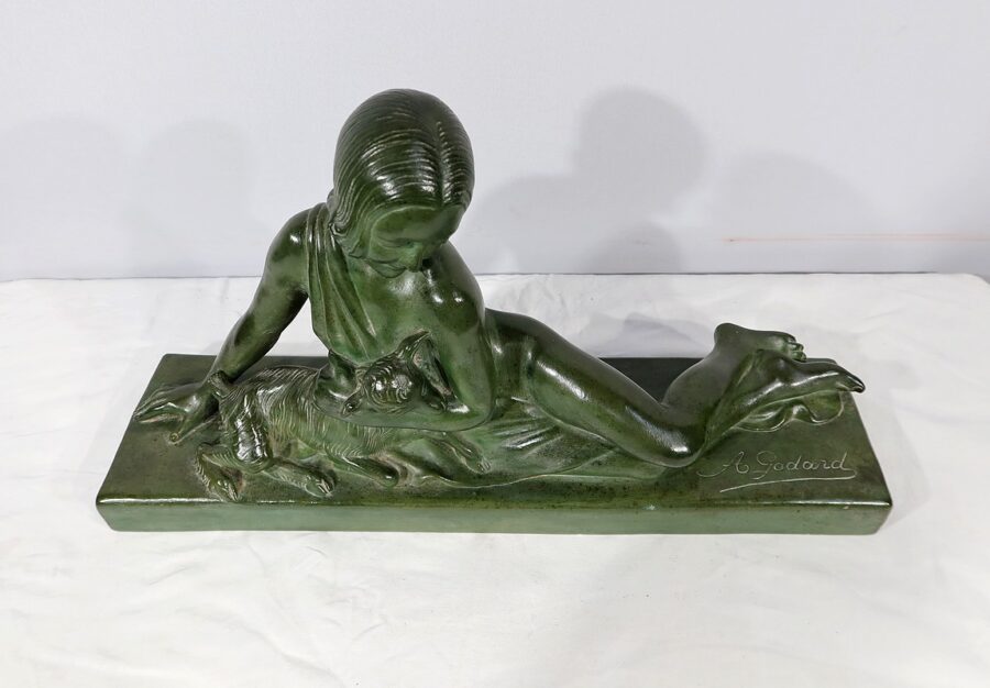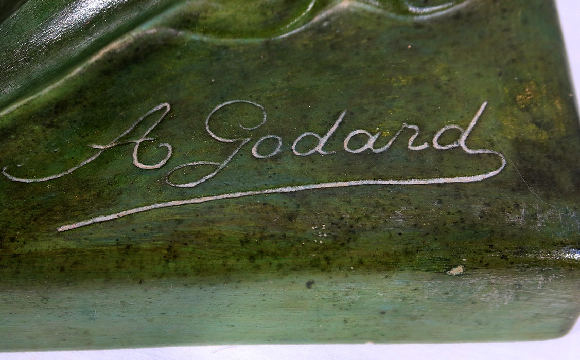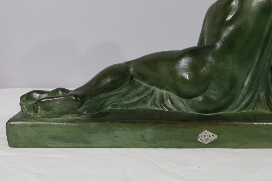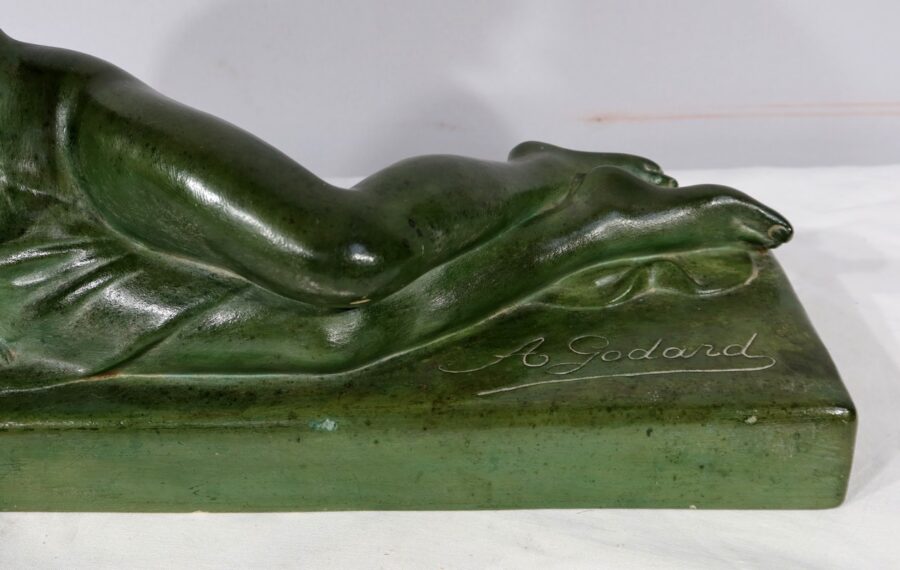 Grande sculpture en plâtre à patine vert antique, signée Armand Godard sur la terrasse. Cet artiste français se fait connaître au début du XXe siècle par son style unique. Entre 1920 et 1940 il expose à Paris dans les salons de la Société des Artistes Français. A l’exposition universelle de Paris en 1937 il présente une statue Monumentale de 4.5 mètres de haut.