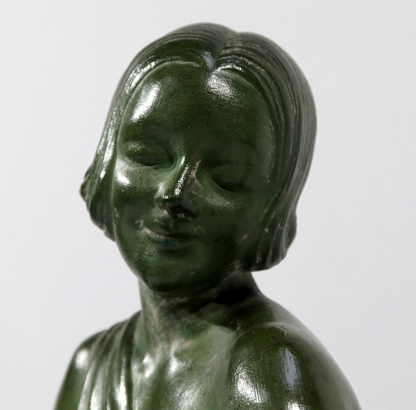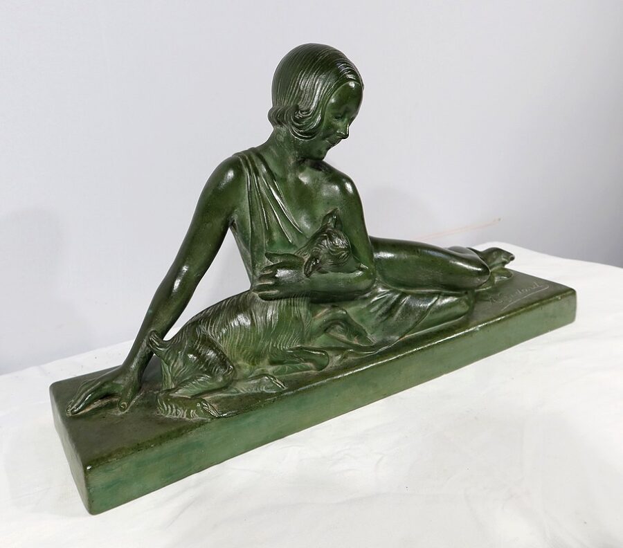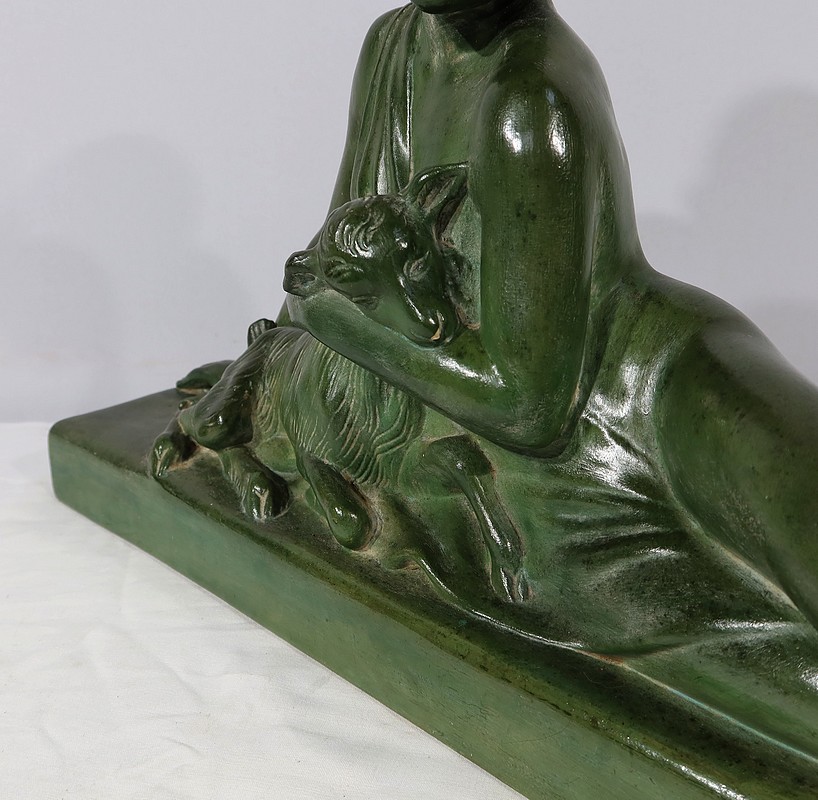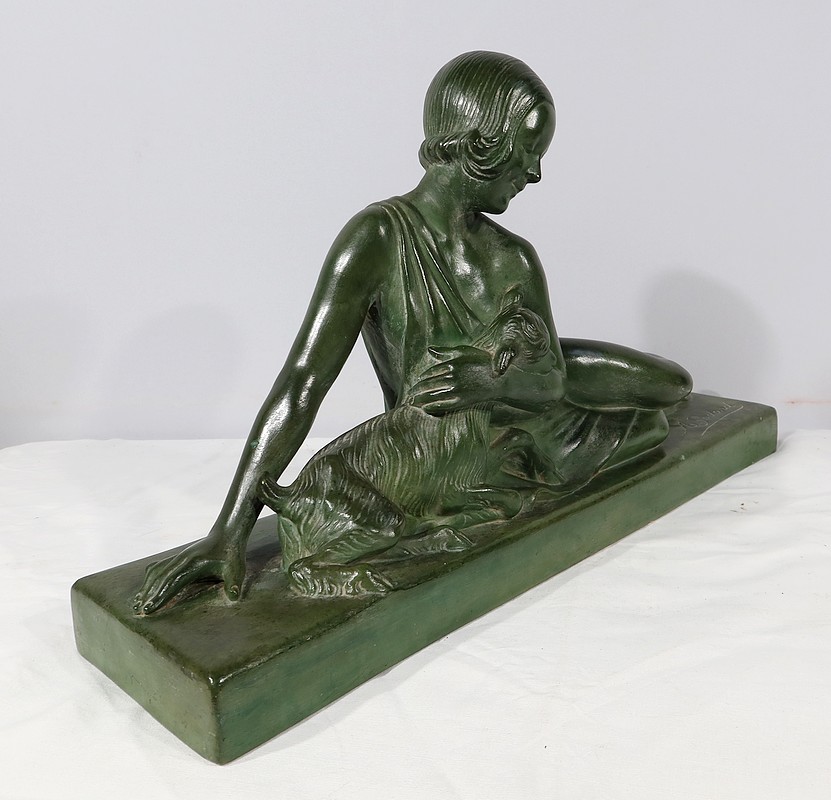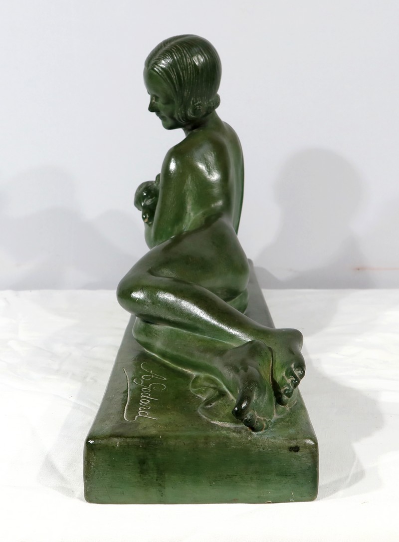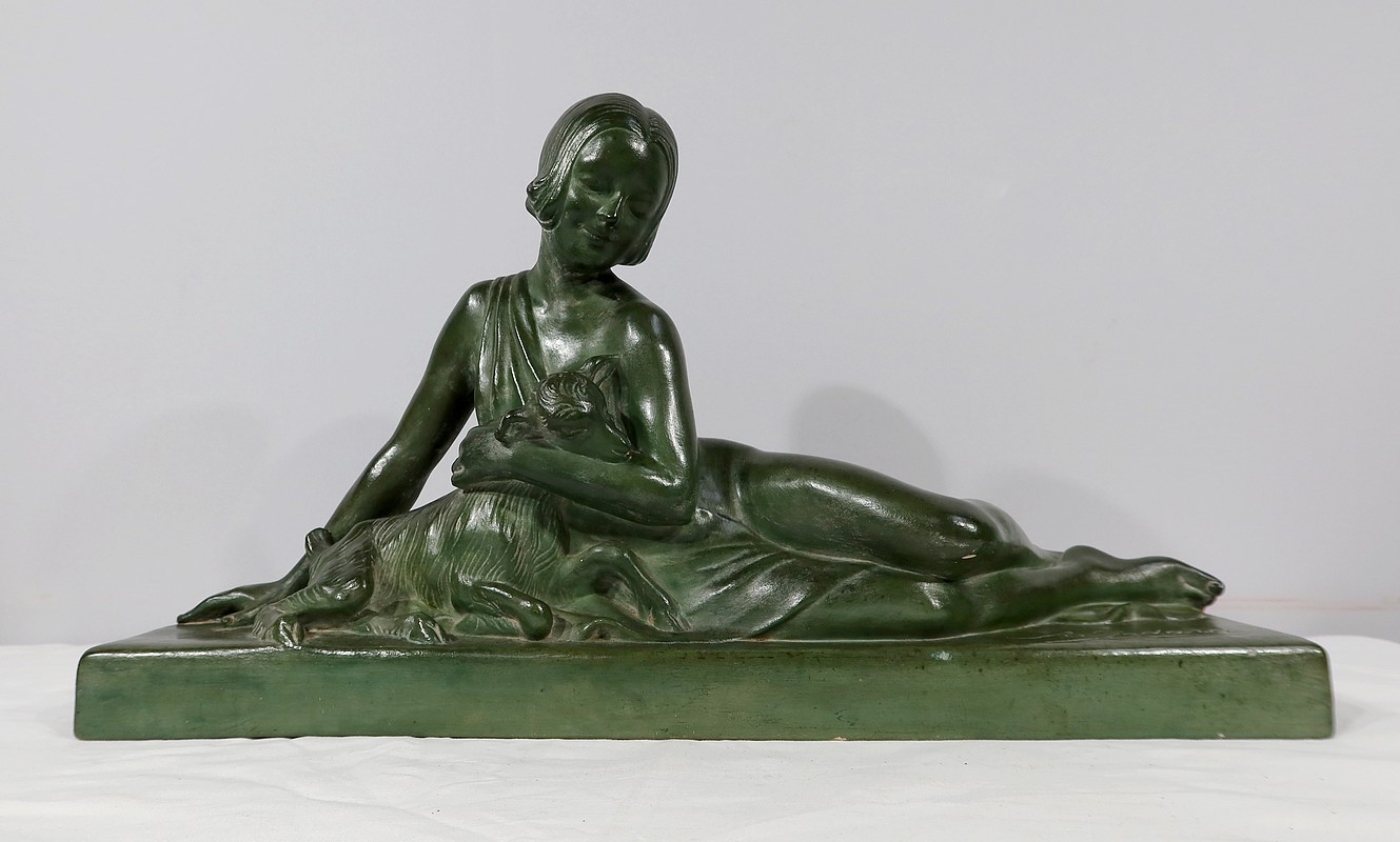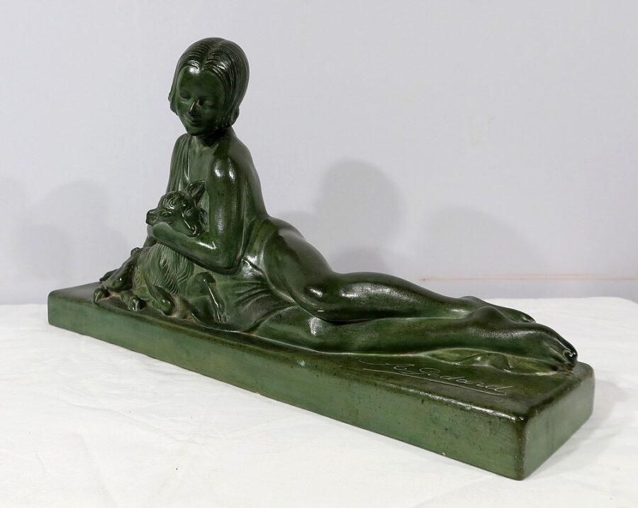Grande sculpture en plâtre à patine vert antique, signée Armand Godard sur la terrasse. Cet artiste français se fait connaître au début du XXe siècle par son style unique. Entre 1920 et 1940 il expose à Paris dans les salons de la Société des Artistes Français. A l’exposition universelle de Paris en 1937 il présente une statue Monumentale de 4.5 mètres de haut.