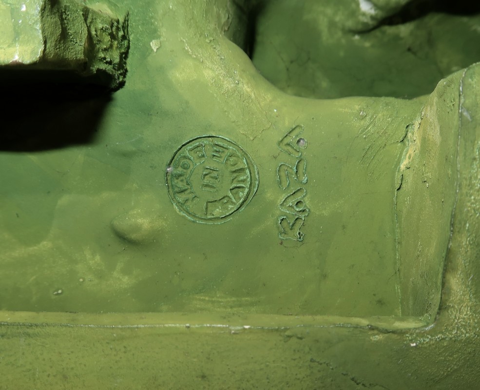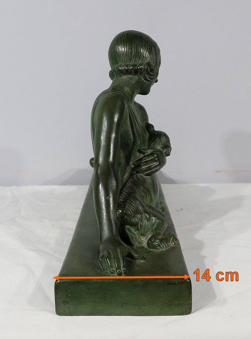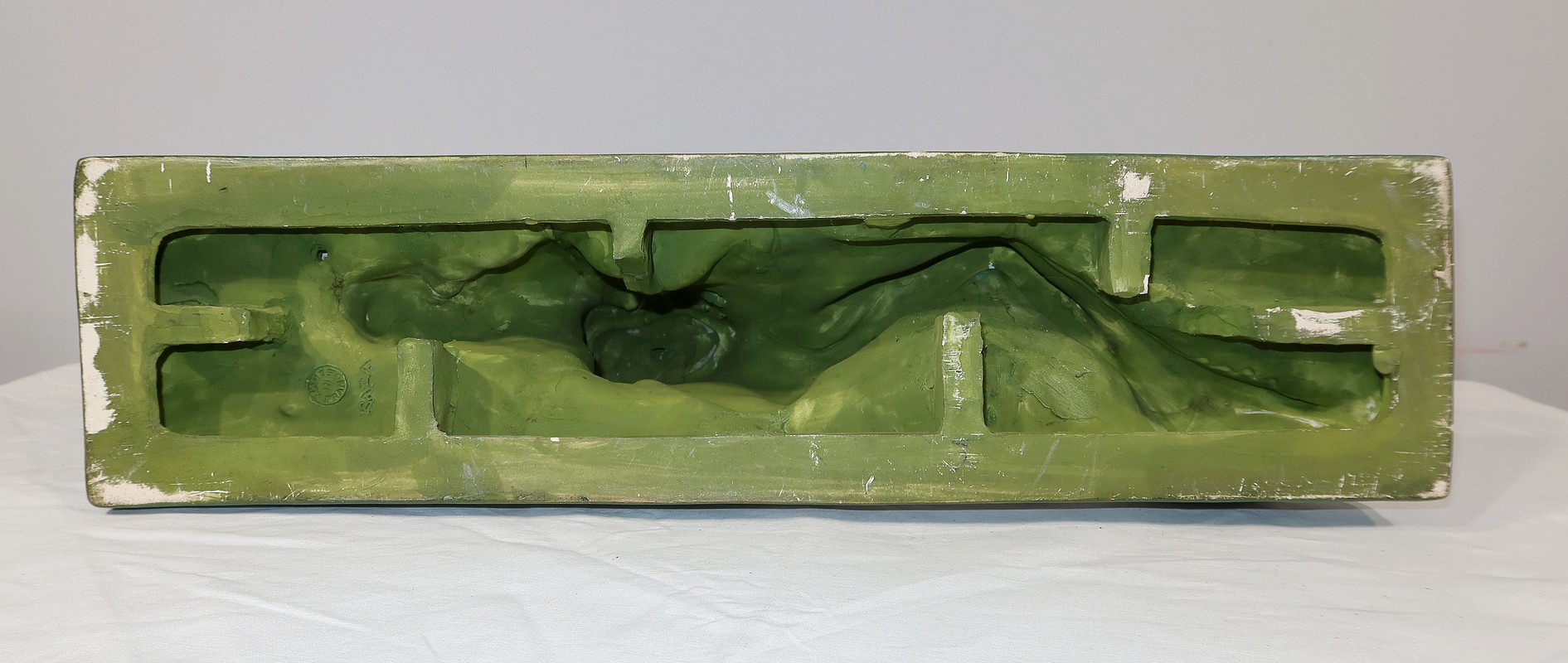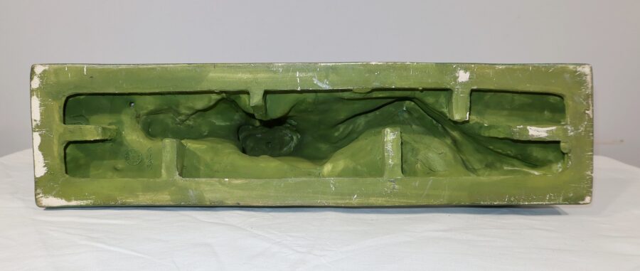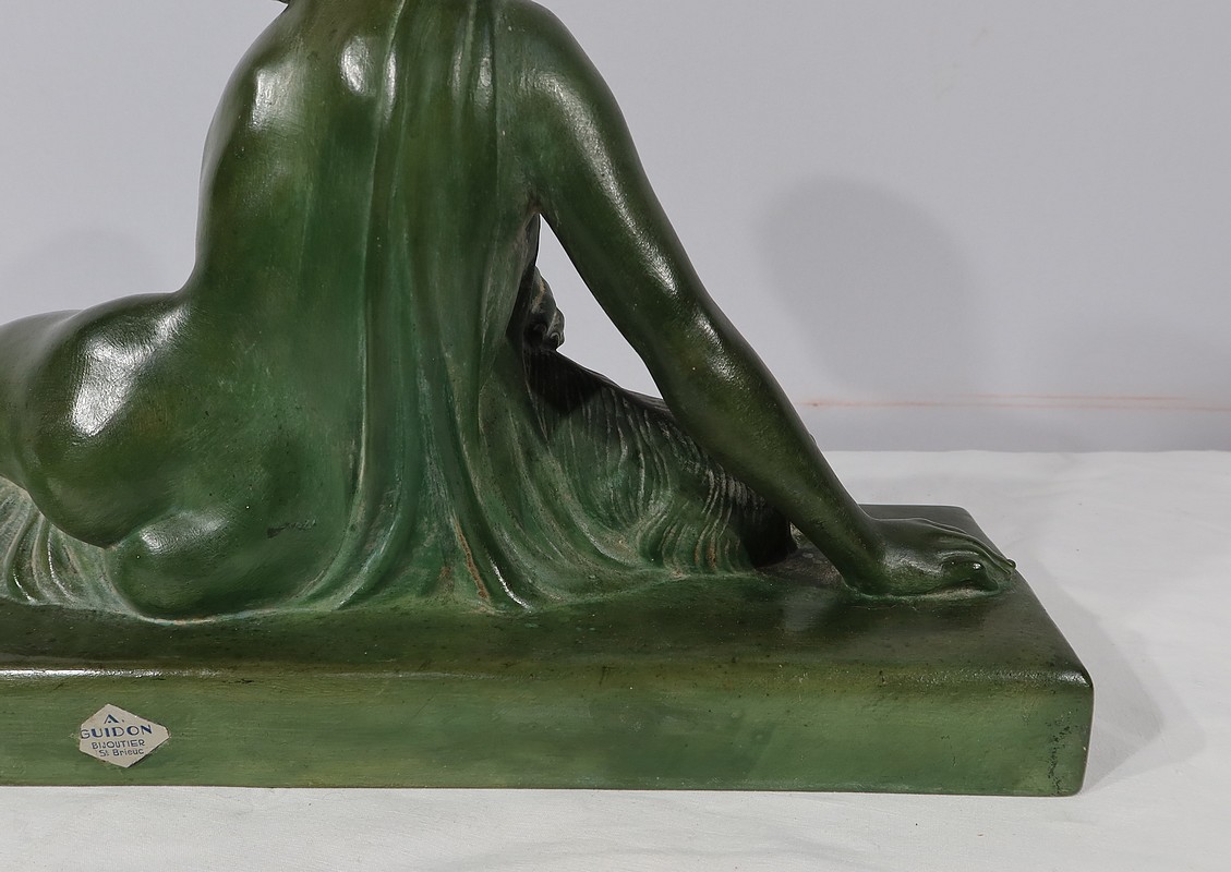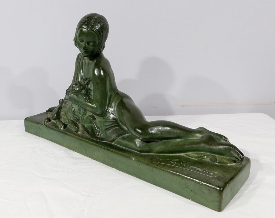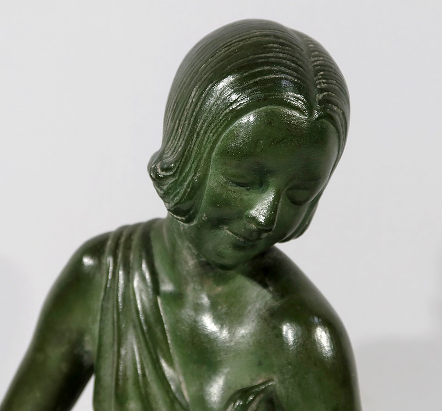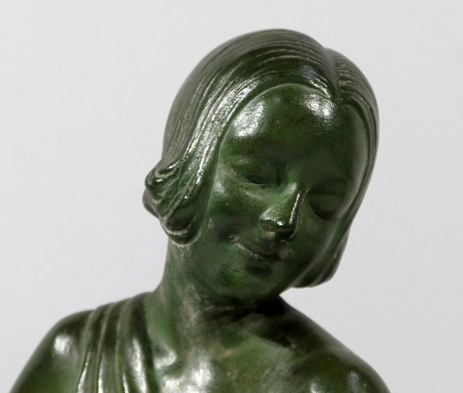 Grande sculpture en plâtre à patine vert antique, signée Armand Godard sur la terrasse. Cet artiste français se fait connaître au début du XXe siècle par son style unique. Entre 1920 et 1940 il expose à Paris dans les salons de la Société des Artistes Français. A l’exposition universelle de Paris en 1937 il présente une statue Monumentale de 4.5 mètres de haut.