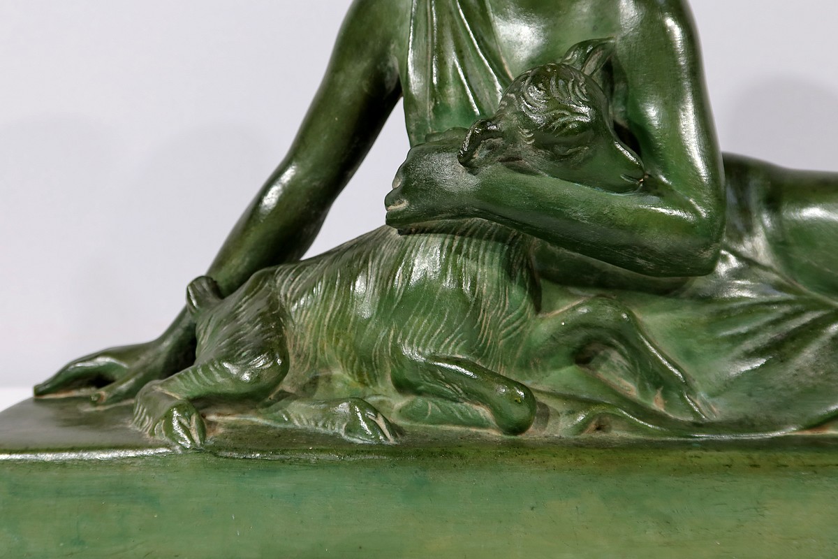 La jeune femme dénudée est étendue sur le sol et serre un chevreau contre son cœur dans un geste affectueux. Elle sourit, heureuse de ce moment partagé.