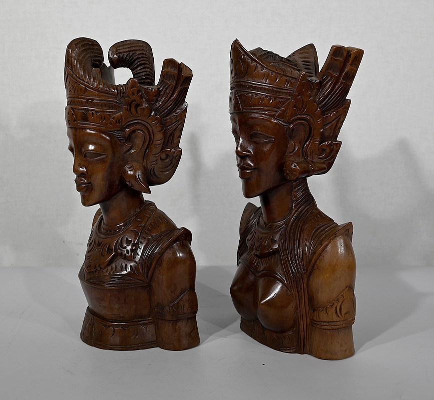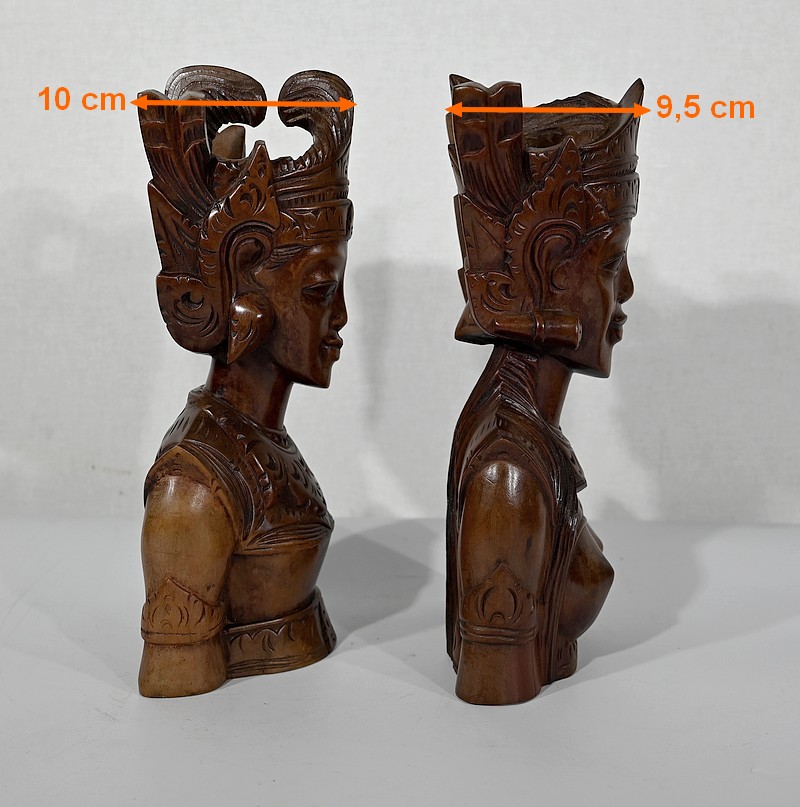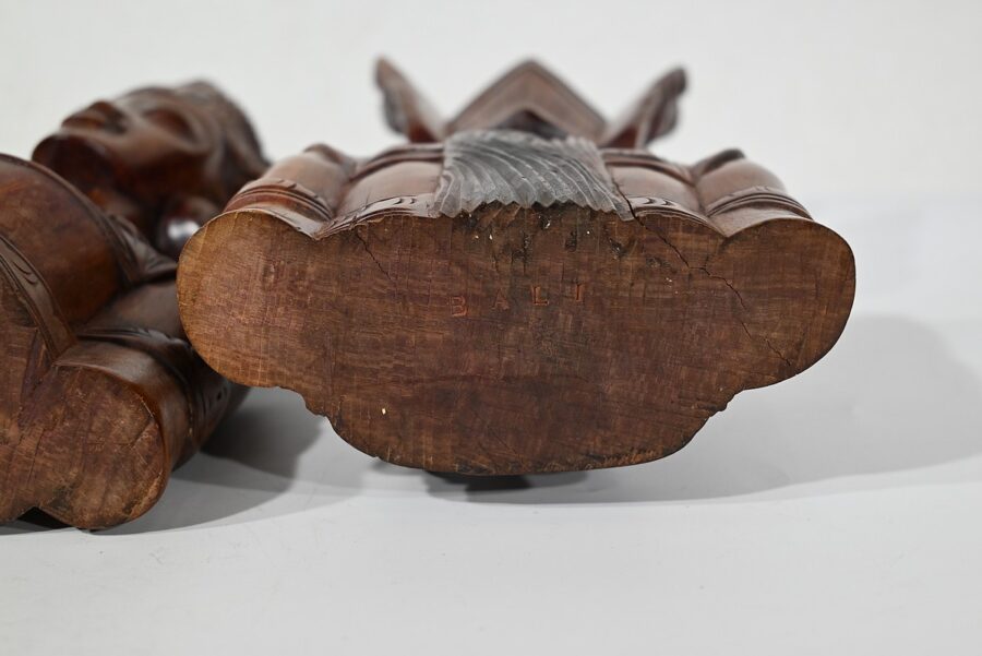 Paire de sculptures balinaises représentant deux danseuses de Legong, qui selon la tradition représente le ballet céleste des nymphes divines.