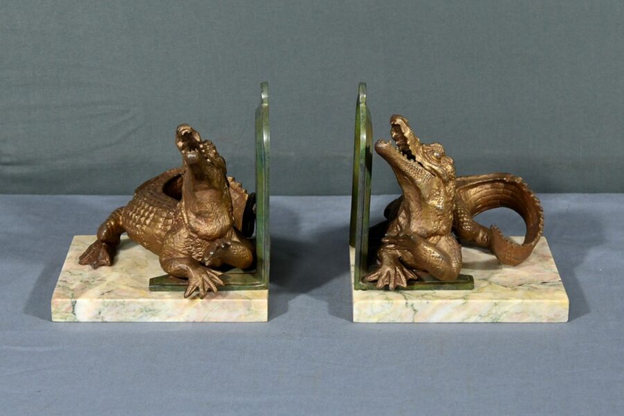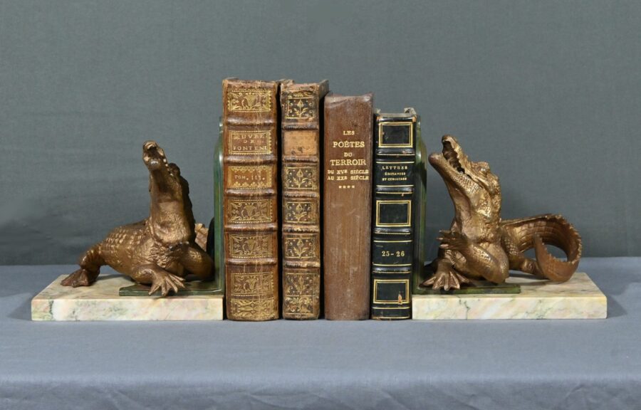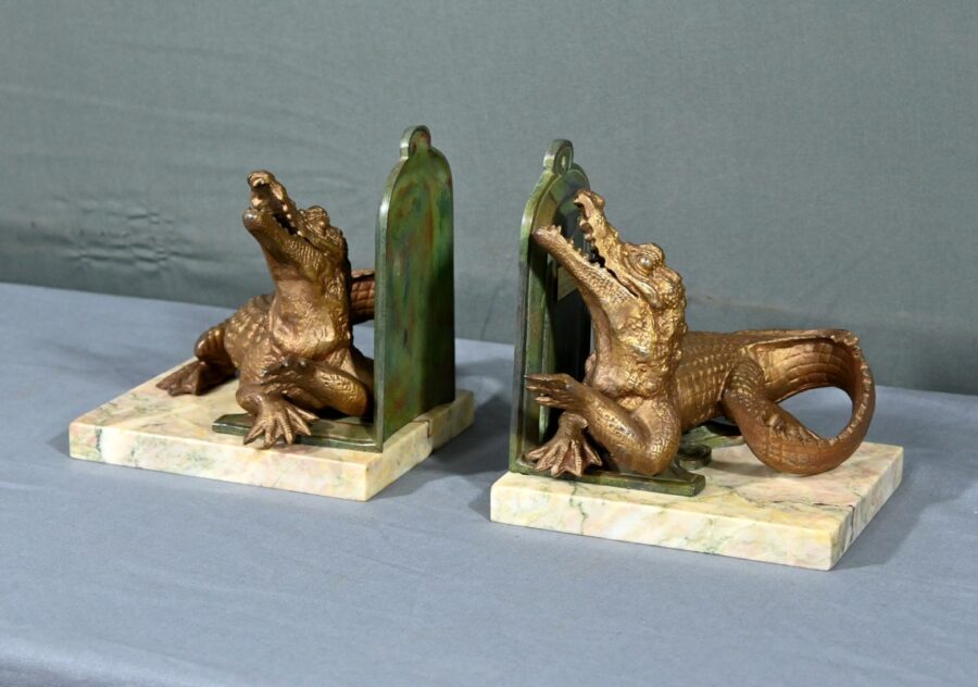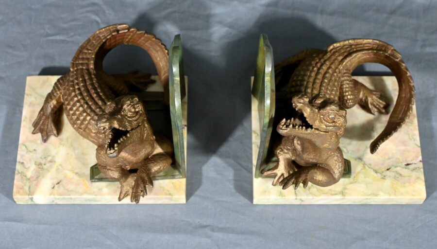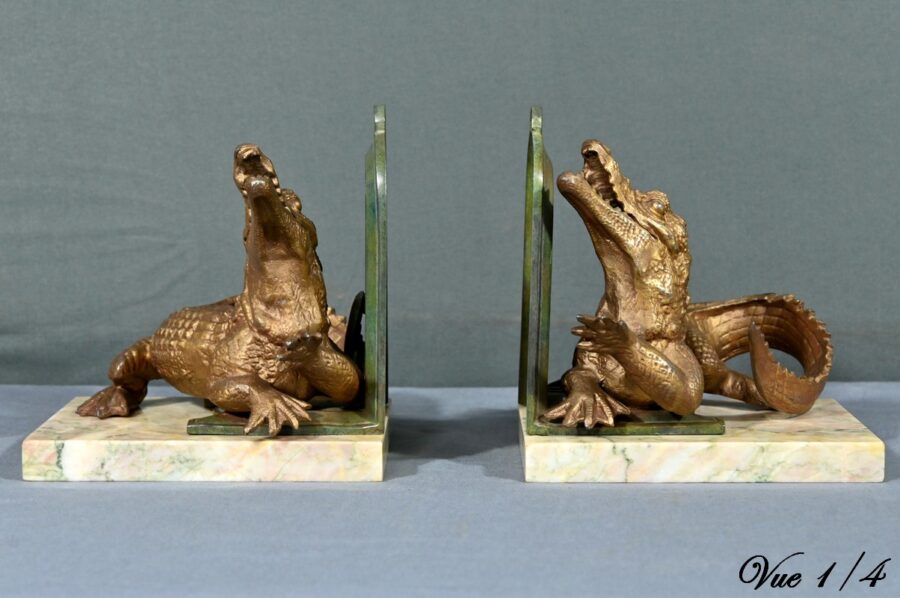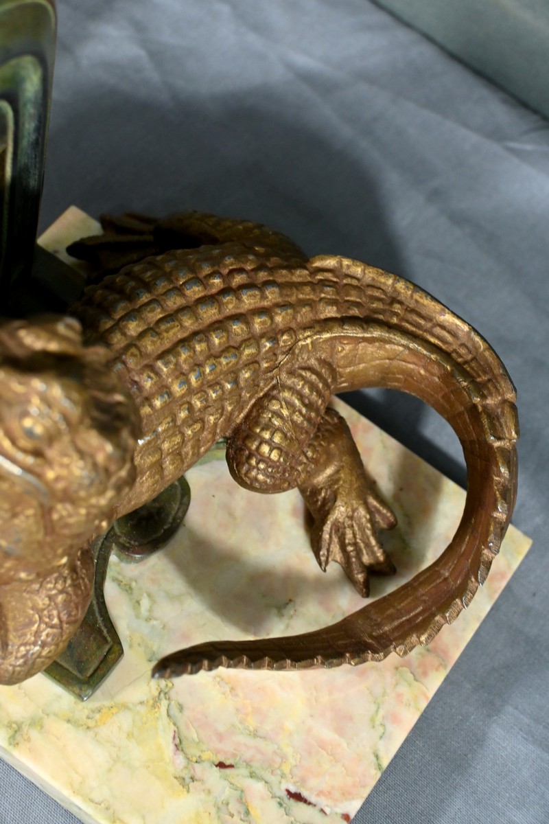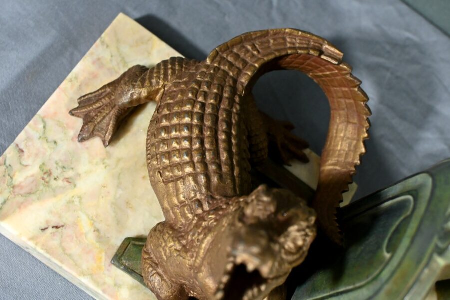 Les crocodiles, majestueusement sculptés dans régule étincelant, captivent par leur posture dynamique.