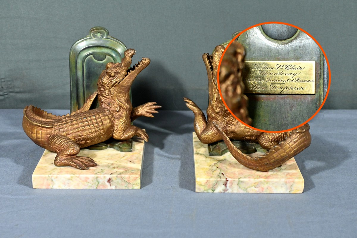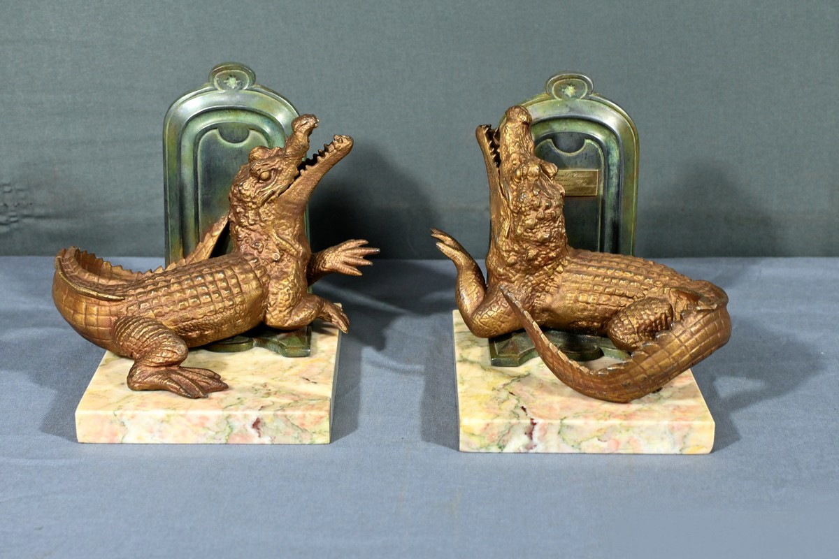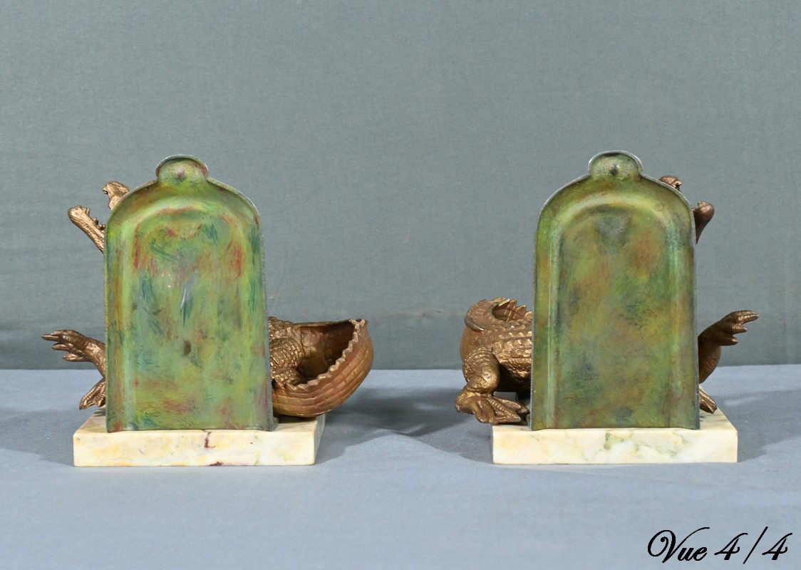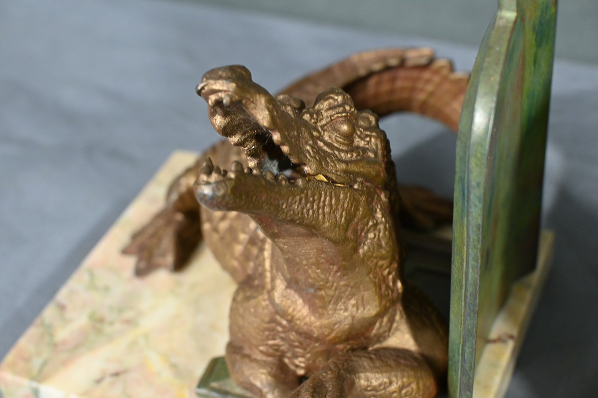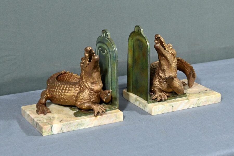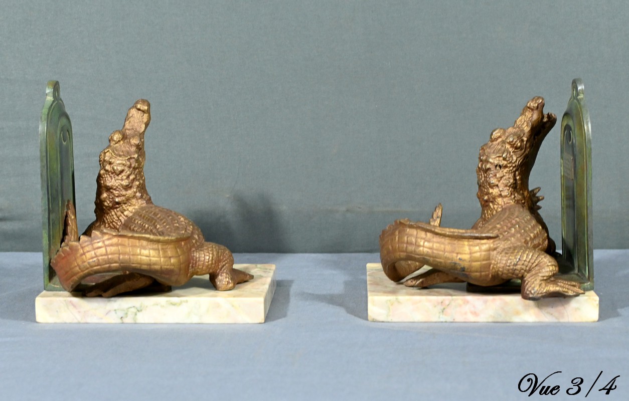 Les crocodiles, majestueusement sculptés dans régule étincelant, captivent par leur posture dynamique.