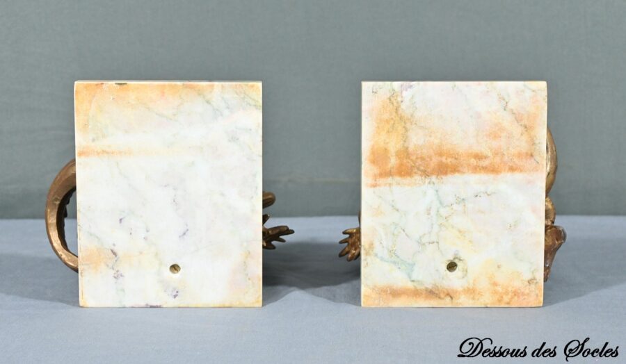 Chaque figurine repose sur une élégante plaque en marbre beige, offrant un contraste subtil entre la douceur naturelle de la pierre et l’éclat du régule.