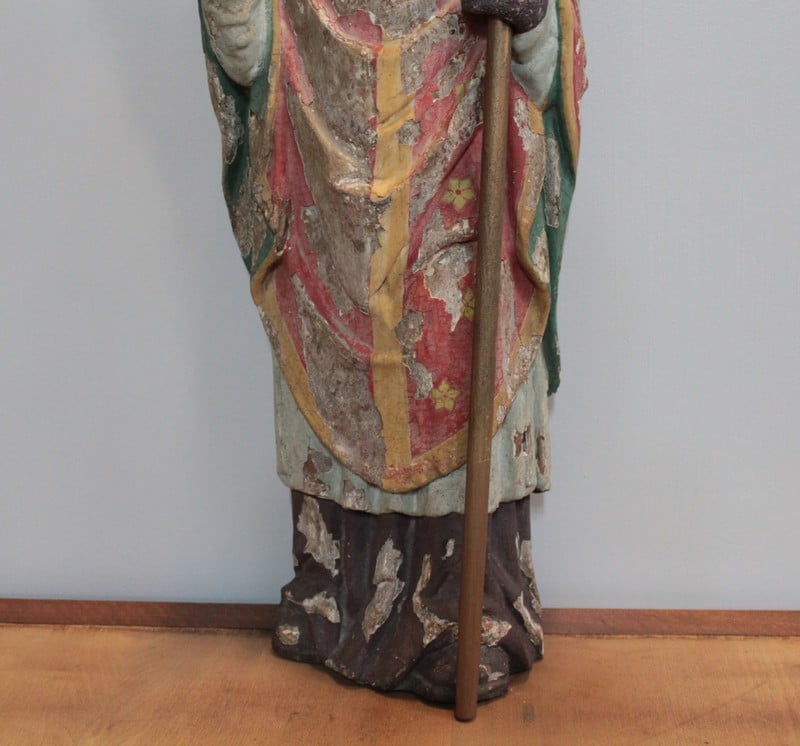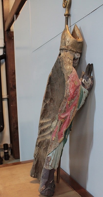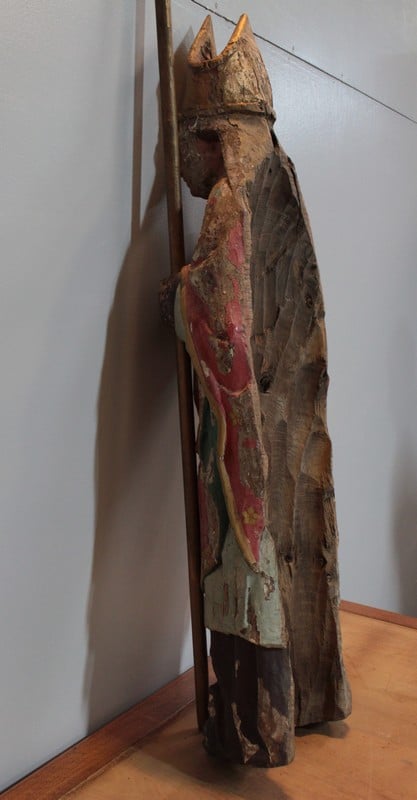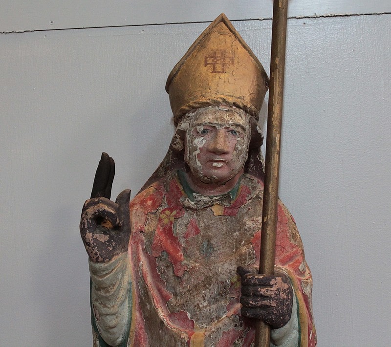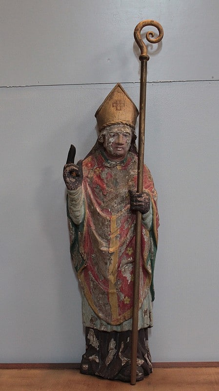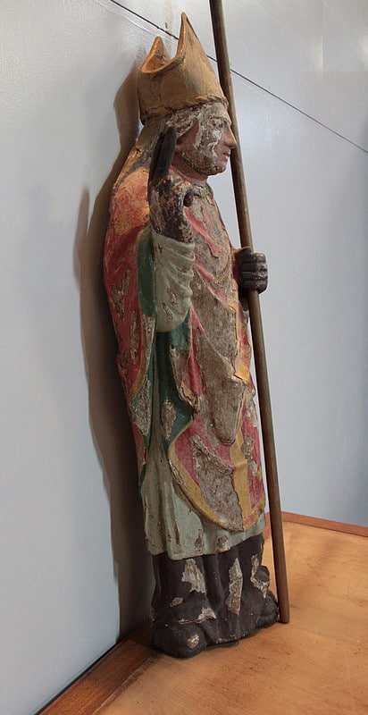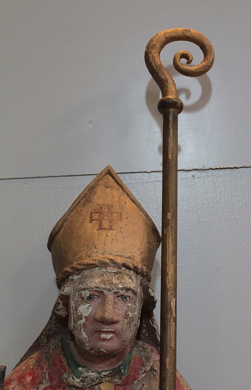 Statue de Saint-Nicolas en chêne polychrome. Il est coiffé de la mitre et tient la crosse dans la main gauche.