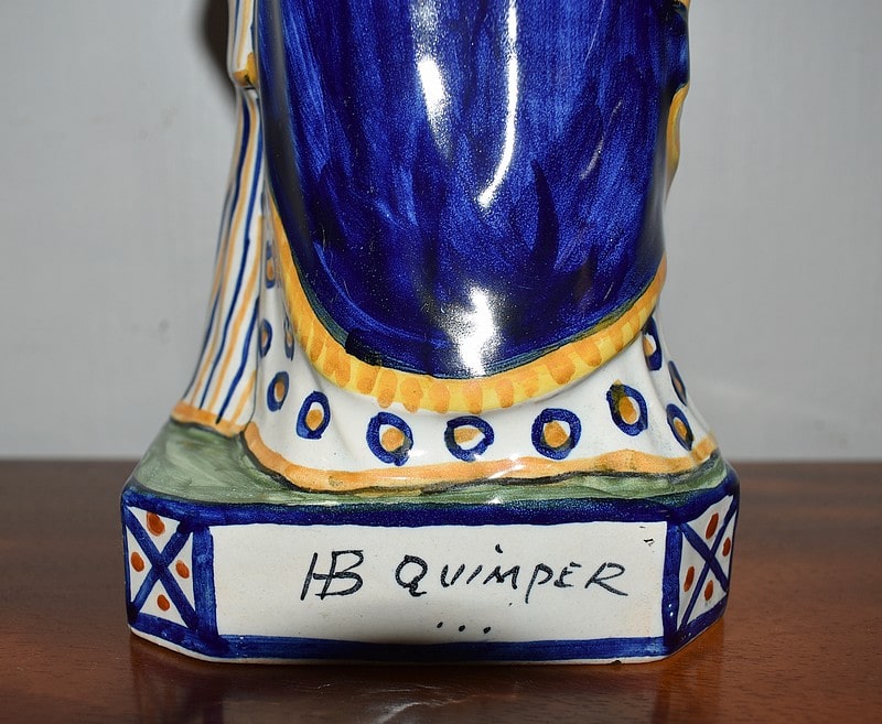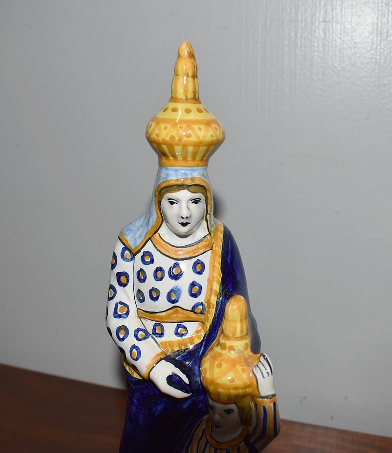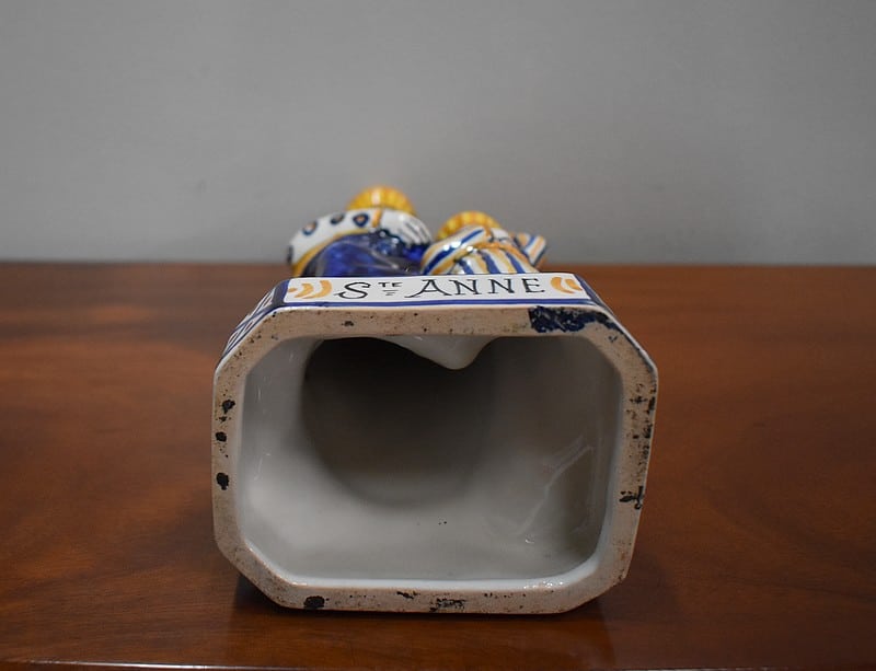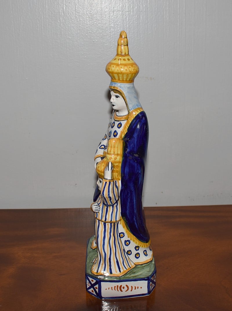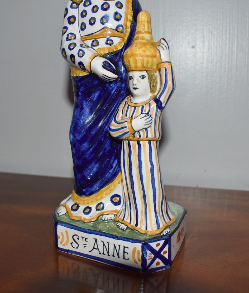 Statue de Ste Anne et de son enfant, Marie, en faïence de Quimper. Leurs vêtements sont de couleur bleu nuit et jaune sur fond blanc.