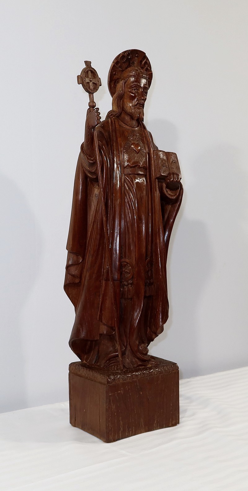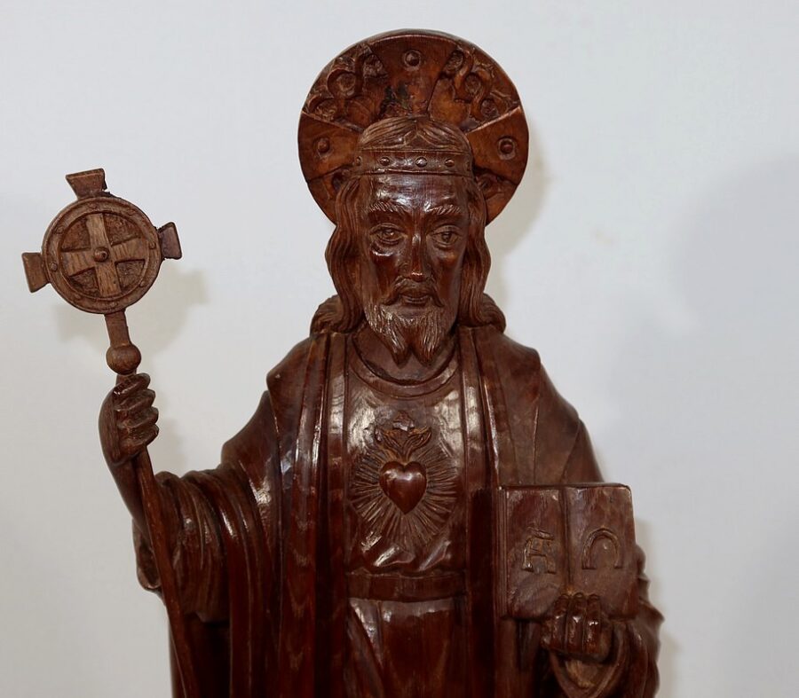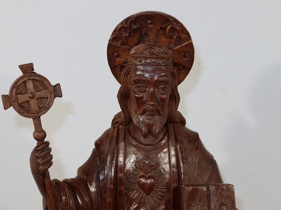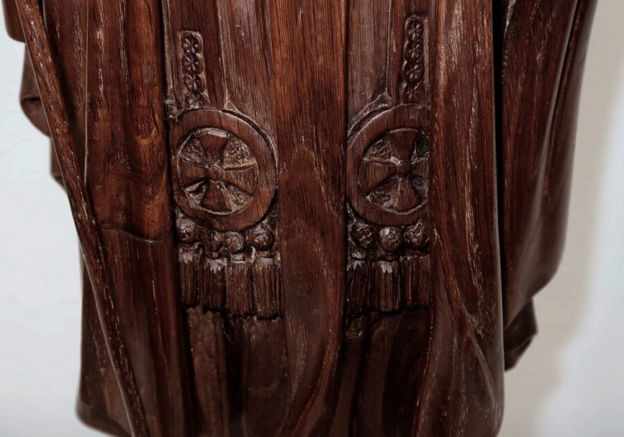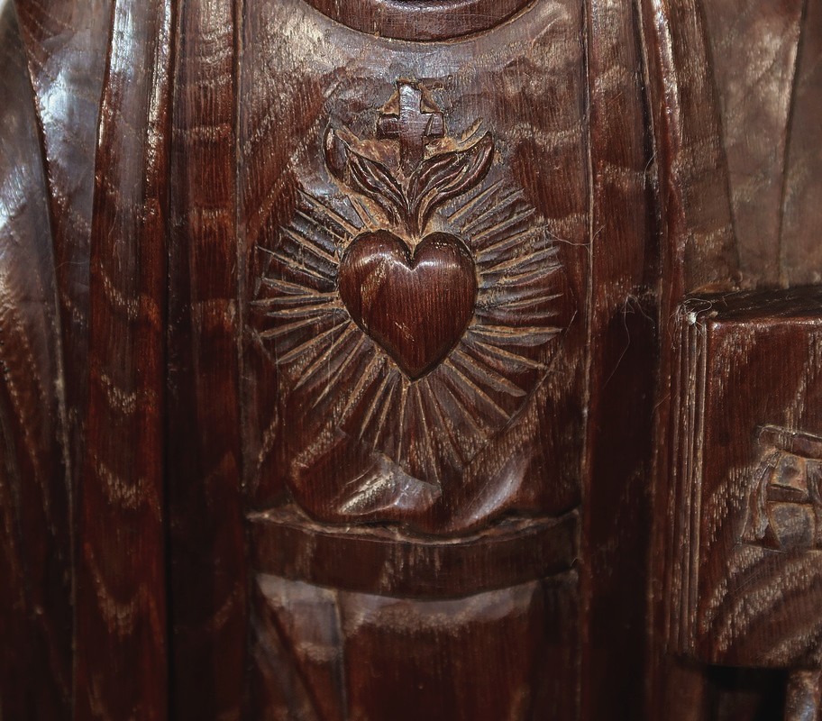 Sur sa poitrine est sculpté un cœur enflammé, le Sacré-cœur représentant la lumière divine et le sang du Christ.