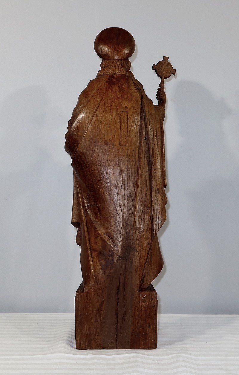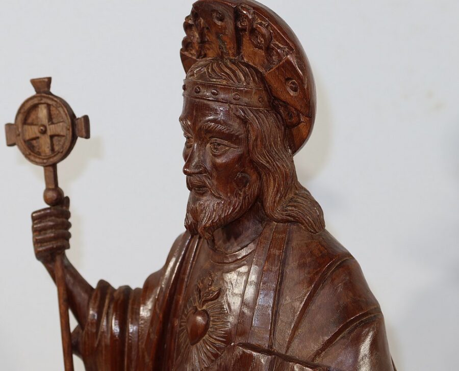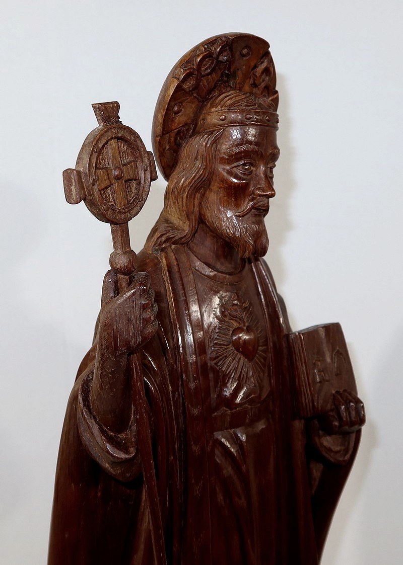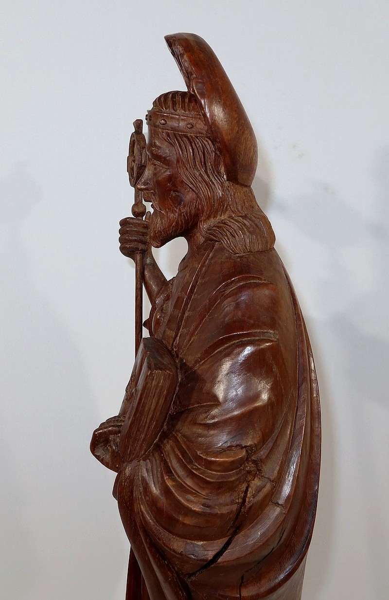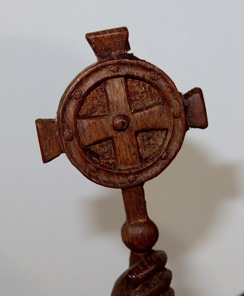 Dans sa main droite il tient un bâton cantoral, symbole d’autorité religieuse.