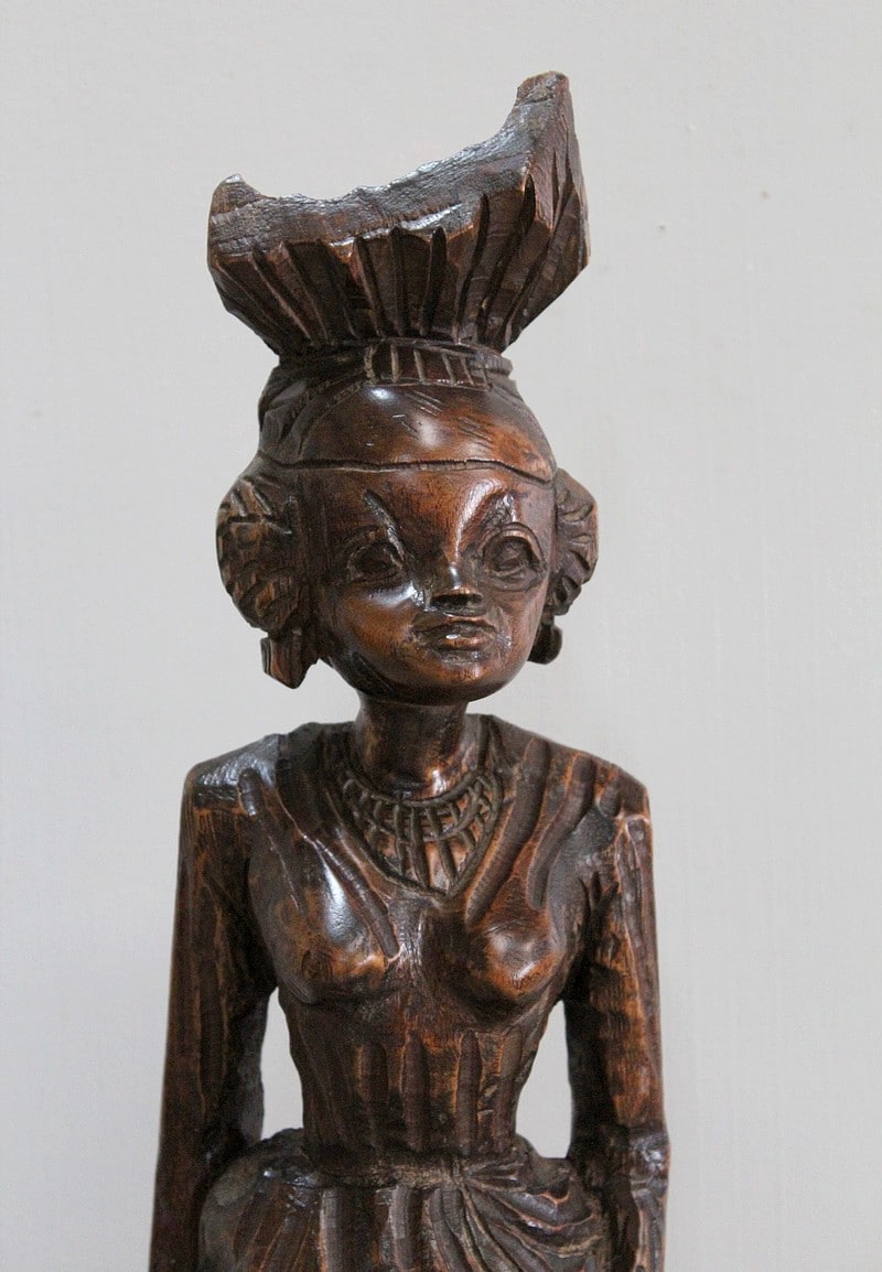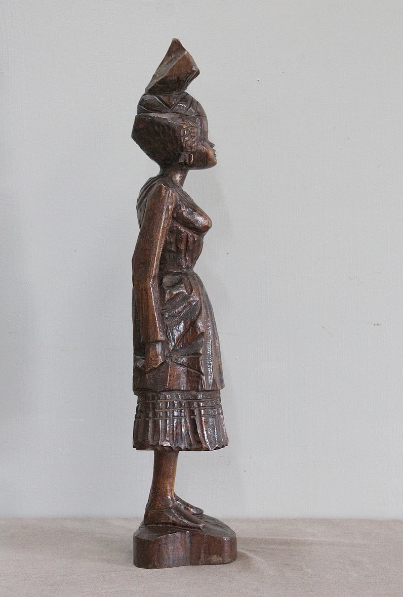 Elle est représentée debout, ornée d’une coiffe haute et d’un collier, elle est habillée d’une tenue à corset et jupons.