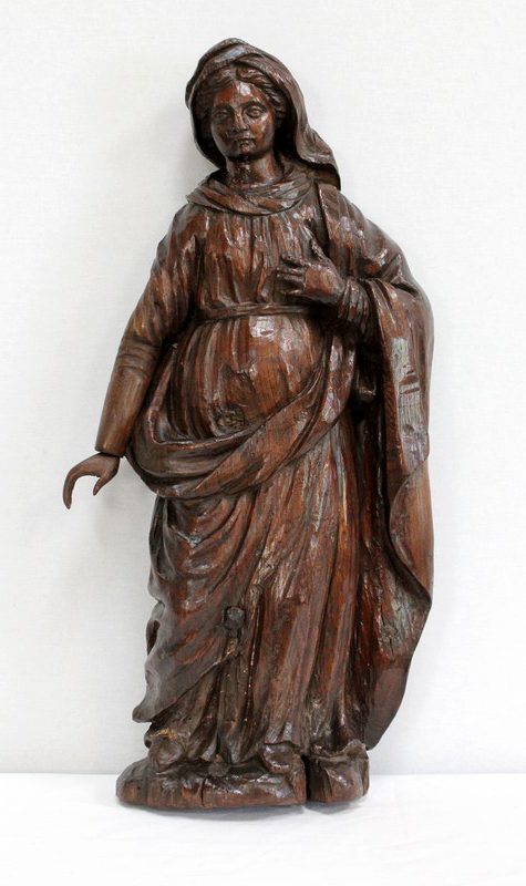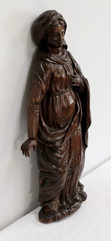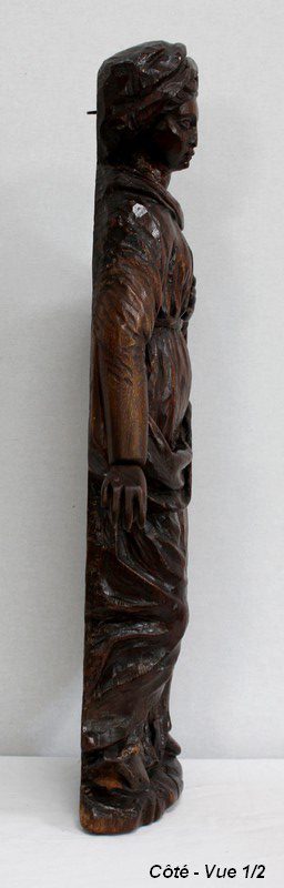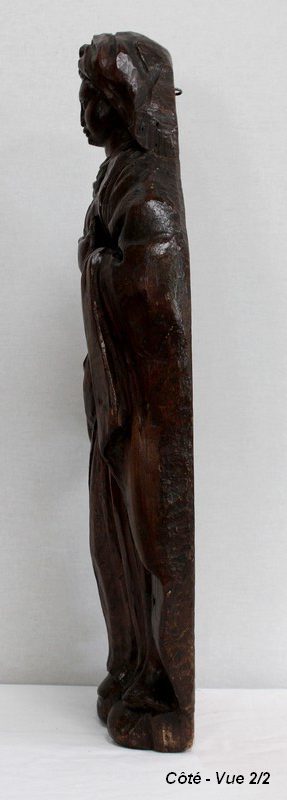 Ce sujet religieux, la main gauche posée sur le cœur, inspire la piété. Son regard doux et ses traits mélancoliques semblent nous dévisager à travers le temps. Sa coiffe et son drapé, sculptés habilement, offrent une impression de mouvement à l’ensemble. On notera la présence d’un anneau sur la partie arrière, facilitant sa fixation.
