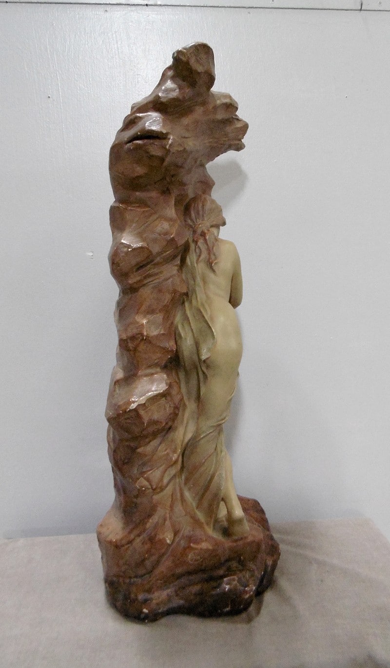 Statue en plâtre patiné ‘La source’ représentant une femme à demi-nue, appuyée contre la roche et prenant de l’eau à une source.