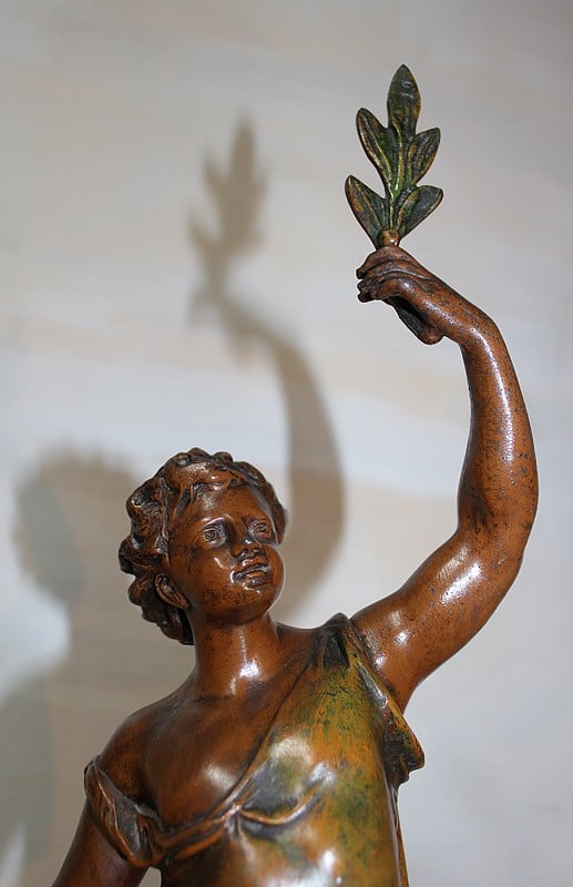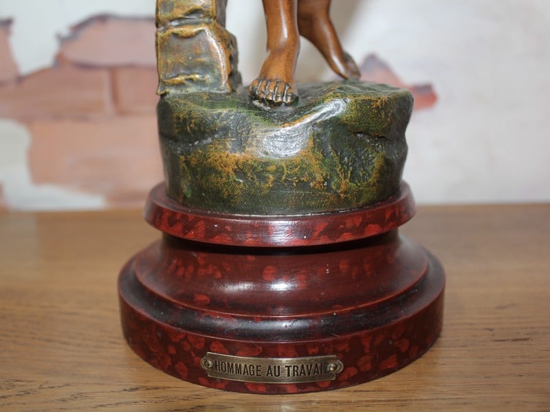 Statue en régule à patine brune sur socle en bois peint façon marbre , elle est intitulée ‘Hommage au Travail’ et est signée Ch. RUCHOT.