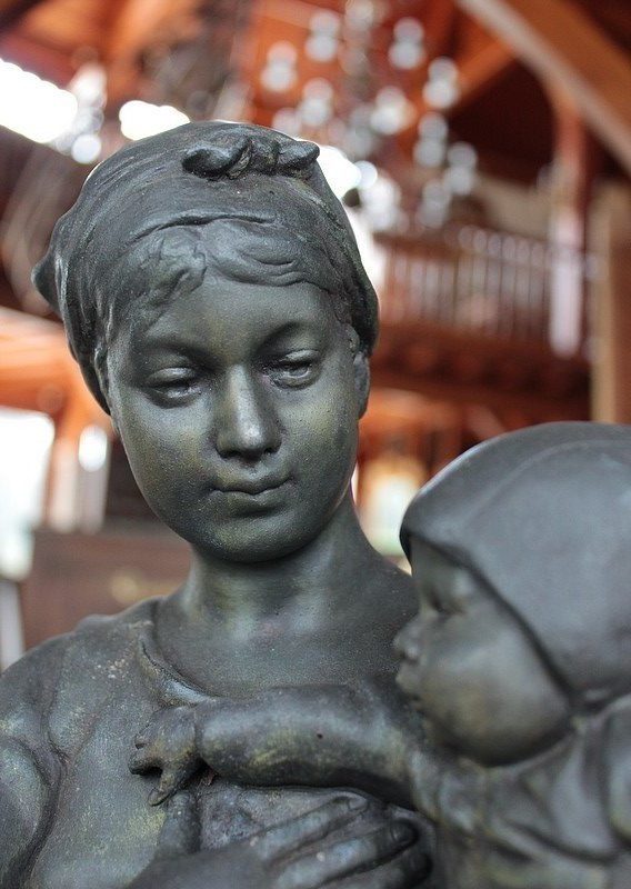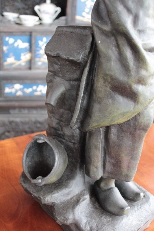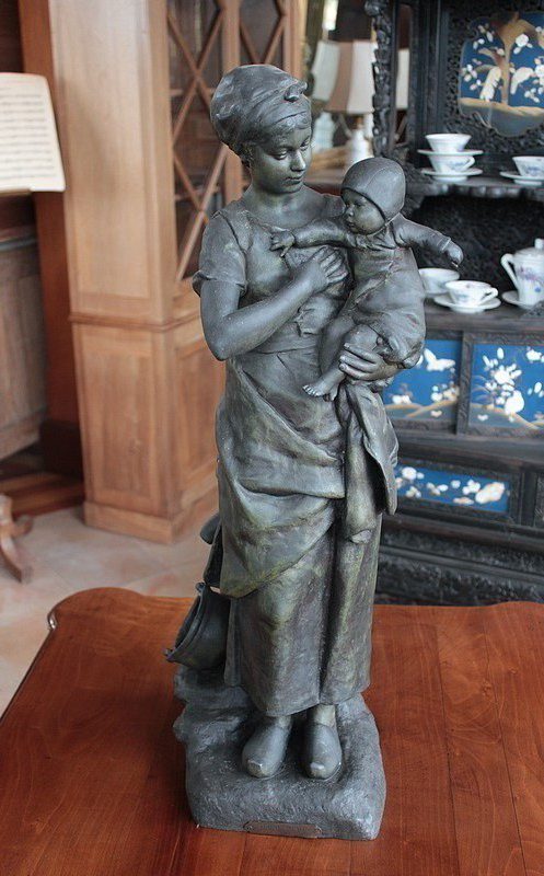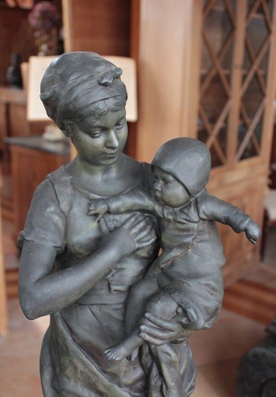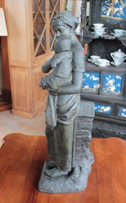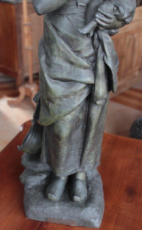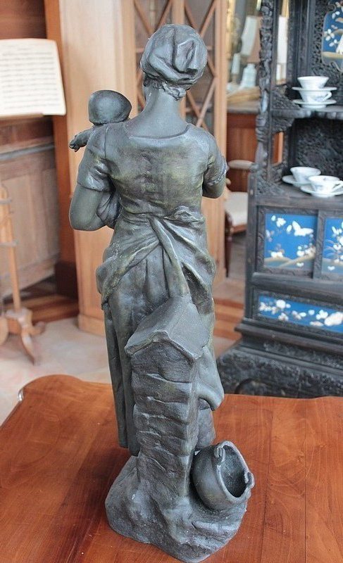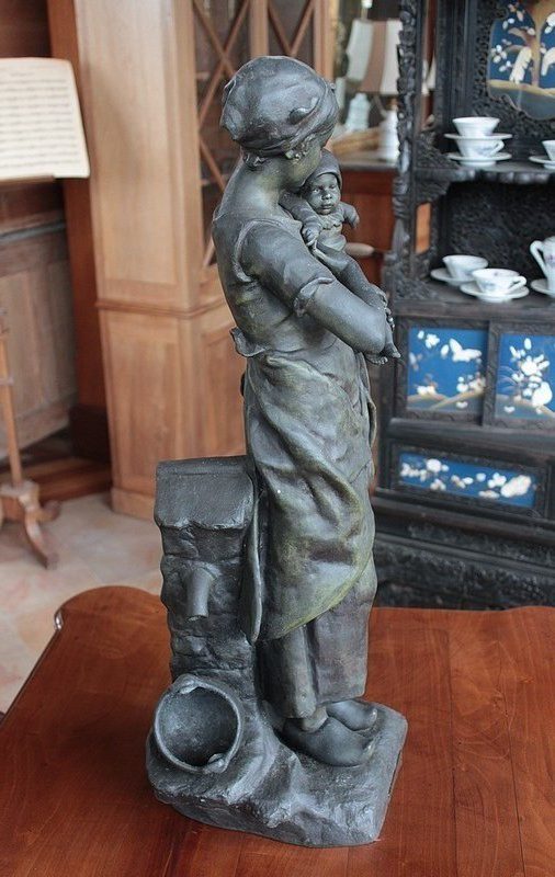 Important Régule à patine verte intitulé « Jeune Mère » par Clément Steiner représentant une jeune paysanne en sabots tenant son enfant dans ses bras, sa main posée sur le cœur. Elle tourne son visage bienveillant vers son bébé et esquisse un sourire. Derrière elle, une fontaine est représentée. A l’avant de la terrasse, une plaque est fixée et annotée » JEUNE MERE par L. STEINNER « .