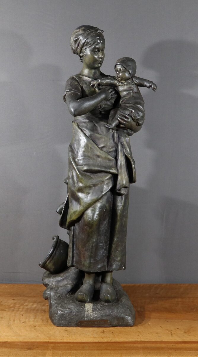 Important Régule à patine verte intitulé « Jeune Mère » par Clément Steiner représentant une jeune paysanne en sabots tenant son enfant dans ses bras, sa main posée sur le cœur. Elle tourne son visage bienveillant vers son bébé et esquisse un sourire. Derrière elle, une fontaine est représentée. A l’avant de la terrasse, une plaque est fixée et annotée » JEUNE MERE par L. STEINNER « .