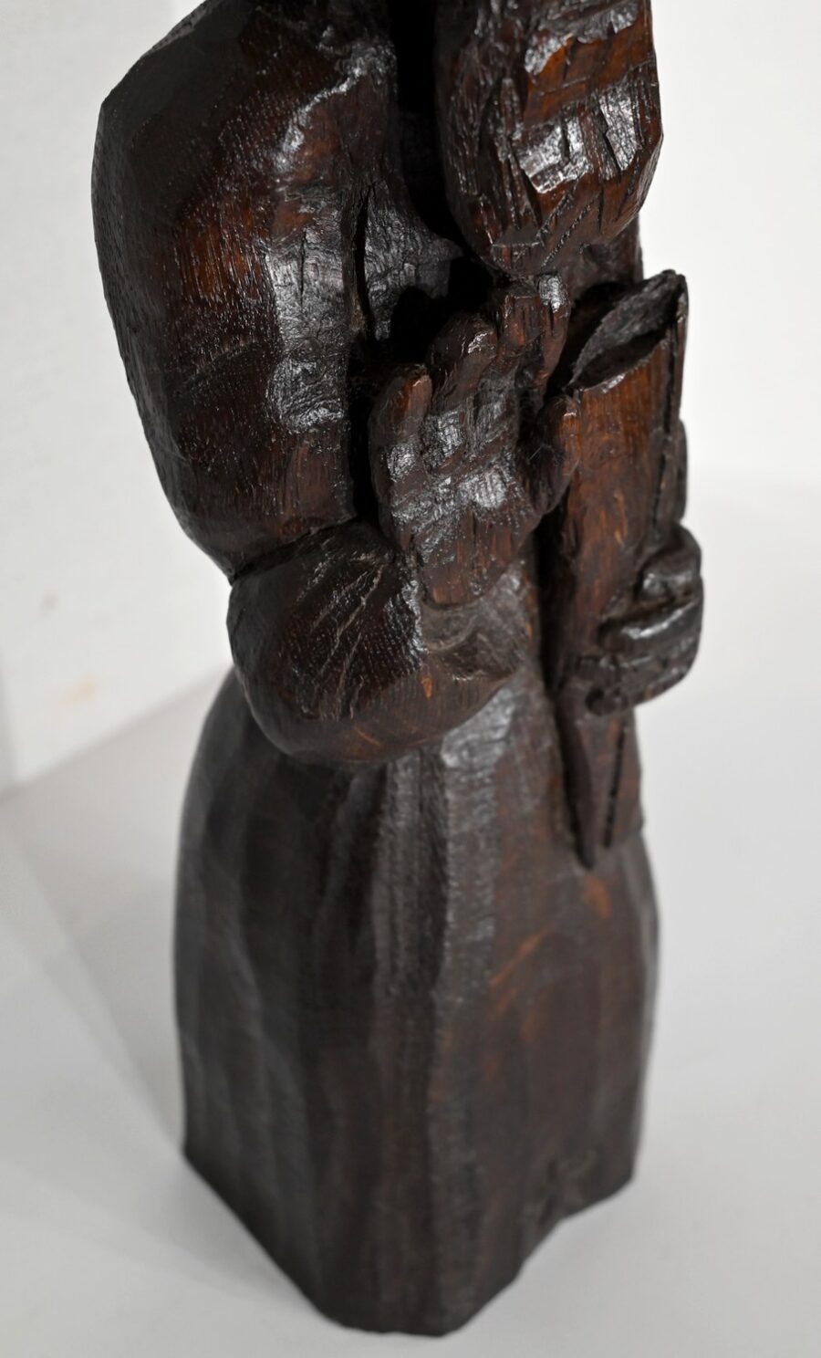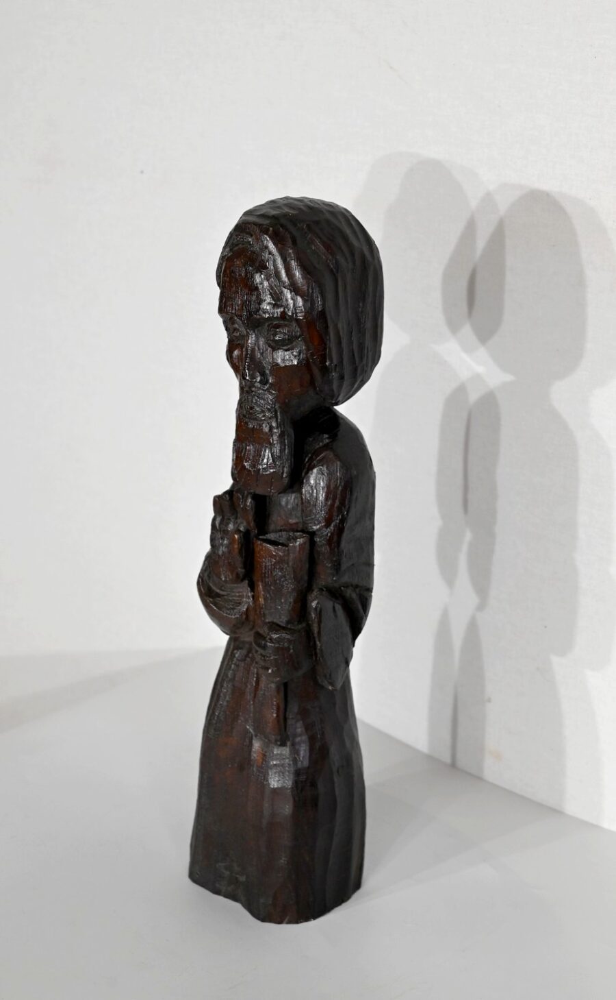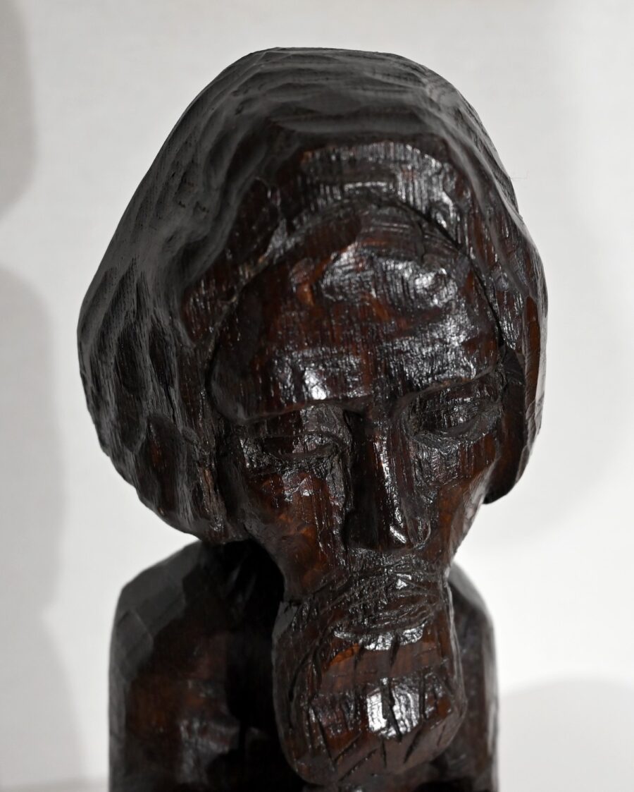 Statue en chêne représentant un homme religieux avec une chevelure mi-longue, le visage anguleux, portant une barbe et vêtu de son habit.