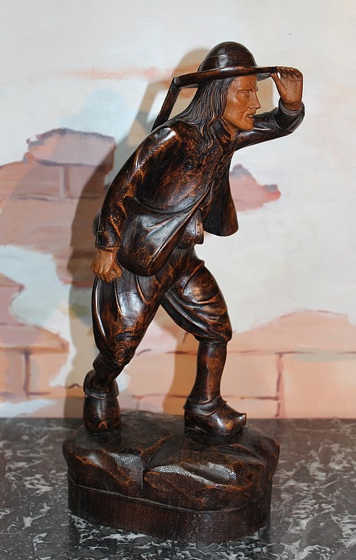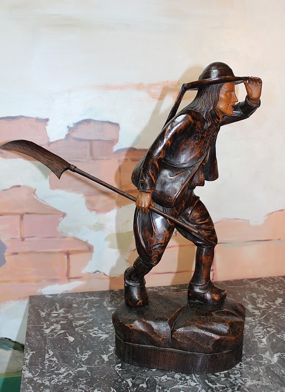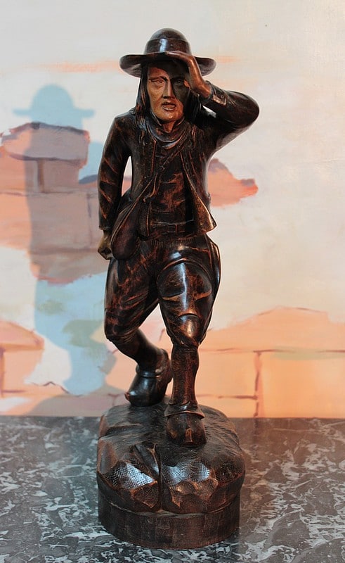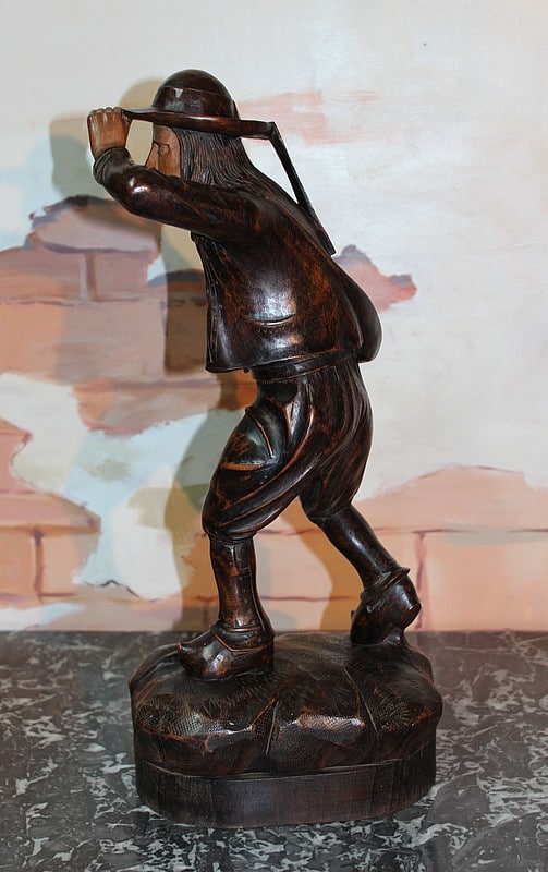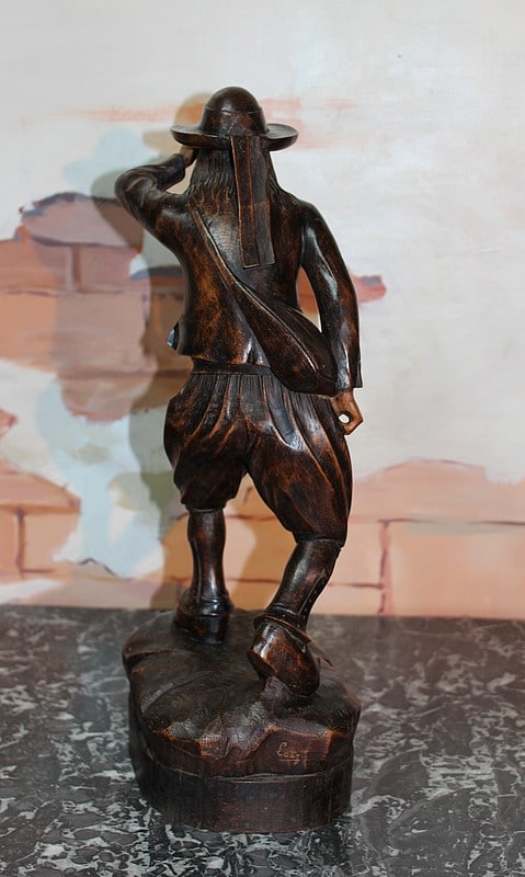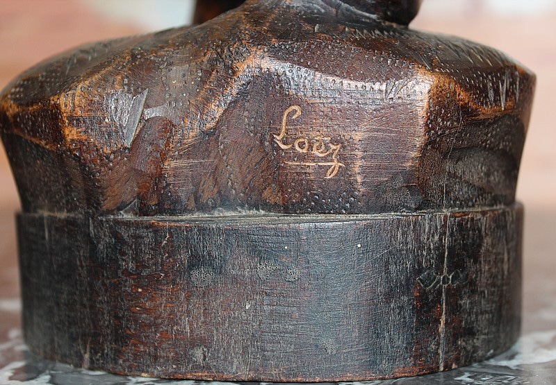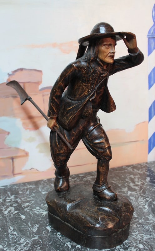 Sujet en bois sculpté et teinté représentant un Chouan aux aguets, tenant une faux à la main droite. signé ‘Loëz’.